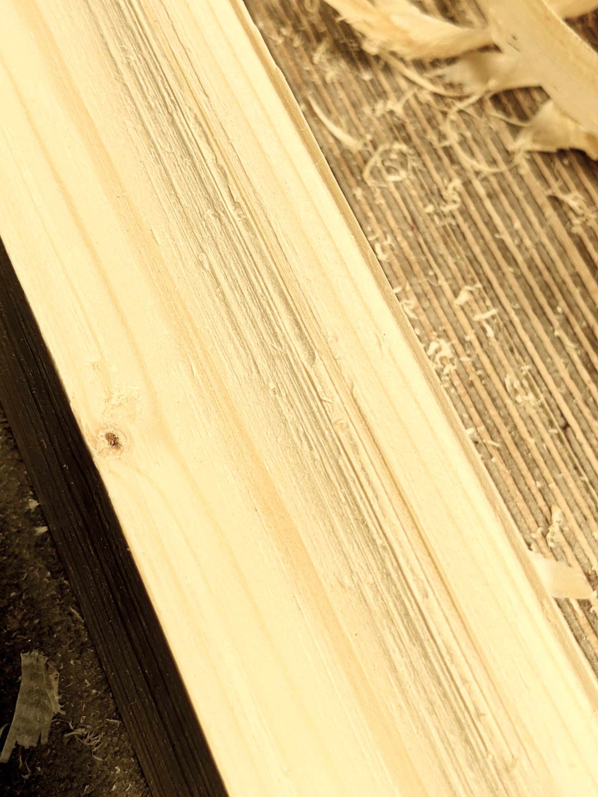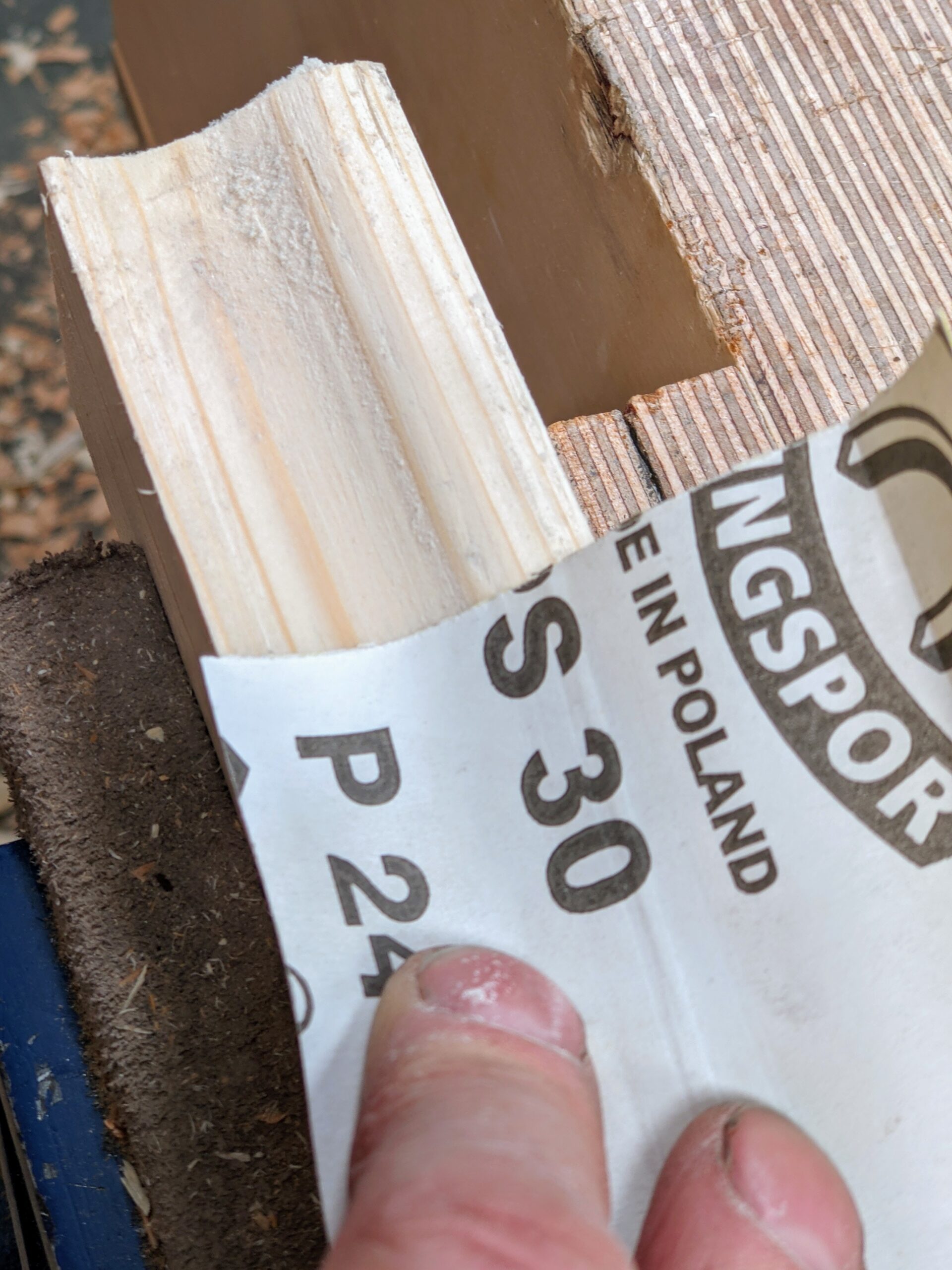 After examining my plane for various telltale signs of use and once my plane was newly set, I planed down a section of spruce to full depth and the profile was good but with 'tramlines' parallel to the length. I only needed a few inches to work the profile of the cutting iron with and I used abrasive to remove the lines and grooves further.