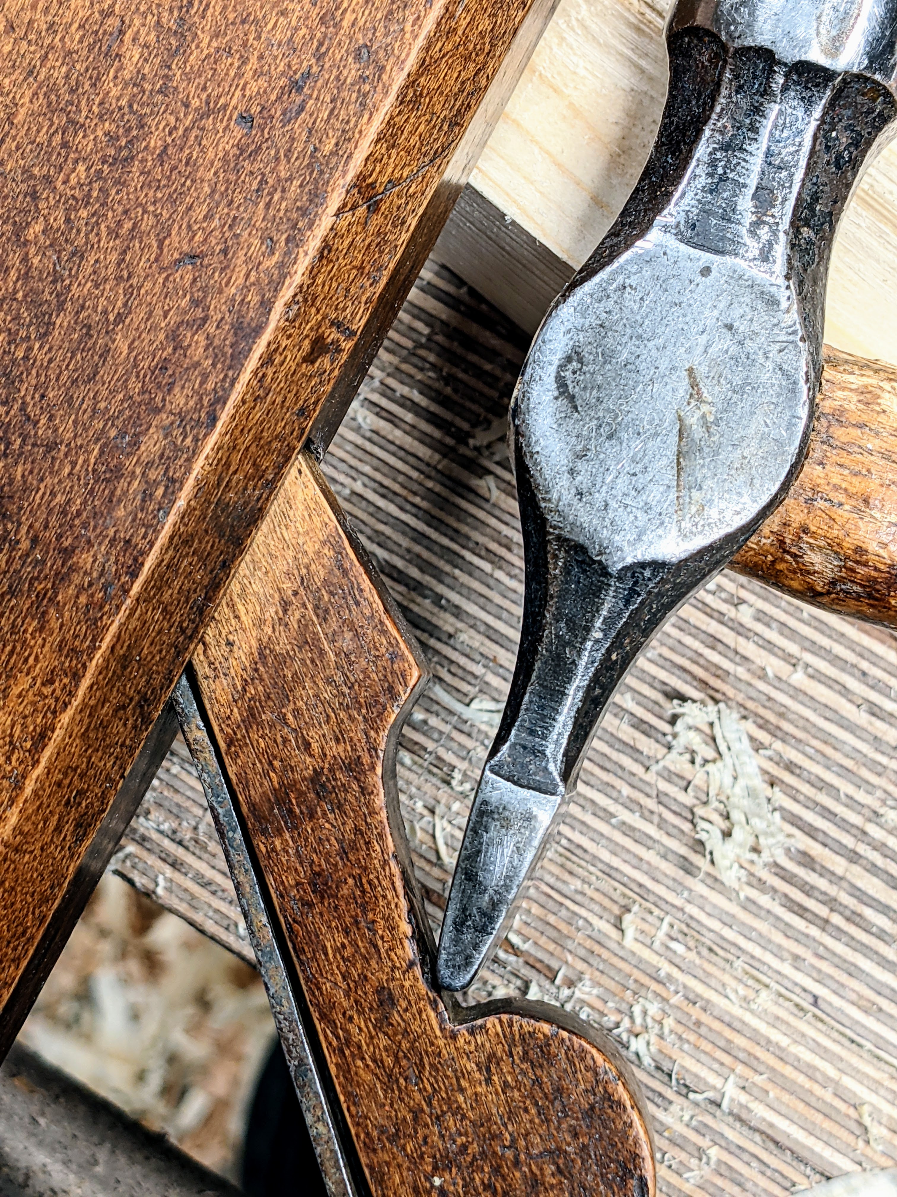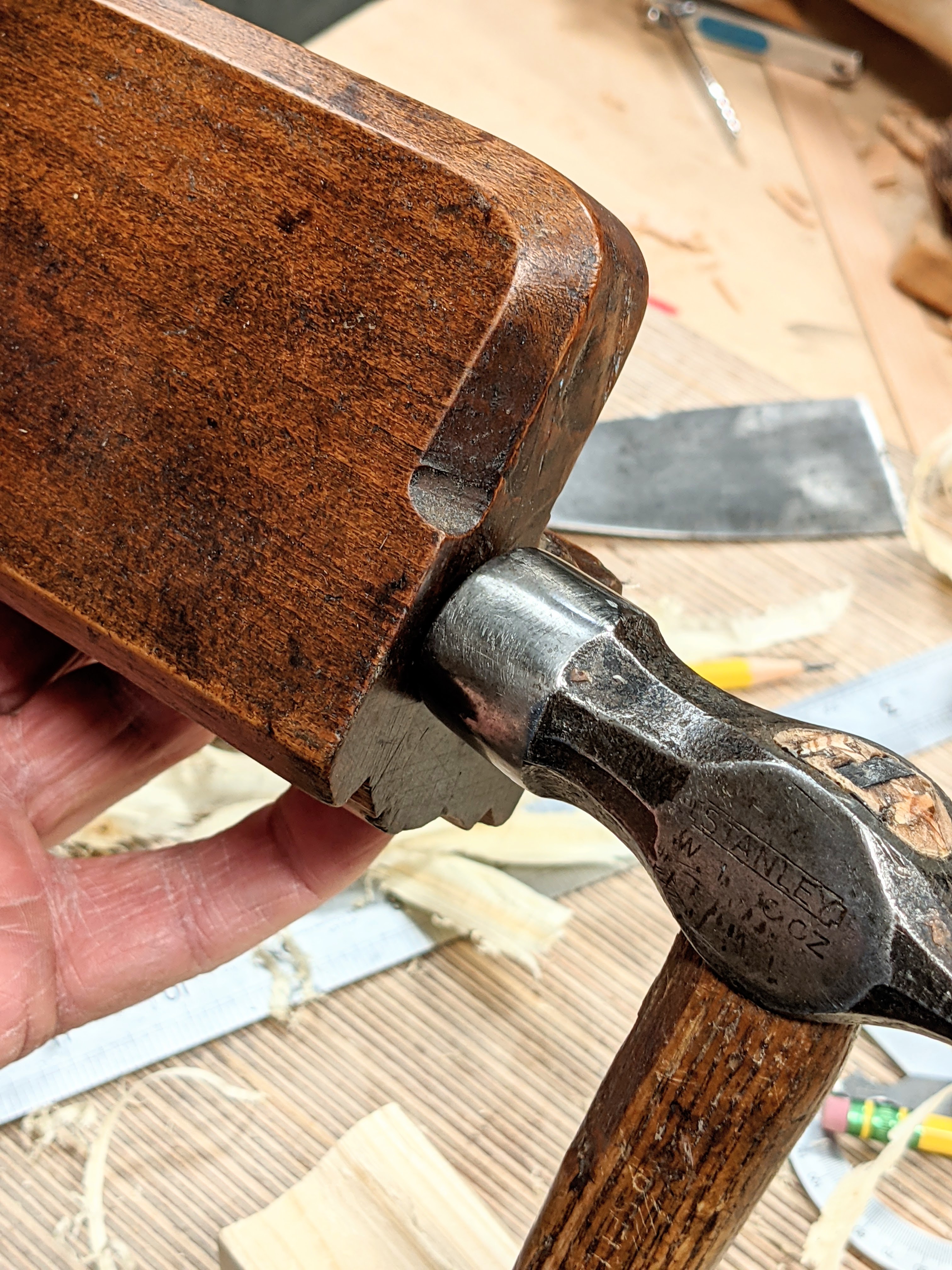 I look to different points on the facets of the plane to see where the greatest impacts have been used with regularity from hammer blows. Bench planes and moulding planes were always adjusted with steel or brass hammers and rarely was wood used. Why? Finding the centre of percussion is much easier and less awkward when delivered by metal hammer heads. Stanley Warrington hammers, 10-12 ounce, with their slightly domed hammer faces are about as ideal as it gets. Also, remember, driving the cutting iron from the top end of the iron and down into the throat can and will help to dislodge an overly jammed wedge and plane iron. Generally, on a well cared for and well-used plane, the best approach for retraction is striking the heel of the plane square on.