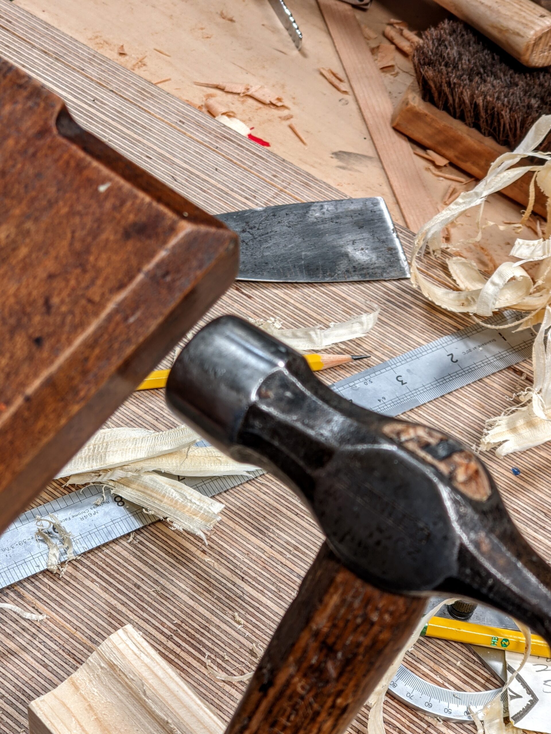 The hammer serves to shock the plane to loosen the wedge and the cutting iron in the main body of the plane. This can be to remove the iron for sharpening, unclogging jammed shavings and adjusting the depth of cut. Striking the heel retracts cutting iron in any wooden plane. You can also strike the top front area near to the corner and this will often allow a finer level of adjustment. Striking as squarely as possible to the heel end of the plane usually shocks the wedge and iron loose with two or three firm blows. Setting the depth is by trial and error and the amount of movement depends on the actual plane as they will each differ from one to the other. To set the depth of cut means that after taps and tightens you must test the plane on the wood each time and adjust as necessary. With time and practice, this adjustment becomes second nature and effectively fast. There is a system to it. In some cases, men used the bench end and sides to make minor adjustments with the hammer being used for the wedge only.