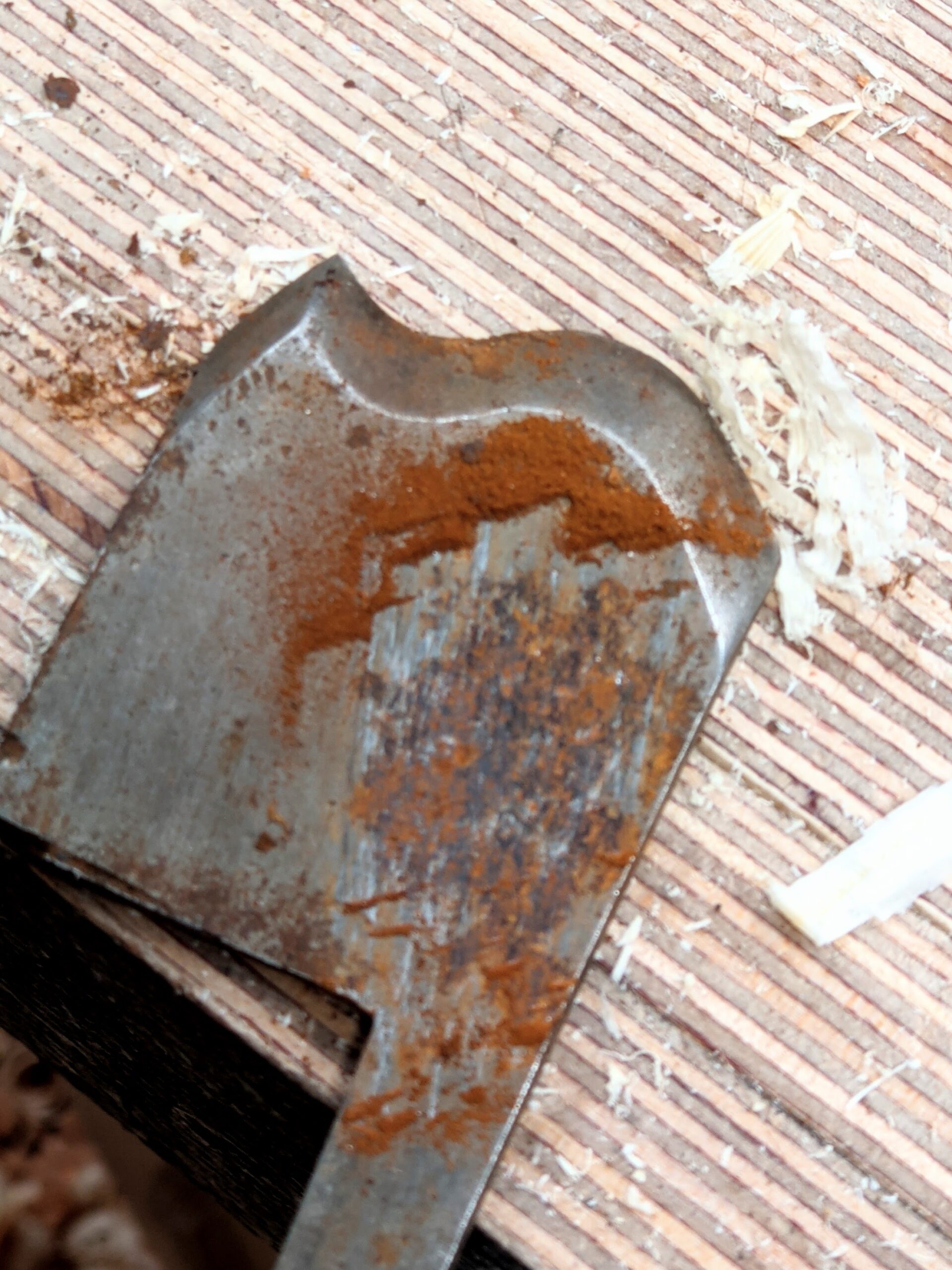 Rust on the back face prevents the shocking of the cutting iron along the bed angle, against which the cutting iron is registered and must be allowed to travel up and down using the hammer-tap adjustment system. Scraping off the rust is quick and effective and a short wire brush works well for cleanup. A wax inhibitor will prevent the rust from further developing and, of course, the use of any tool is the best rust prevention you can have. I have no issue using abrasive paper for smoothing off the surfaces after the bulk of the rust has been removed.