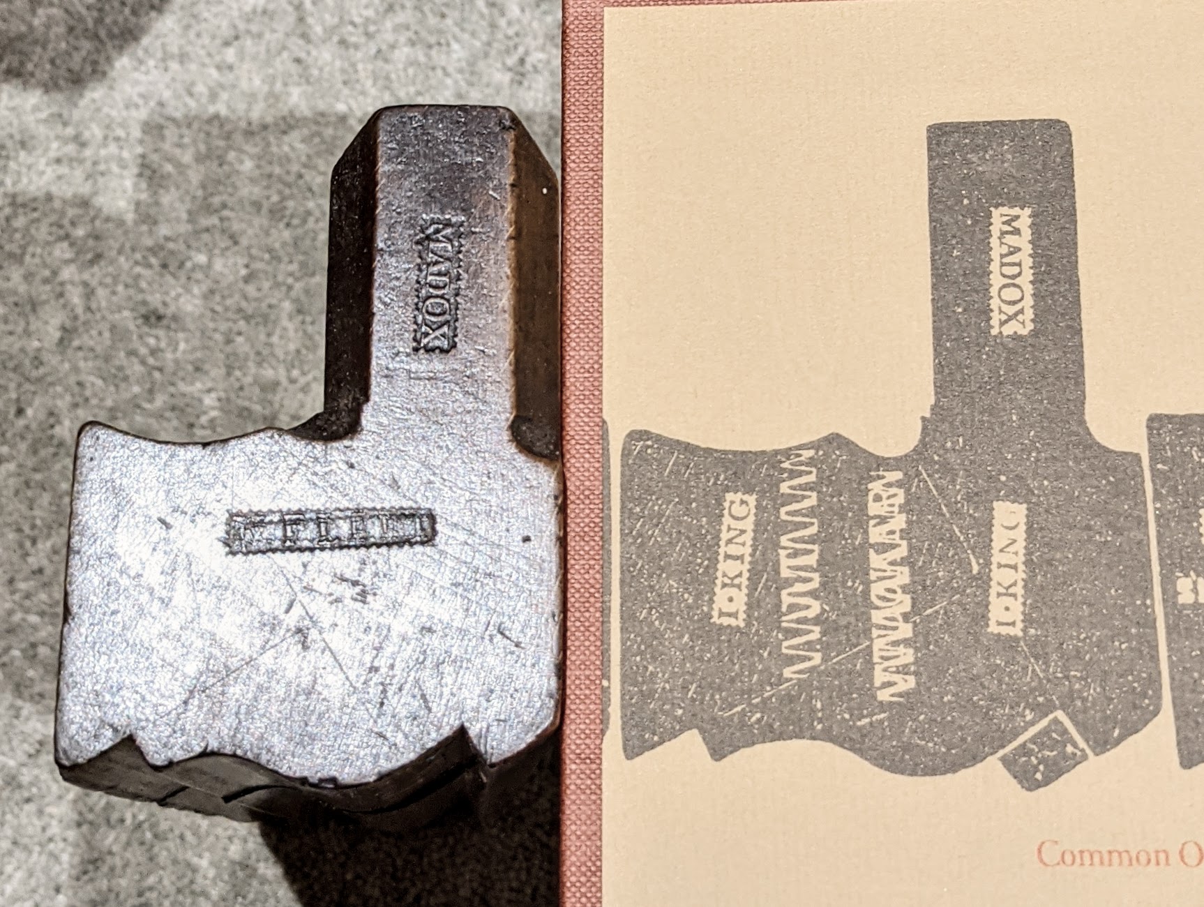 I look first for shavings wedged or jammed anywhere in the plane. This can be in the throat, behind the cutting iron, in the wedge itself, places like that. I look for hammer blows registered on the plane to see which methods the user preferred for removing the wedge or setting the plane iron to a shallower depth. This hammer-tap method was the only way to really set the cutting iron or remove the iron for sharpening. It sounds primitive, but it is very fast and accurate once you are familiar with the planes you use. As with many wooden planes, including bench planes, some users loosened the cutting iron and wedge by hitting the toe more than the heel and some used the underside of the wedge to tap the wedge out, often with the flat of a Warrington hammer. The least damaging point is the heel of the plane and the least damaging hammer for dislodging wedges is the Thorex 712 38mm version I recommend for joinery work, chisel chopping and assembly.