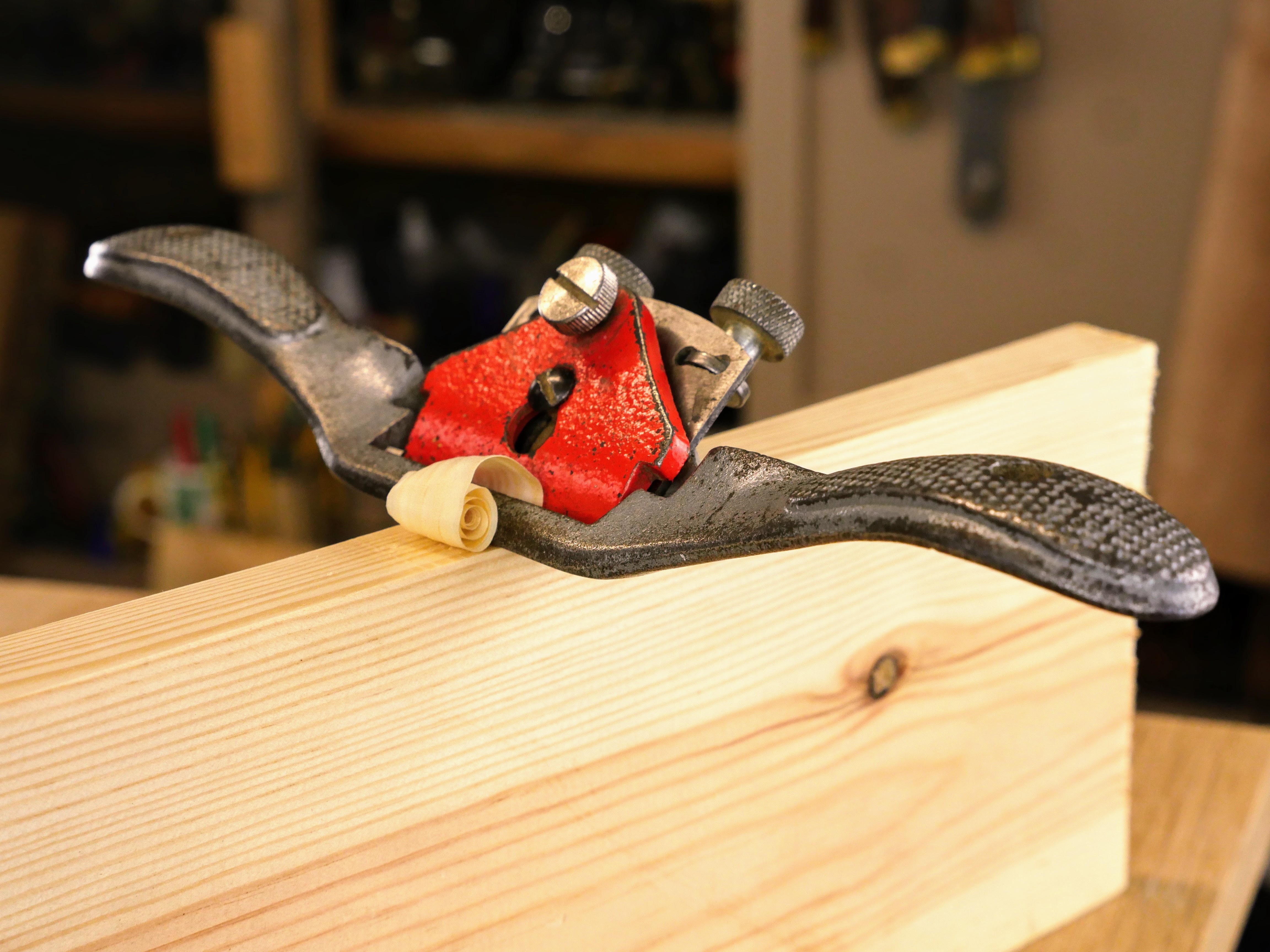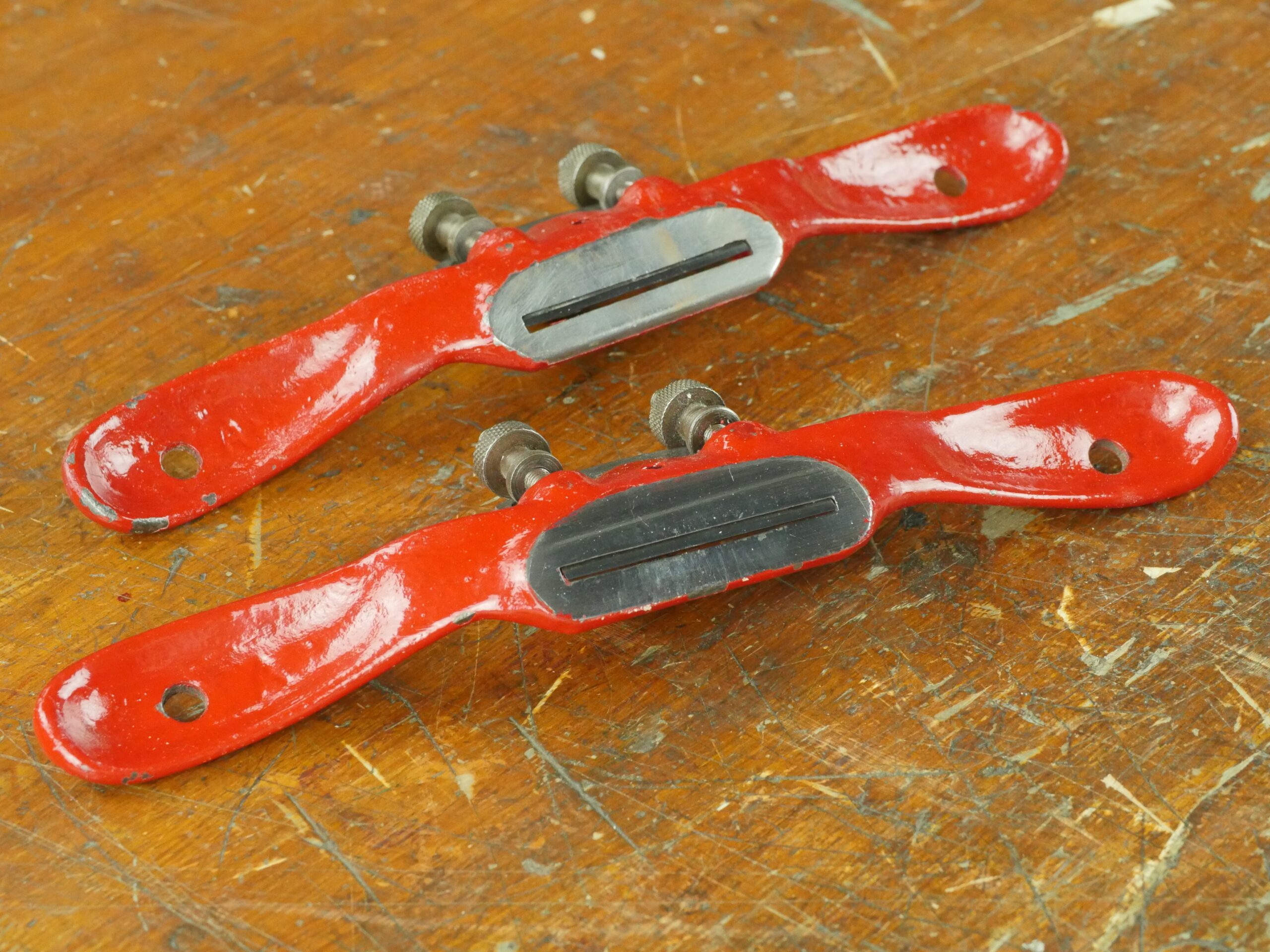 A spokeshave was a first tool for each of my boys as they 'came of woodworking age' and that was quite young at three years of age but it was always with full-on supervision. I would say that five is a good age for most children but you as a parent will be the better judge according to their personalities, ability and maturity. My granddaughter was not yet three when `I introduced her to her first spokeshaving task of making a spatula. It's a hands-on-hands to get them going and the attention span wanes in seconds until they see that shaving magically appear from the spokeshave throat. These restored red versions below, vintage Marples ones, somehow became hers from then on.