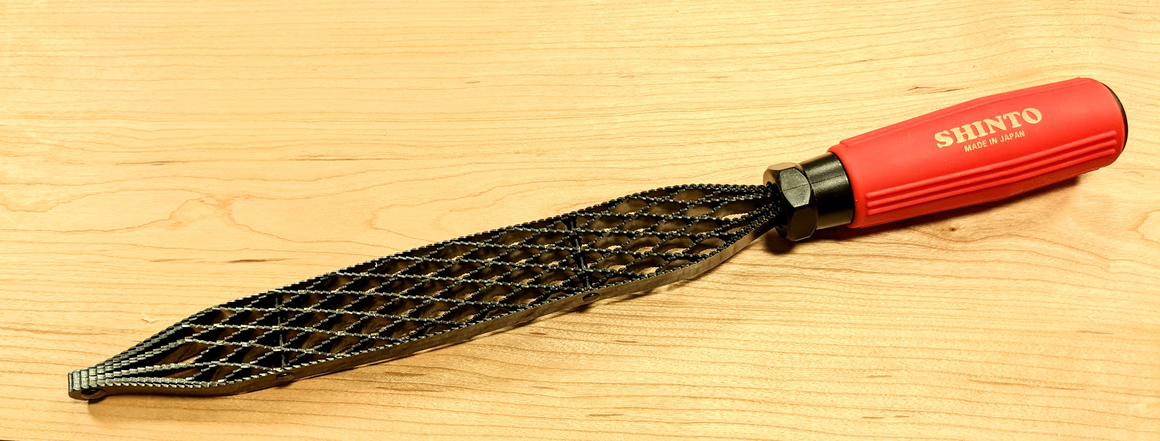I think that the Shinto rasp has earned credit over the past couple of years with me. The amount I use this tool is the equivalent of 30 years in amateur realms and it is still holding up very well -- indeed it's as close as you can get to a lifetime shaping tool that cannot be resharpened. Also, compared to a bona fide rasp of European origin, it works as well for 95% of shaping work though if you are used to a good quality rasp you will always know that there is a difference between a hand made or hand-stitched rasp and one of these. Truth is, most French-made rasps are second to none and because they are so good they can be prohibitively high for many woodworkers and especially as a present for a younger aged child who might not stay with it. The Shinto costs a mere 15-20% of the cost of a good rasp, a relatively low-cost for a tool that works so very well with lasting qualities built in too. Prices vary between sellers, so shop around. They will cost between £20-30 depending on the length. Two blade lengths are available 11" (270mm) and 9" (230mm) roughly. Well worth the money, these tools work extremely well, and with the two-sided coarse and fine you get two rasps in one. Both sizes are handy too. The one I have thoroughly tested is the 11" version. Downside-info is that they have not come out with a round version yet. That would be most handy, but as most rasp work is done using a flat face, this one works very well for us. Check out the prices as they do vary considerably with some suppliers charging up to 30% more than others. Amazon was not the cheapest!