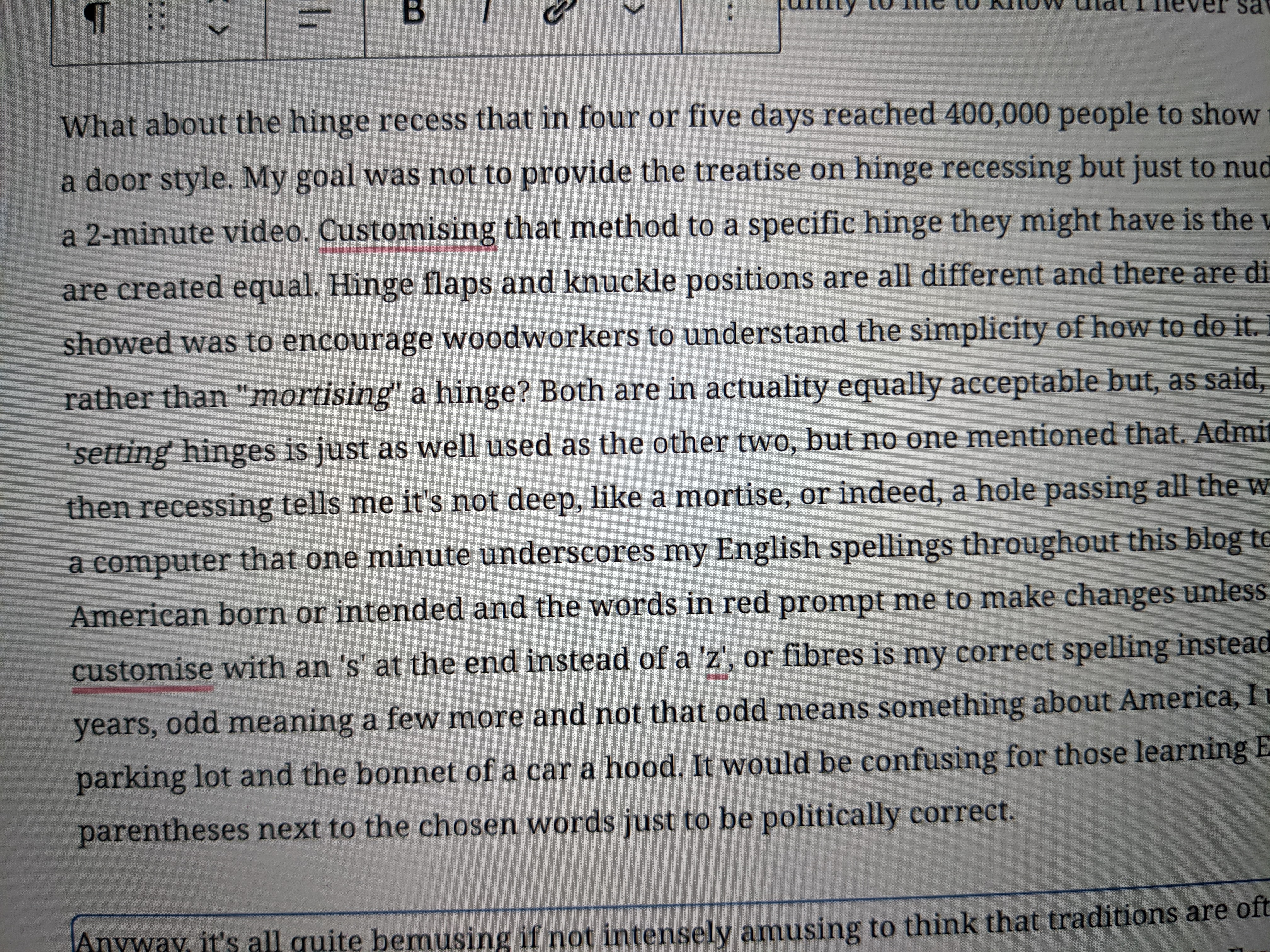 What about the hinge recess video I posted on my FB that in four or five days reached 400,000 people to show them how simple it was to recess or mortise or set a hinge in a door style. My goal was not to provide the treatise on hinge recessing but just to nudge people to perhaps practice recessing a hinge as shown in a 2-minute video. Customising that method to a specific hinge, they might have, is the watchers' next task to work out because, well, not all hinges are created equal. Hinge flaps and knuckle positions on hinges are all different and there are different ways to make the hinges look right. But the method I showed was to encourage woodworkers to understand the simplicity of how to do it.