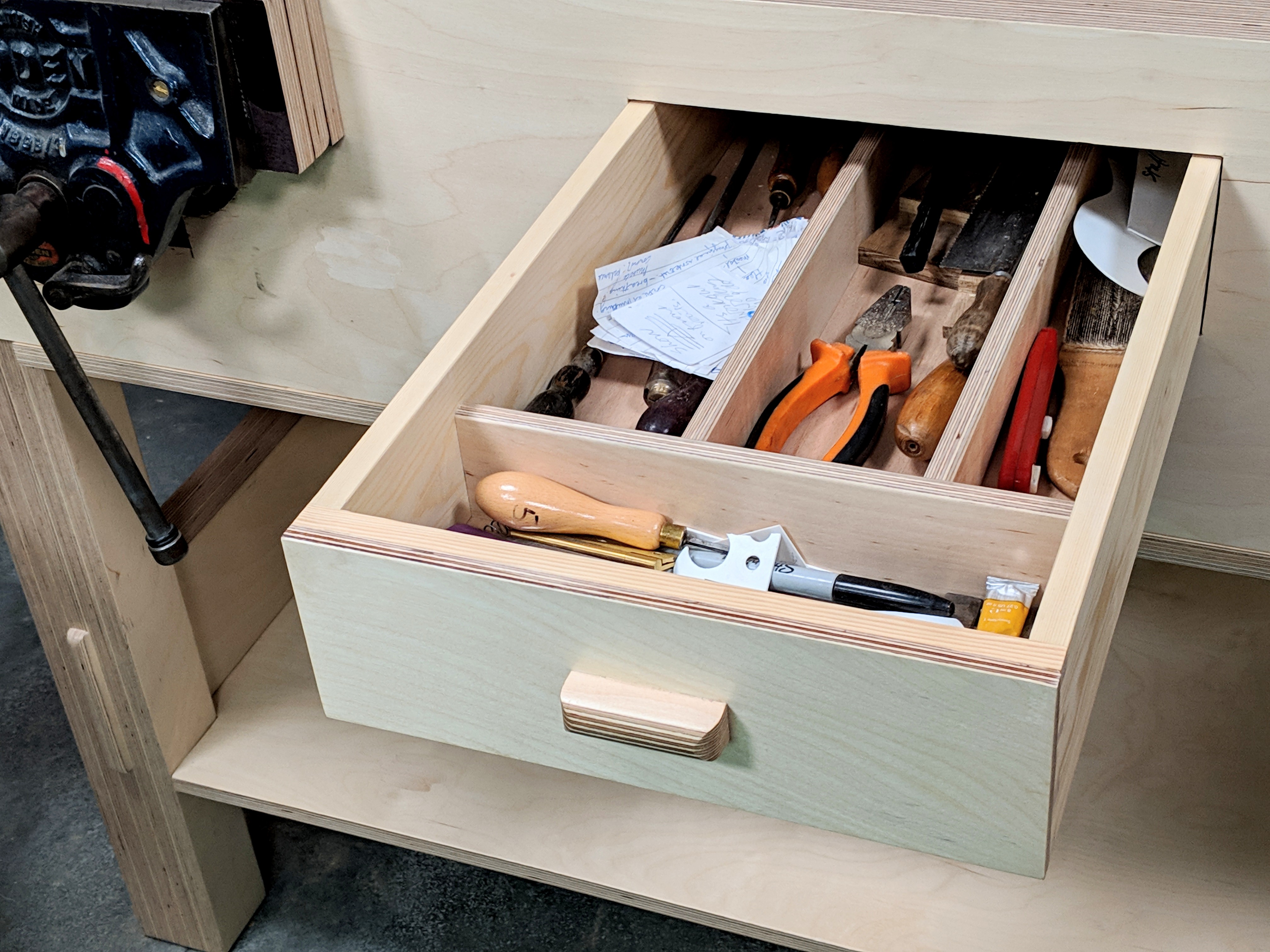 My plywood workbench did the same thing and punches above its weight in the daily use in my workshop. I am not into pretty workmanship (though I appreciate it most of the time and there is a place for it) so much as functionality first and by that the fullest of attraction. Truth is this, I want a bench I can gouge by accident when I slip with a saw or a chisel and one I can drive a nail into to describe an arc for a rocking chair rocker. If I spill paint, oil, glue or whatever, I don't want to panic. I just want to wipe up the spills and get back to it. So here is a tool that parallels my intent to simplify and counter pretentious snobbery yet something that truly works. Will plywood hold up long term? Probably, possibly! Does it matter that much? I expect a 10-20 year lifespan if I am careless with the plane, but I will not be. The only part that could be in jeopardy is the sole. This 15 ply Baltic birch plywood is the one engineered for lining working van floors, hence the texturing for an anti-slip surface. The other face is silky smooth. Of course, it's not cost-effective to buy an 8 by 4 sheet of 3/4" plywood to make a single router plane so you will need to be inventive in finding your piece. Start with eBay. I have seen inexpensive panels for just a few pounds. Also, you could consider the sole to be replaceable, add a wear plate of brass or reface it later.