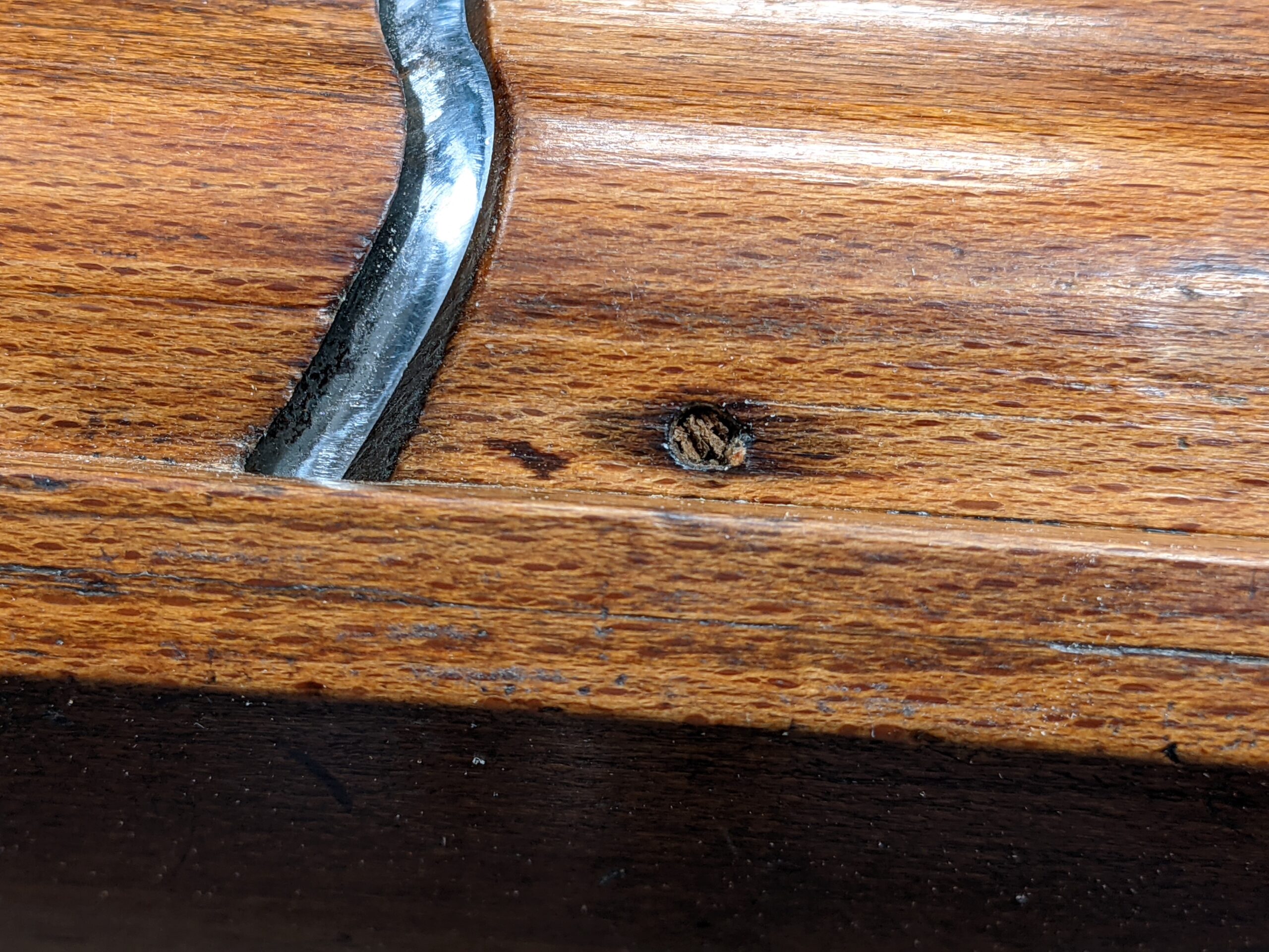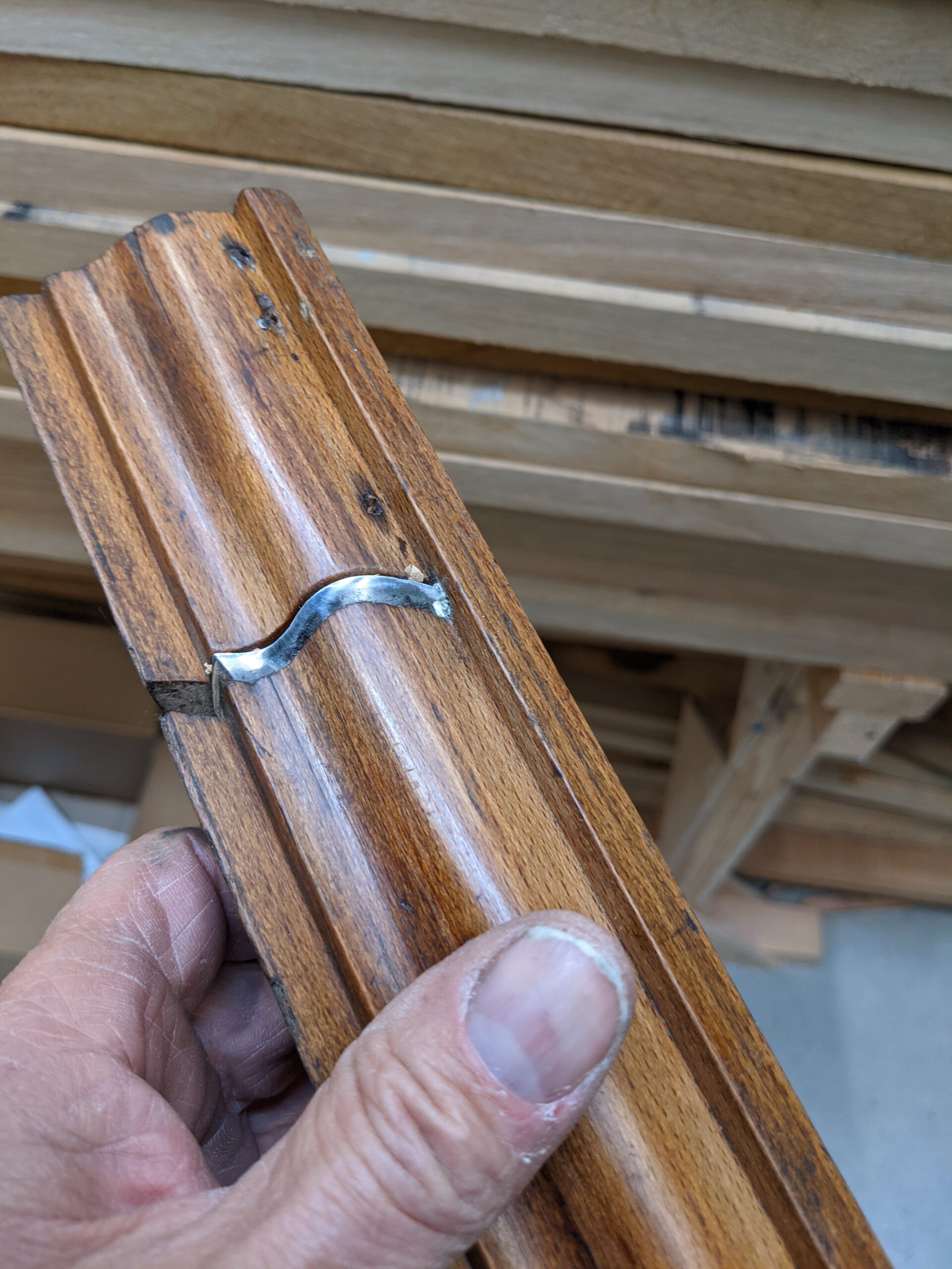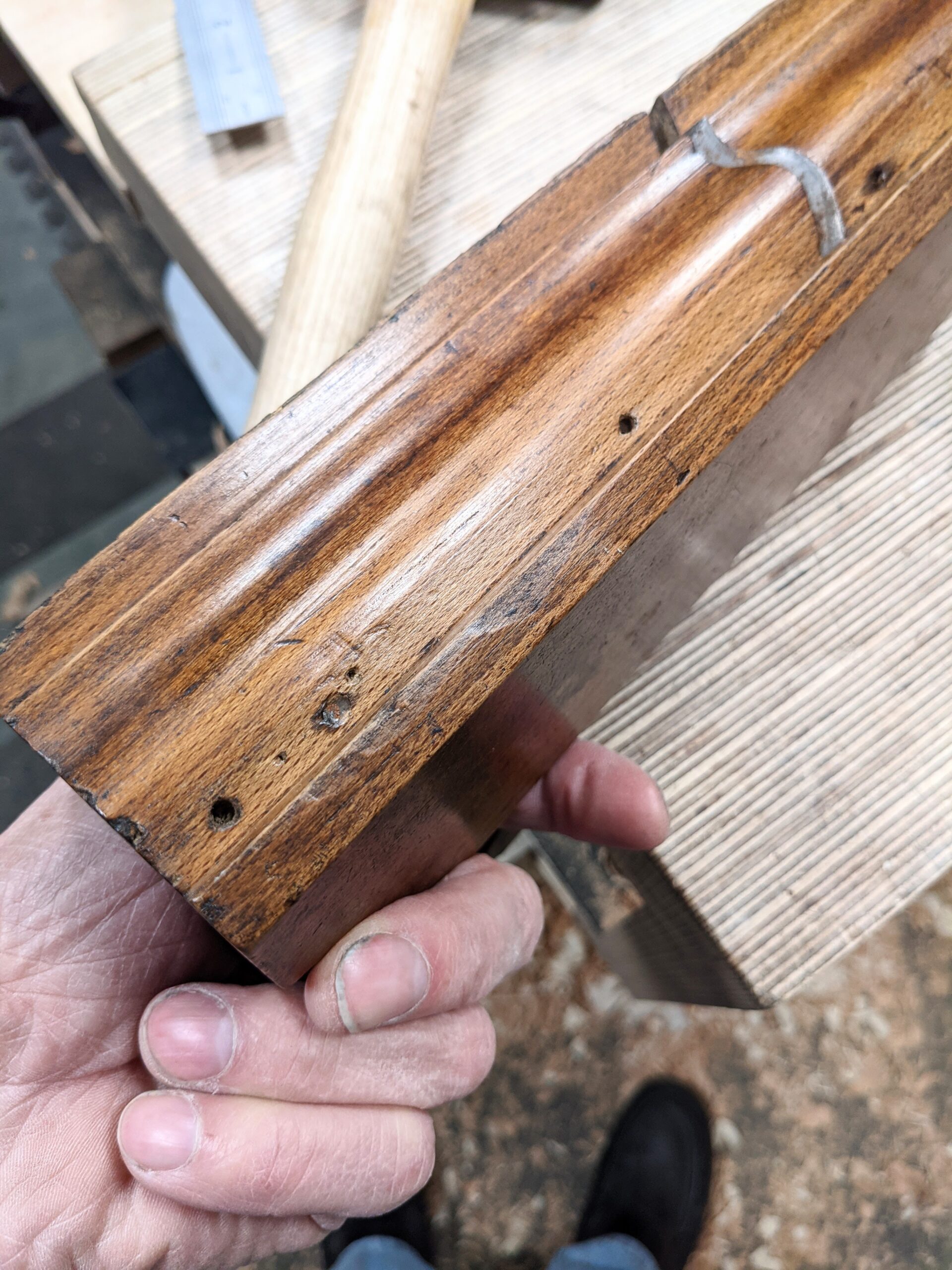 Running along the length, by an internal seat corner, I found a row of six nail holes that obviated a narrowing of the mould by attaching a fillet into the corner with brad nails. I measured a wear line that suggested the narrowing to be by around 3/8" (10mm). One nail remained stubbornly in place and was subsequently bent over and hammered in and just below flush.