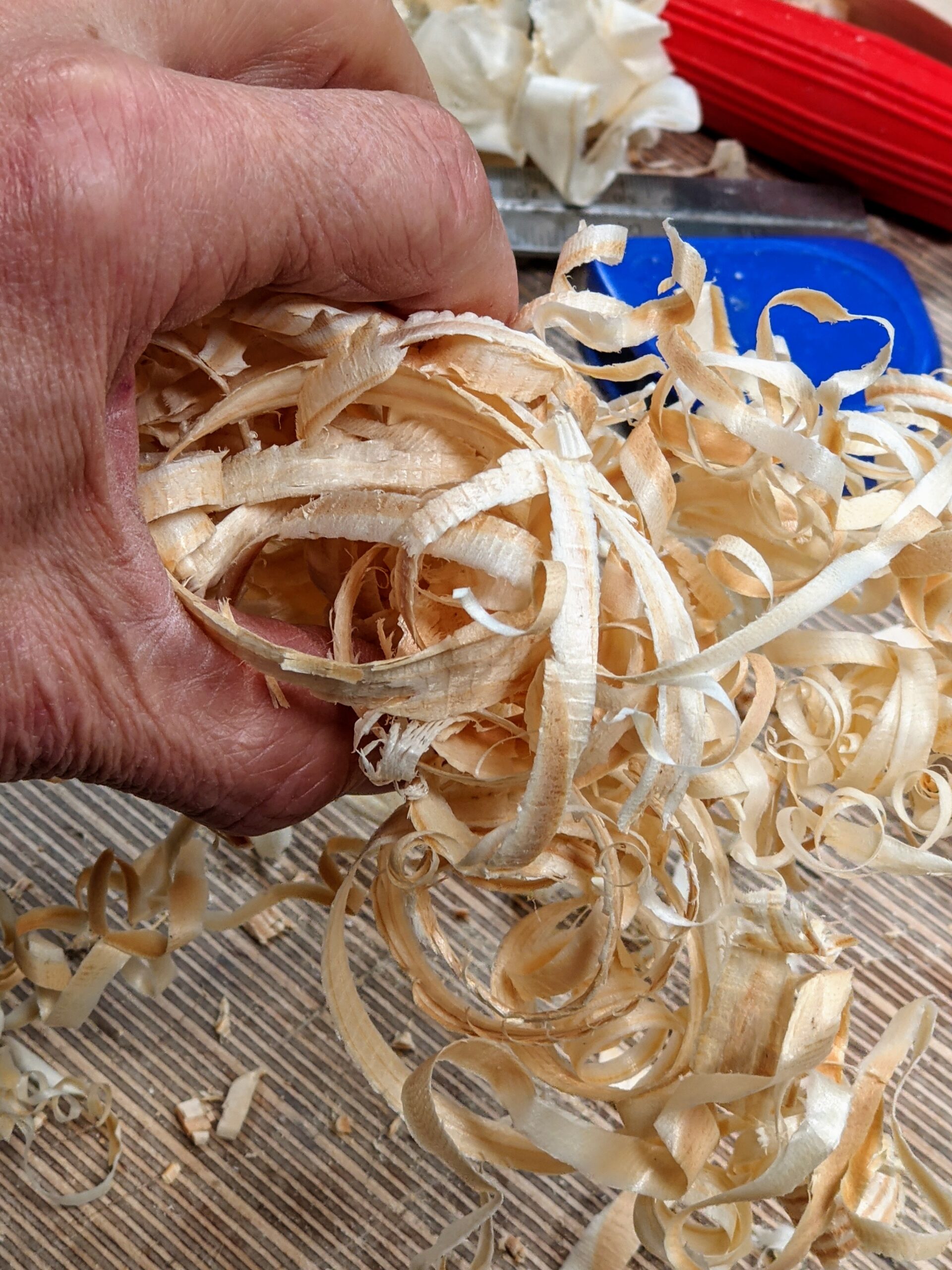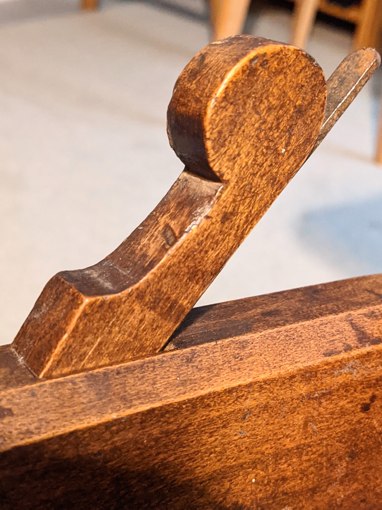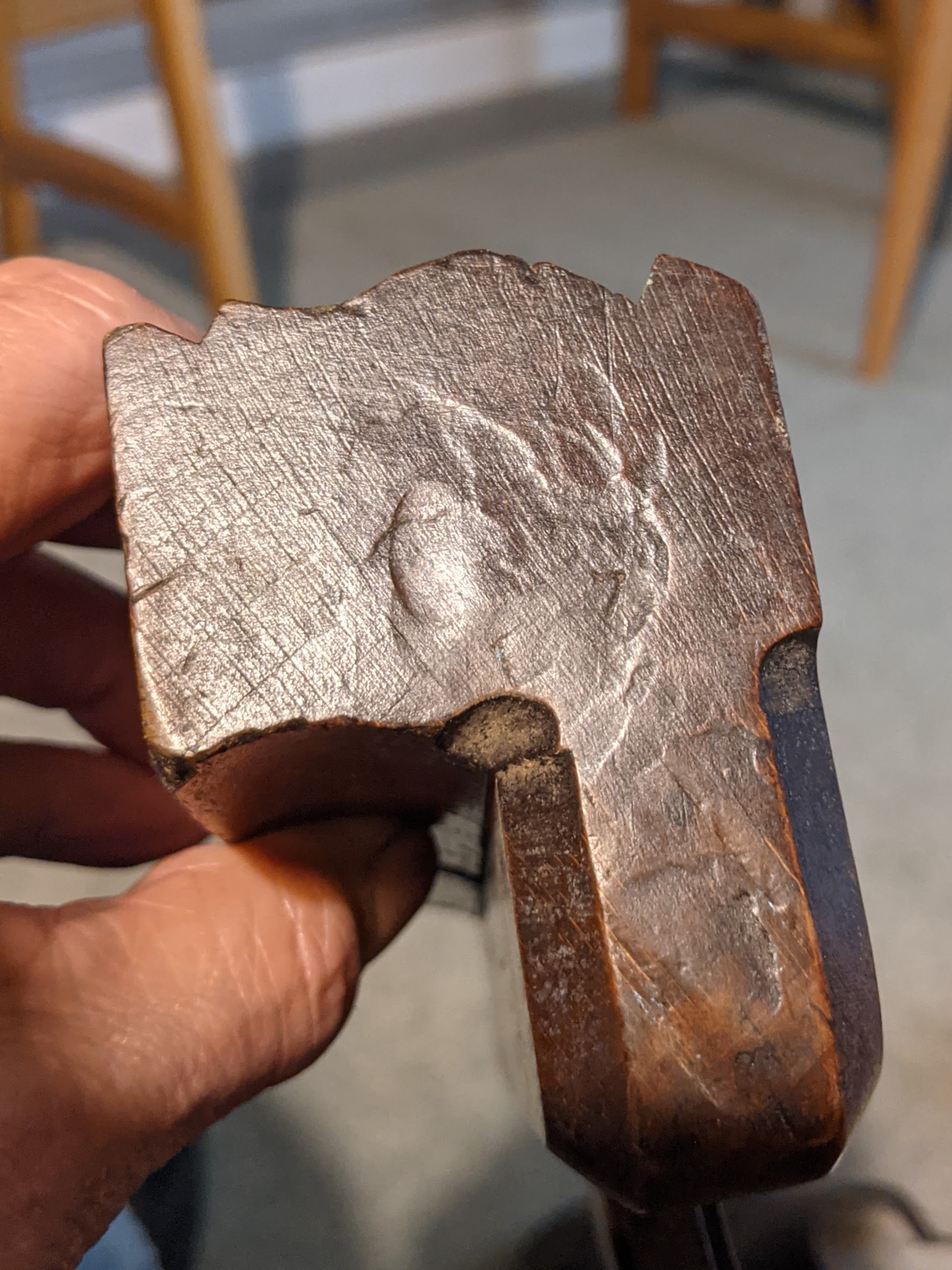 Here is the heel of the plane, replete with hammer marks aplenty. I have strayed from steel hammers for shocking blades and wedges most of the time because the weight of the Thorex 712 well suits my preference for doing as little harm as possible. The nylon face is suitably domed and in general gives good centre of percussion (COP) with every strike. That said, the Warrington 10-12oz hammer is still near to hand should the Thorex fail, and of course, the cross pein of the head hooks under the wedge to tap as and when I need it.