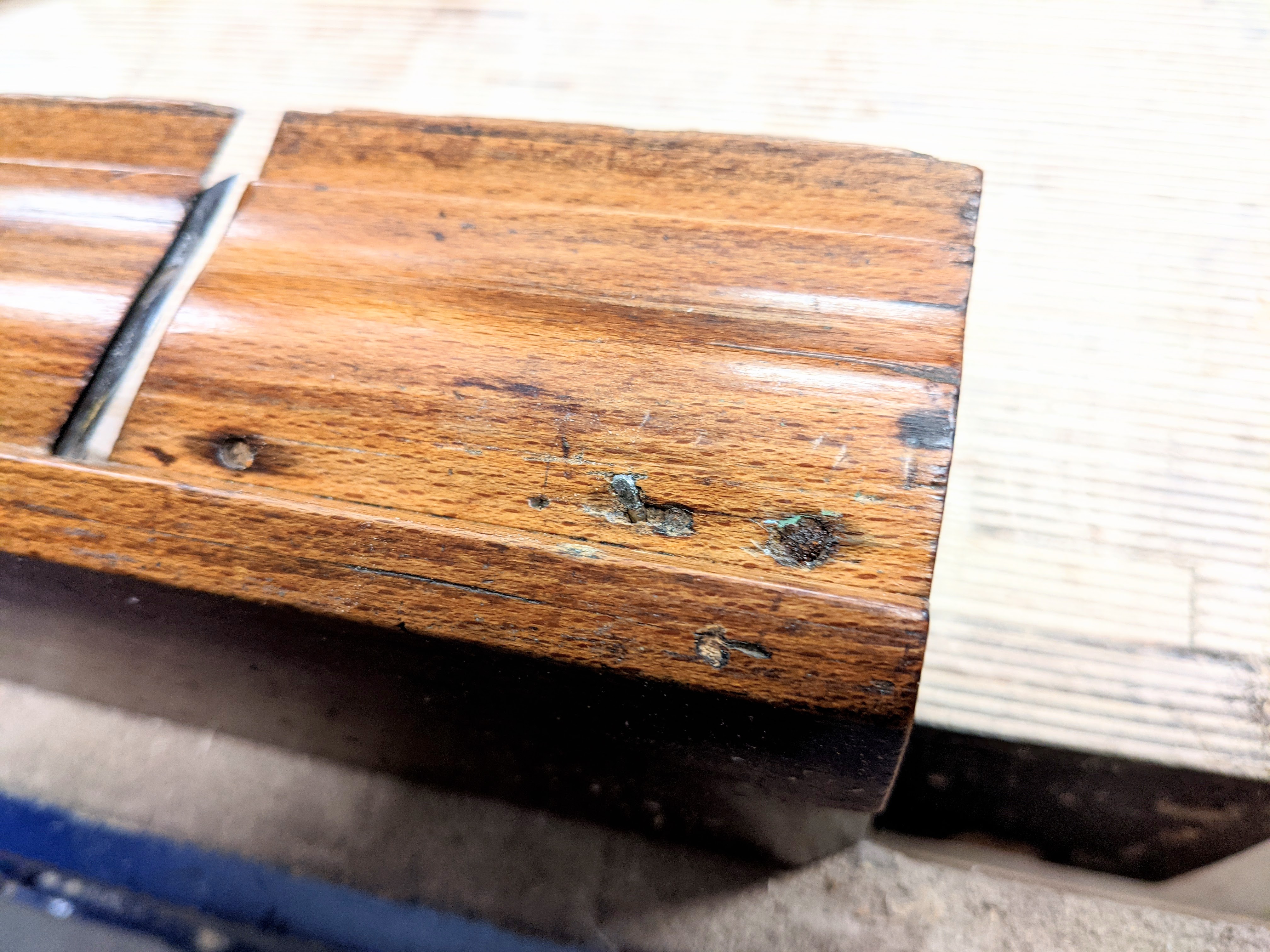 The nail had a small polished spot from shaving the wood over the years which showed more recent use despite the poor shape of the cutting iron. Just hints of possibilities really. But it's the staining around the holes that indicates the fillet was installed permanently and then the rust on the first nail head at the start of the mould and the one where the nail was broken off through rusting through by the mouth.