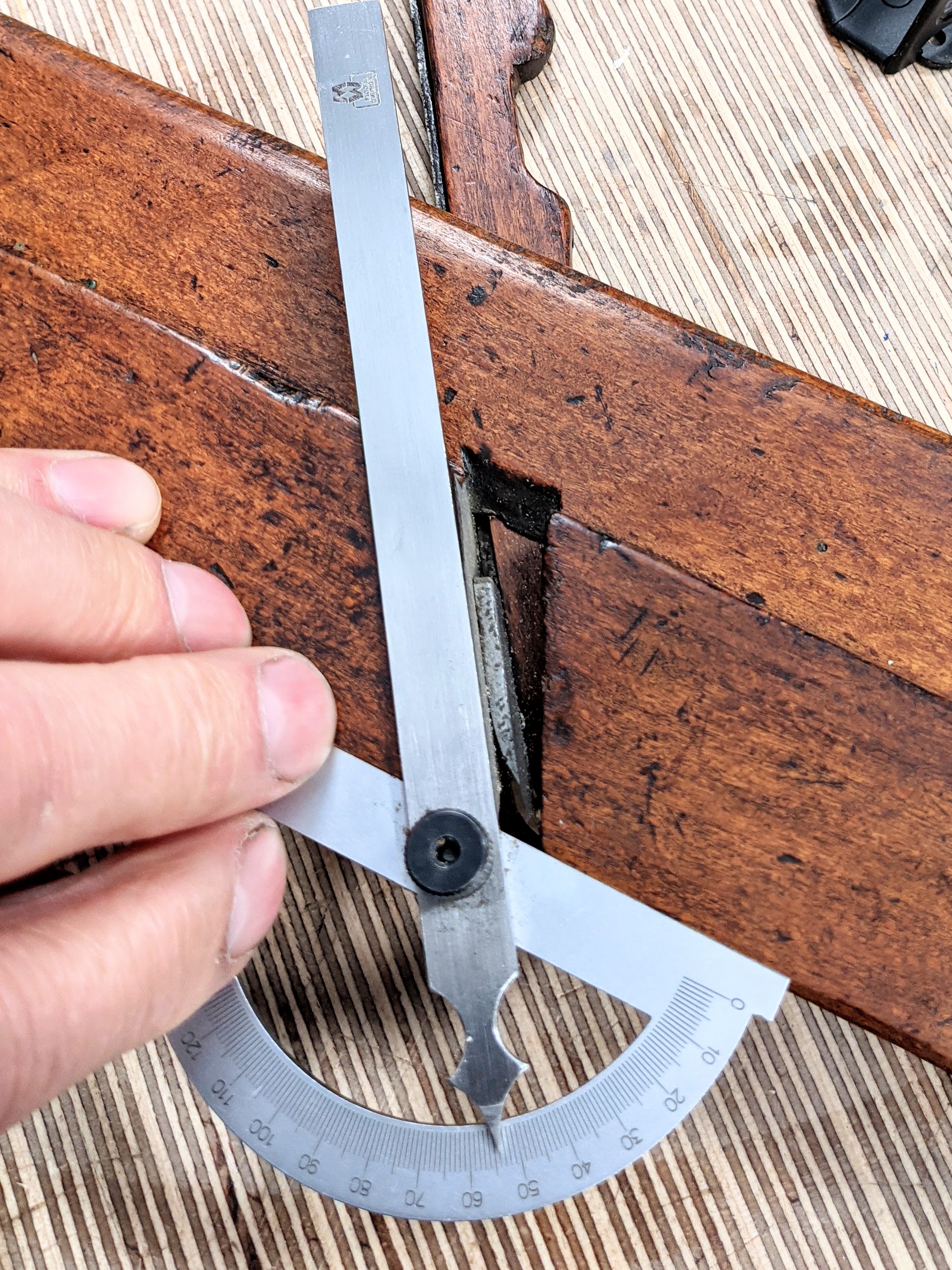 The bed angle is 47.5-degrees. We often fail to realise the importance of the bevel of the plane blade in determining the bed angle of presentation. The most practical bevel angle at the very cutting tip on plane blades is around 30-degrees, a shallower angle is weaker and the edge fractures more quickly on planes because, unlike chisels, for instance, the plane blade hits the wood like a side-swipe and not dead-on inline as in chopping and paring. A steeper bevel on the cutting iron would require a steeper rake to the bed of the plane, a shallower bevel, less than 25-30-degrees and the edge is really too weak for most woods and most work; especially is this so when we encounter any of the difficult grain associated with knots, etc. This edge fracture occurring when the bevel is too shallow to establish a sustainable bevel edge causes the grain to tear in a ripping manner.