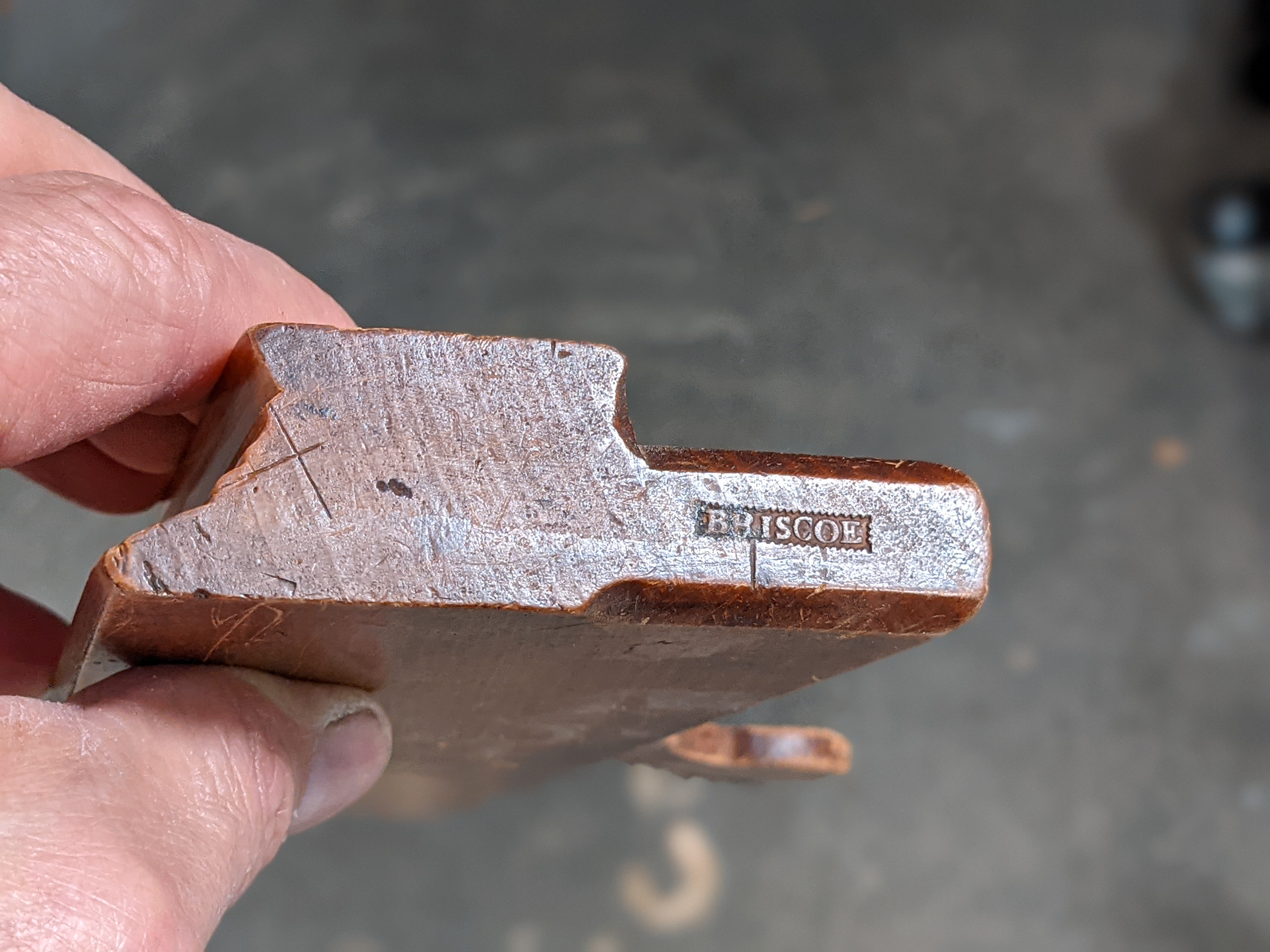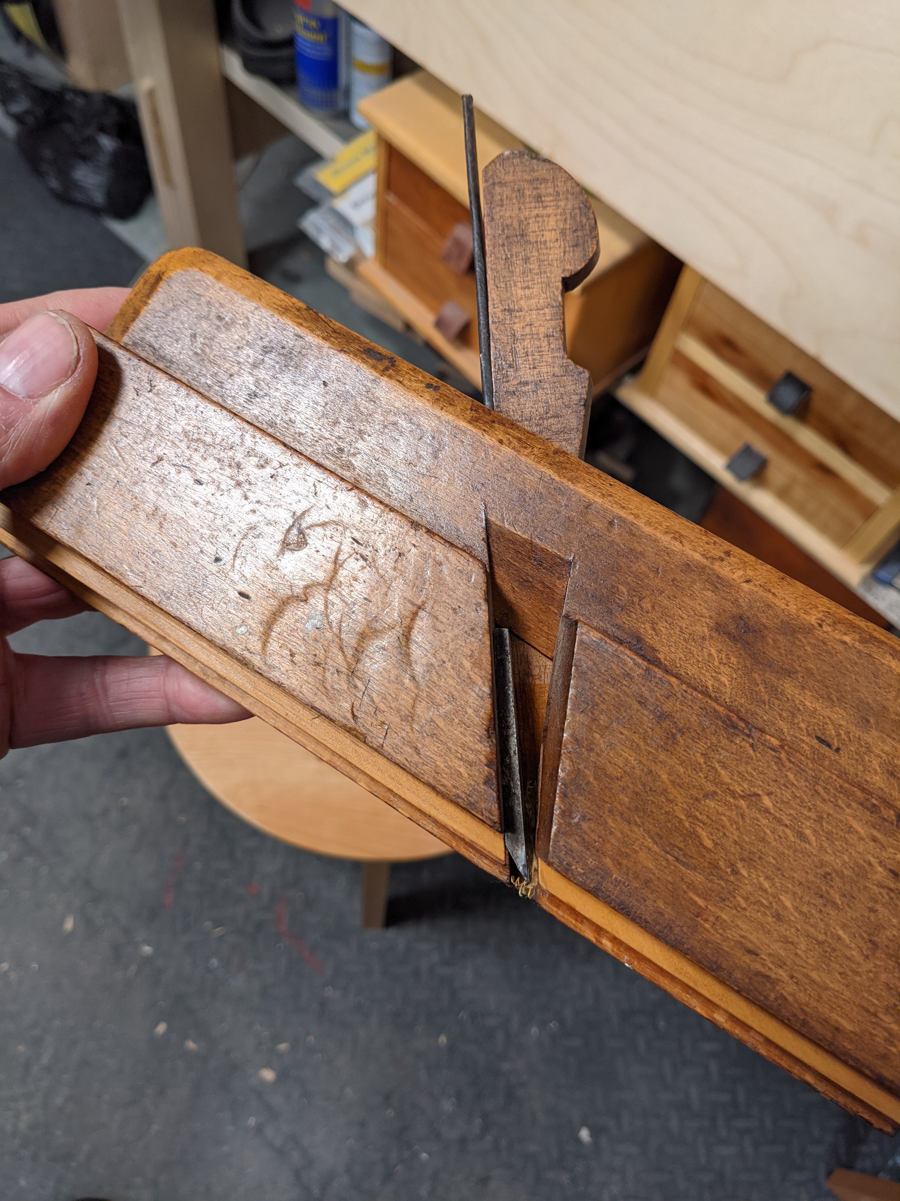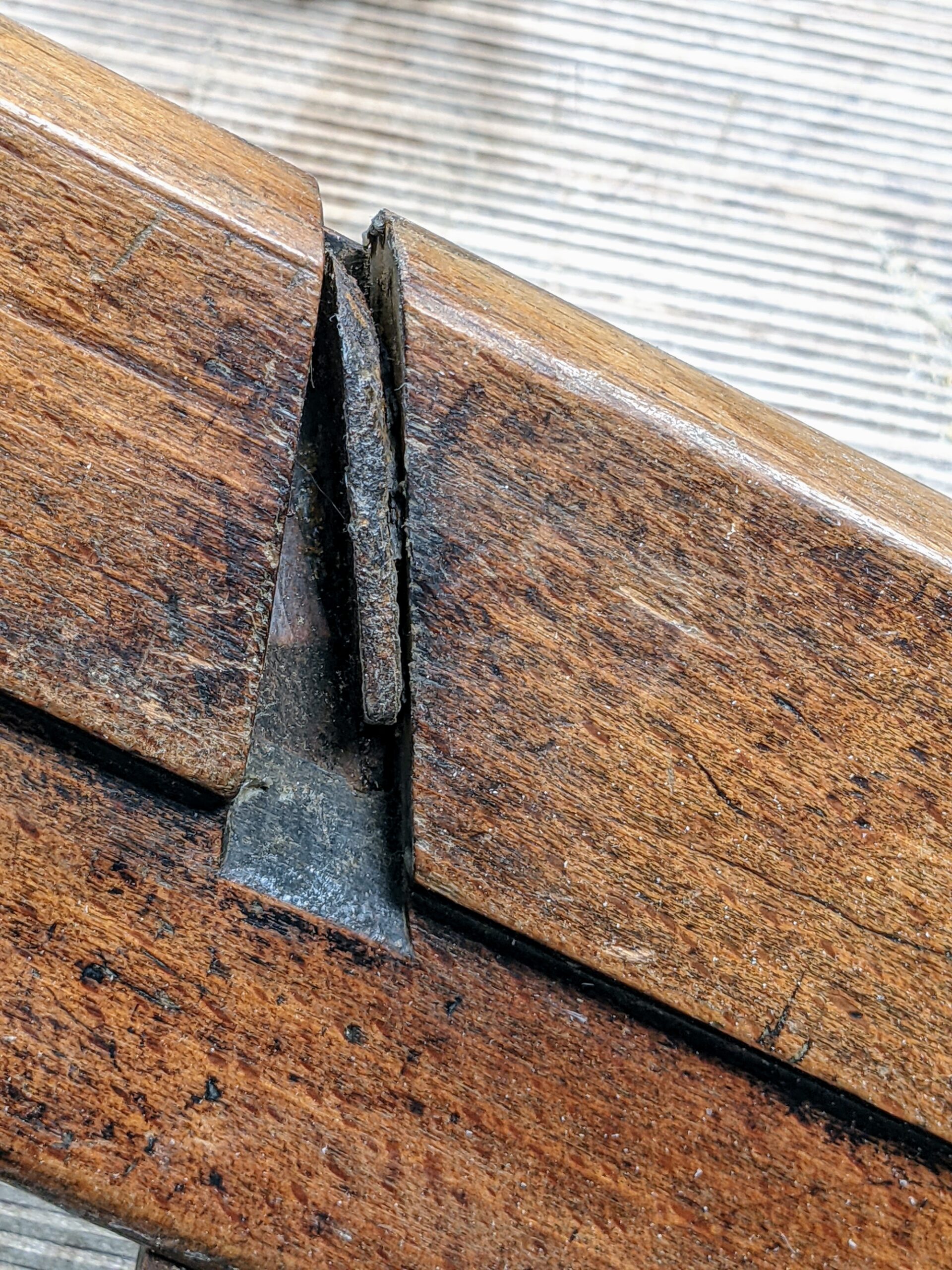 The wedge is in pristine condition considering its 250 year age. This might seem insignificant but it is not. When you buy vintage planes, look at the wedge and cutter in place. It is perfectly legitimate to sell a plane with the wedge and iron irreversibly 'frozen' by long term rust in the channel as long as it is known when the transaction takes place. Working knowledge of planes comes by involvement and the longer the term of involvement the more experience to go off. I would not want a seller with zero knowledge to in ignorance try to shock a wedge and iron loose or indeed do much else to a moulding plane. This will most likely bend the stem of the cutting iron, snap it or damage the wedge next to it in the process.