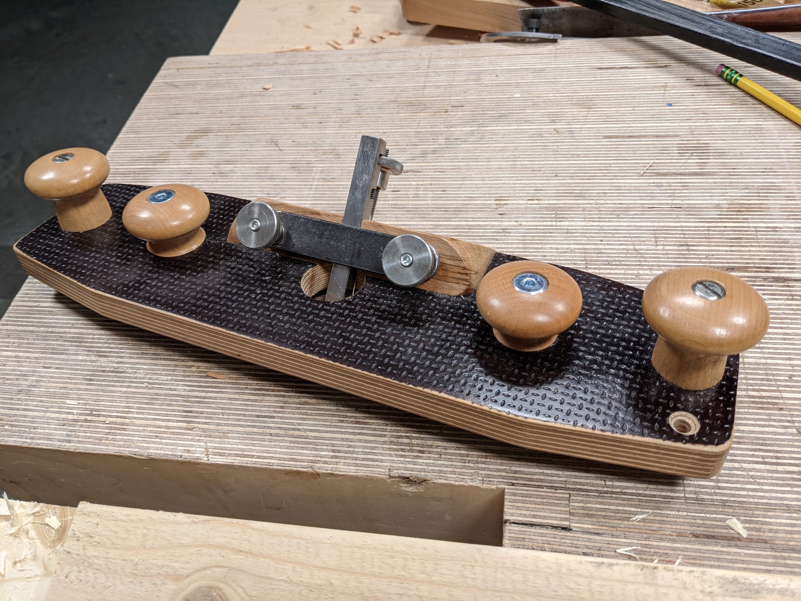 As some of you know, some 15 years ago I developed a router plane 'sole extender' to lengthen the sweep of the plane for surfacing tenon cheeks. You could flip the aluminum plate for left- and right-handed use but whereas it worked fine in achieving good results, metal soles tend to mar the wood surface in one way or another or both. Either they leave surface marring in the form of long indents in the wood or they discolour the wood with the colour of the metal used. I made one of my planes from the phenolic 15-ply plywood (above and below) and it works beautifully.
