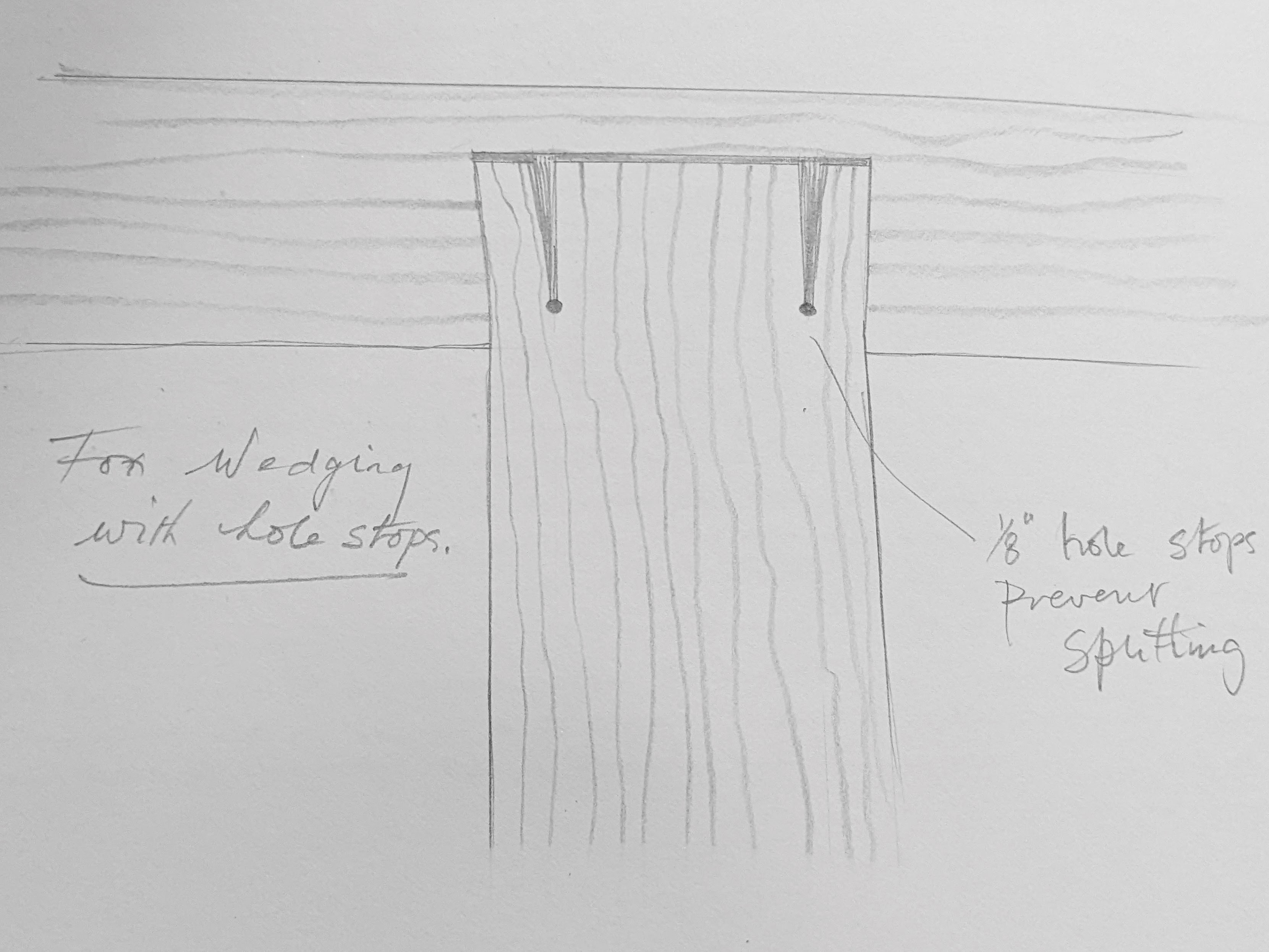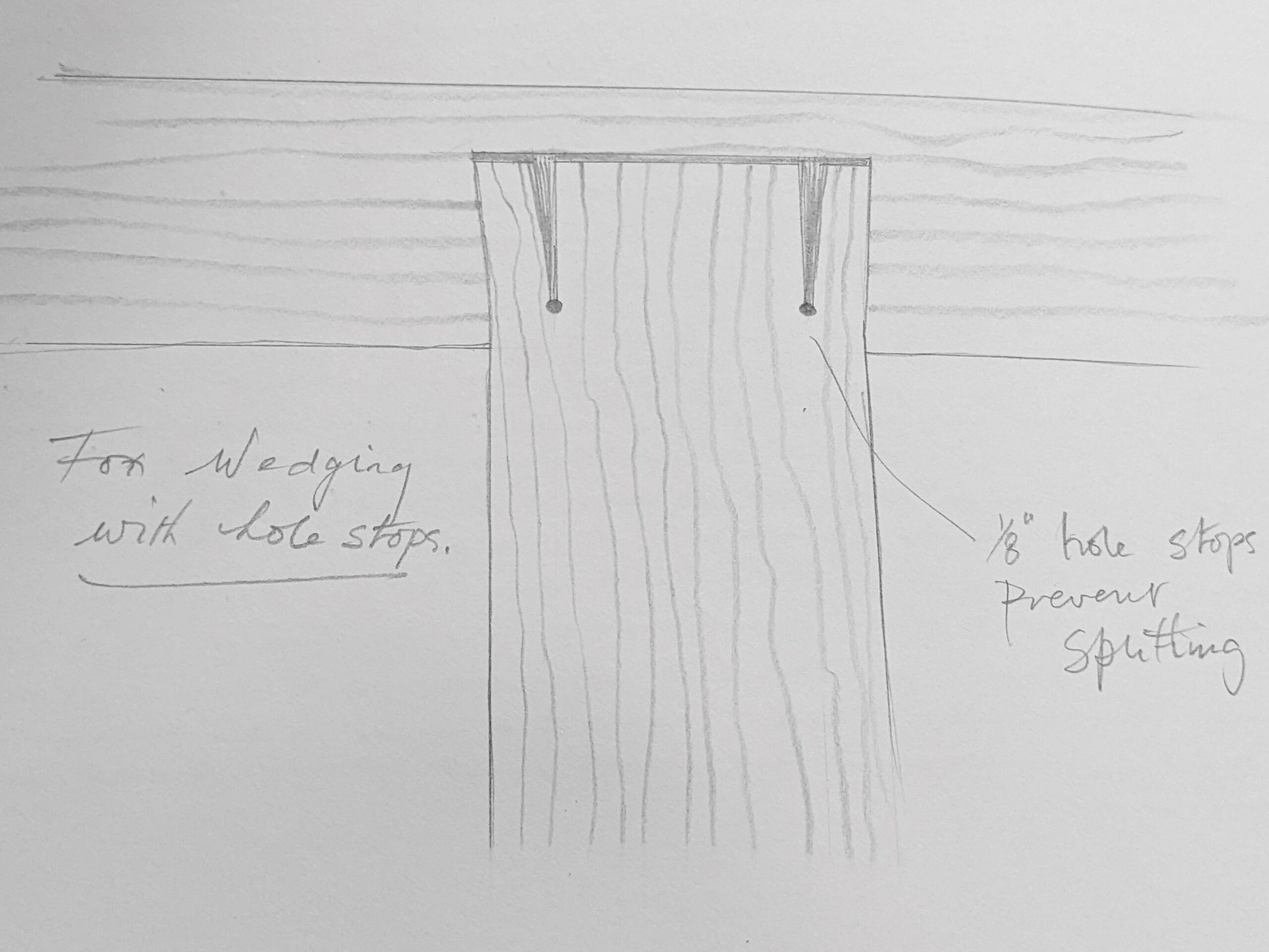 There are advocates for using small holes at the end of the saw kerf to work as stops to stop the wood from splitting. I can't say I am an advocate of this though I can see how it works. My preference is to keep as much grain as possible. Any amount of reduction increases weakness at the critical area of stress. This is the reason I make sure to increase the wall at the ends of the mortise hole as a 'retainer wall' of resistance to prevent any splitting. It works in that I have never had a split occur.
