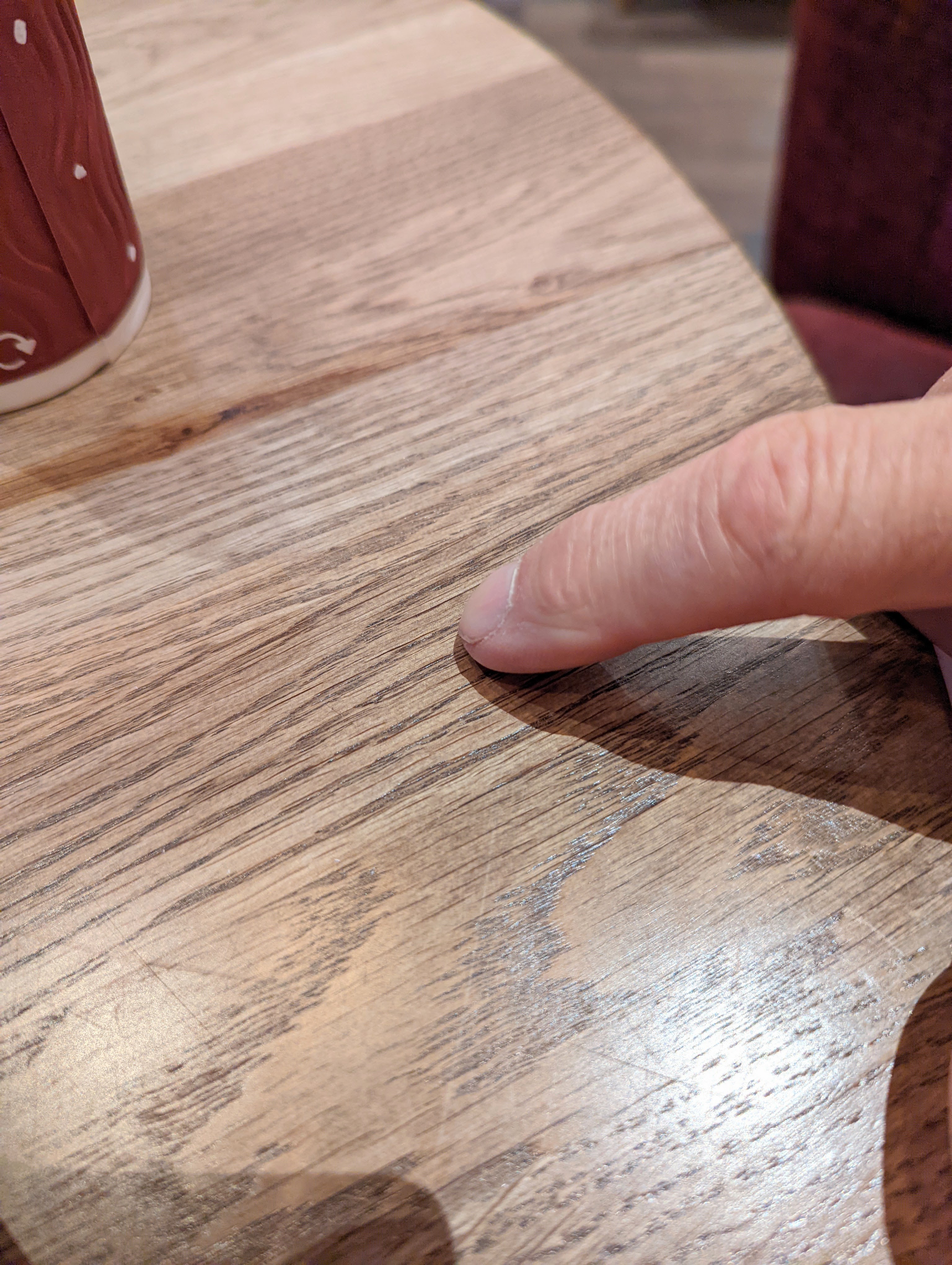 I'm sitting in a cafe where I mostly write and all of the tables are dead flat. Running my fingers over the tabletops, they are smooth and feel fine. The tables, about fifty of them, are made from solid oak and I think that they look nice but would be better unstained. Considering the abuse cafe tables get from spillage, these tables hold up. Not one of them shows any sign of a cracking or separation in the narrow laminations and this is the reason they go for narrow laminations rather than wide boards. For mass-making, laminating tabletops ensures that the tables will stay flat, but more than that, any attempt at rebellion from one piece is countered by the dominance of the masses either side. Laminating this way holds and constrains any proclivity to distort through the absorption and release of moisture in the wood. Of course, a waterborne, water-based finish as a surface treatment basically shrinkwraps the wood throughout with its plastic-based resin coat. Cafe tables of this type are always finished as well on the underside of the table as the table's topside. The corners are never sharp and always rounded. This is no different when using paint. Why? Varnishes and paints stretch in their shrinkability. This seems a false dichotomy. Does it stretch or does it shrink? Can it do both?