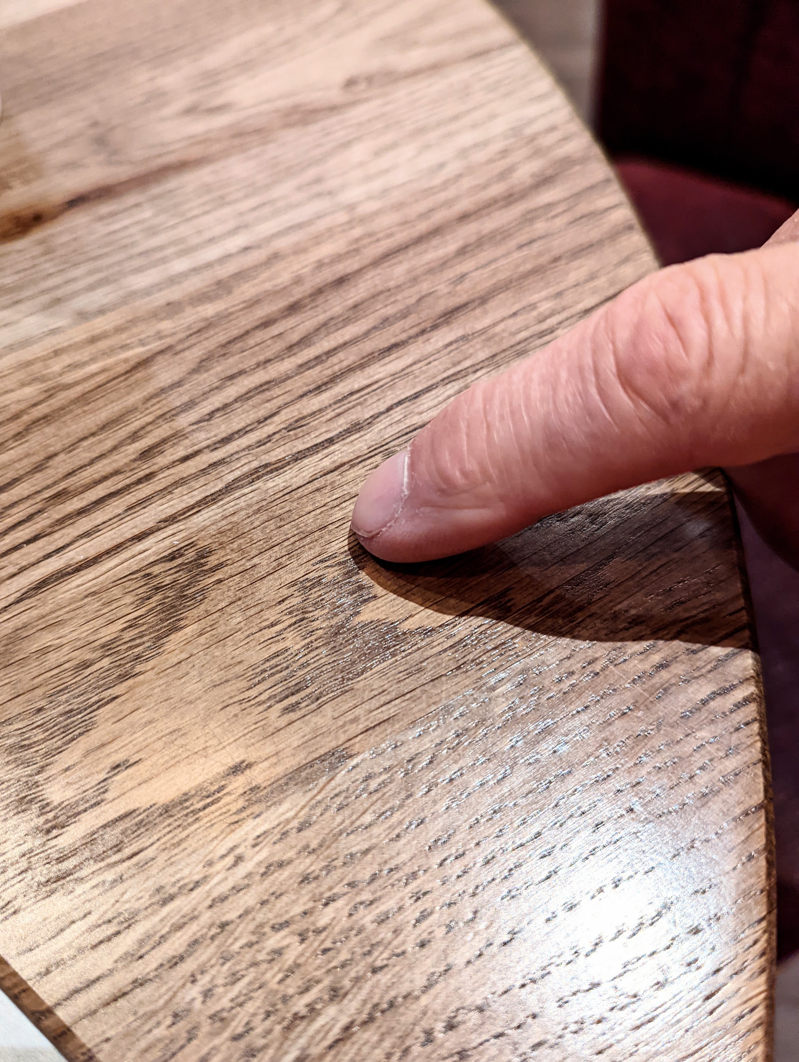 On the oak cafe tables, I noticed how the plainsawn wood seemed to remain smoother and more even than on the quartersawn which had the hint of a washboard effect.