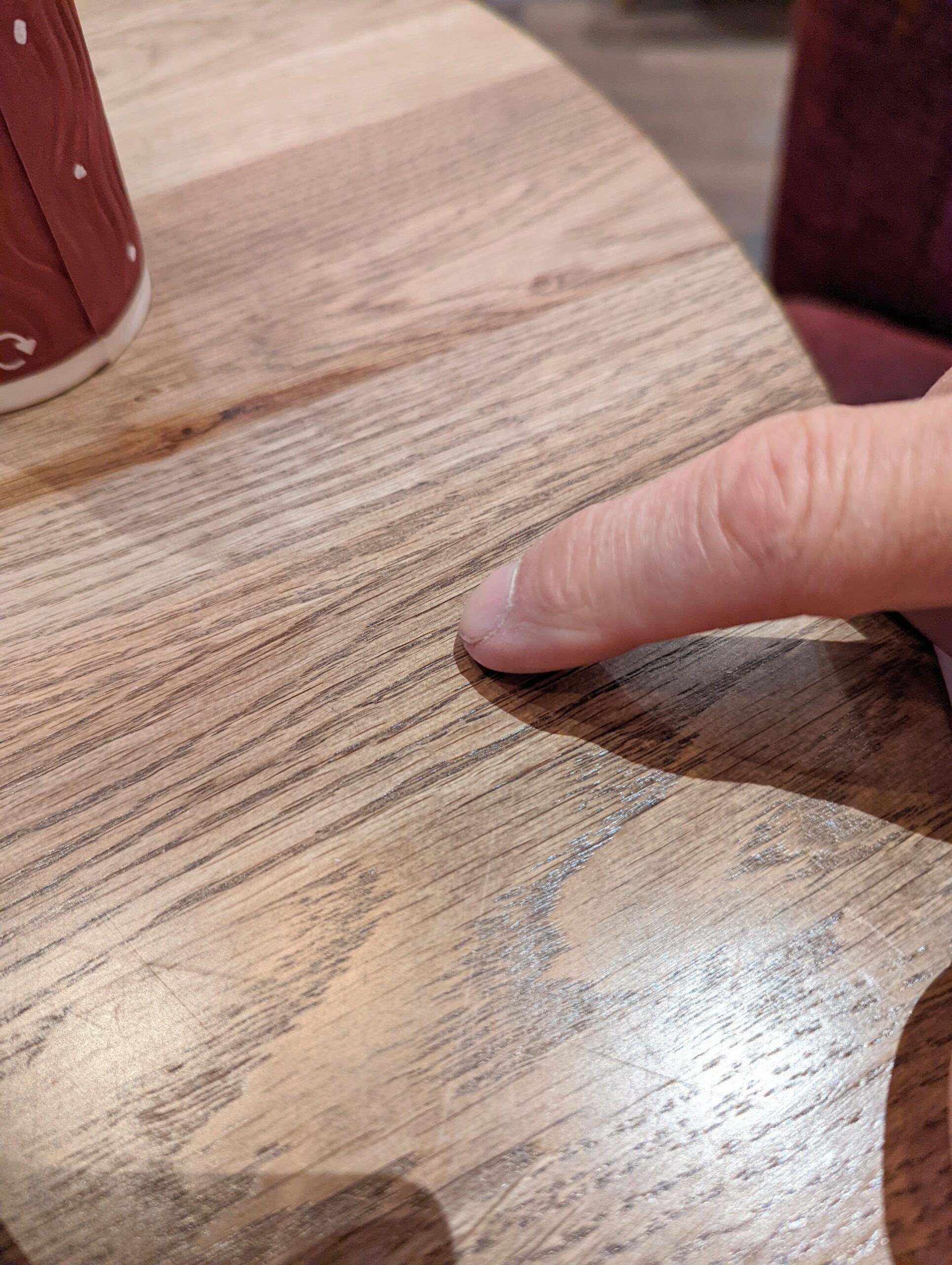 I'm sitting in a cafe where I mostly write and all of the tables are dead flat. Running my fingers over the tabletops, they are smooth and feel fine. The tables, about fifty of them, are made from solid oak and I think that they look nice but would be better unstained. Considering the abuse cafe tables get from spillage, these tables hold up. Not one of them shows any sign of a cracking or separation in the narrow laminations and this is the reason they go for narrow laminations rather than wide boards. For mass-making, laminating tabletops ensures that the tables will stay flat, but more than that, any attempt at rebellion from one piece is countered by the dominance of the masses either side. Laminating this way holds and constrains any proclivity to distort through the absorption and release of moisture in the wood. Of course, a waterborne, water-based finish as a surface treatment basically shrinkwraps the wood throughout with its plastic-based resin coat. Cafe tables of this type are always finished as well on the underside of the table as the table's topside. The corners are never sharp and always rounded. This is no different when using paint. Why? Varnishes and paints stretch in their shrinkability. This seems a false dichotomy. Does it stretch or does it shrink? Can it do both?