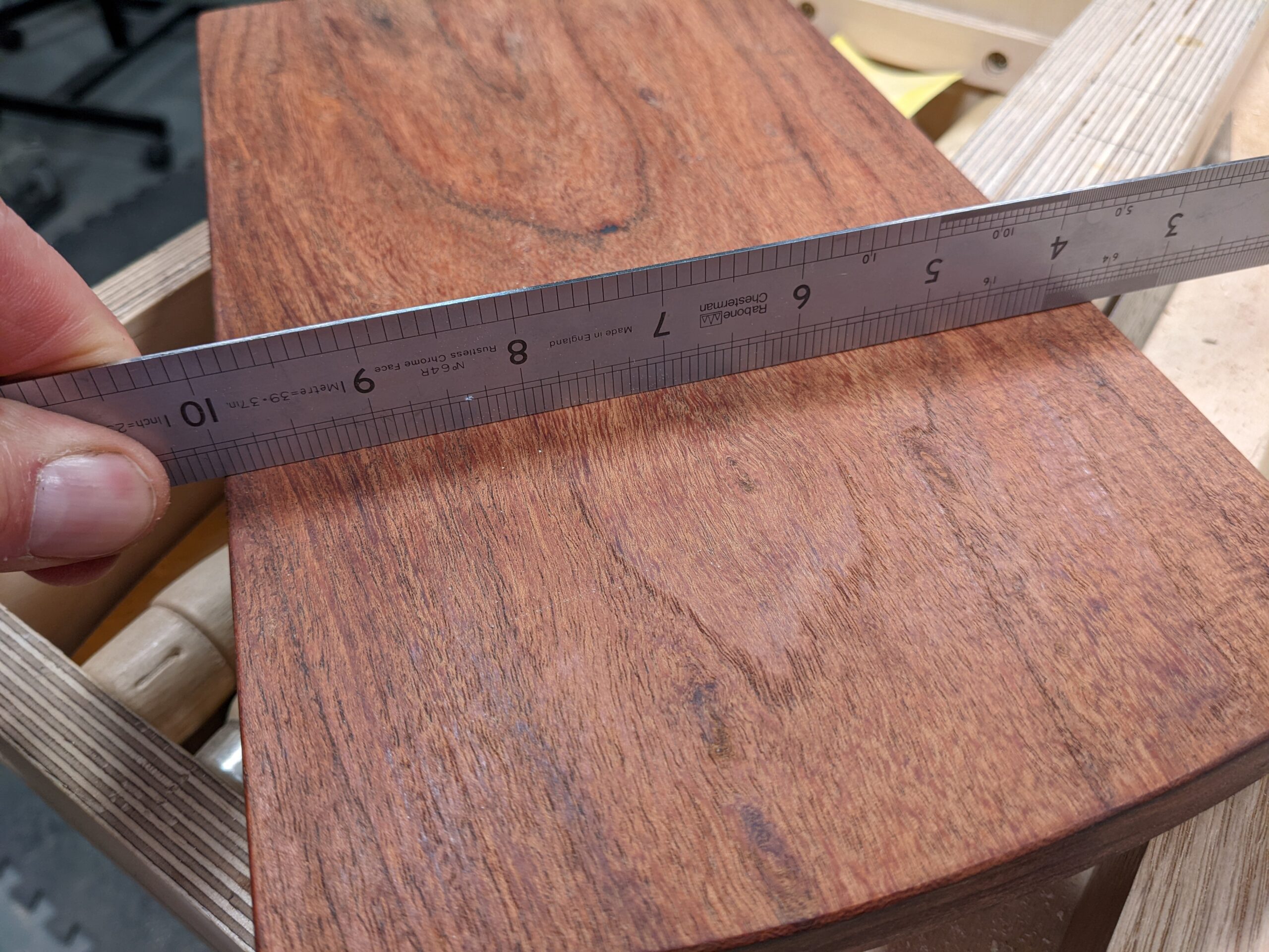 When I first began working with mesquite I was prepared to consider shrinkage as I did other hardwoods growing in the region. Woods like oak, ash, maple, cherry and walnut. When you take down a live tree, slab it and then reduce the moisture content by drying it in a kiln or air-drying, you expect the width of board you cut to shrink considerably from its original cut size. Some woods will shrink an inch or so rendering a 12" wide board a usable 11". This variance depends on the wood and whether too it is softwood or hardwood. In an endeavour to experiment with my woods, I soaked and resaturated the fibres of short cuts of all the above-named woods over 24 hours in a bucket of water. My sections were 1" long along the grain, 6" wide and 3/4" thick. My main interest was how the wood would expand across the six-inch width as this is the measurement I needed to know the increase of. Wood shrinkage in its length is so minimal it usually do not affect any of our work. Long story short, all of the domestic hardwoods increased a massive 3/8" to 1/2". Very substantial, I thought. Mesquite however increased a mere 1/16" in width and it is this that I consider the property that gives mesquite its intrinsic resistance toward distortion both in seasoning and in subsequent exposure to extremes of any and all atmospheric conditions surrounding it.