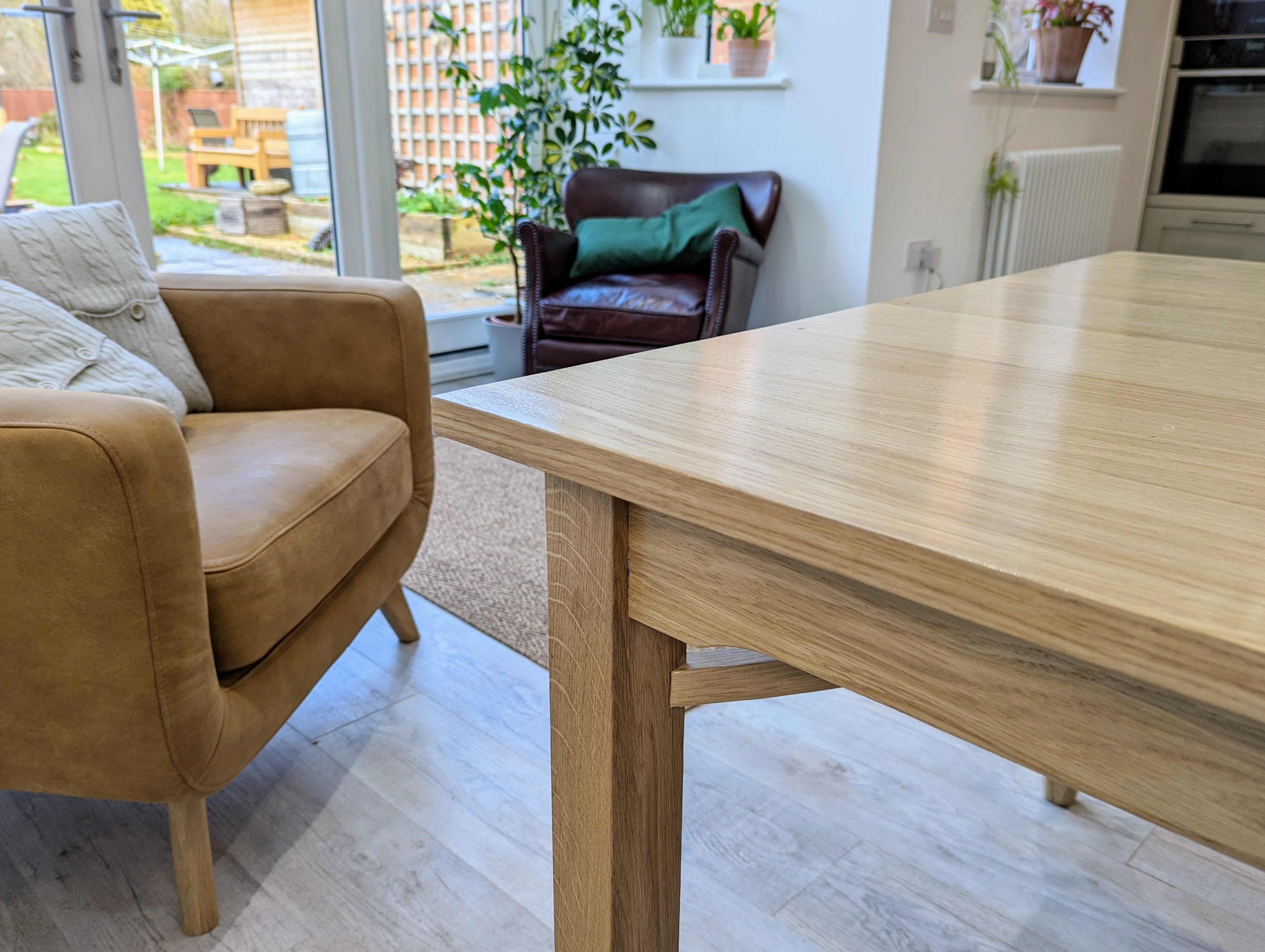 Yesterday, I took the table from the garage and into the house dining area of the new kitchen. I was pretty thrilled and I am glad I was. Why am I glad? It never left me, that the thrill of delivering a new piece, no matter where, is just an amazing morale booster that cannot be replicated by making that big sale, depositing mere money into a pension pot or competing in any sports event you care to name, and the experience of it is self-evident through the years to come. The nine or so pieces I made last year for the living room still give me the satisfaction of knowing I designed them and made them.