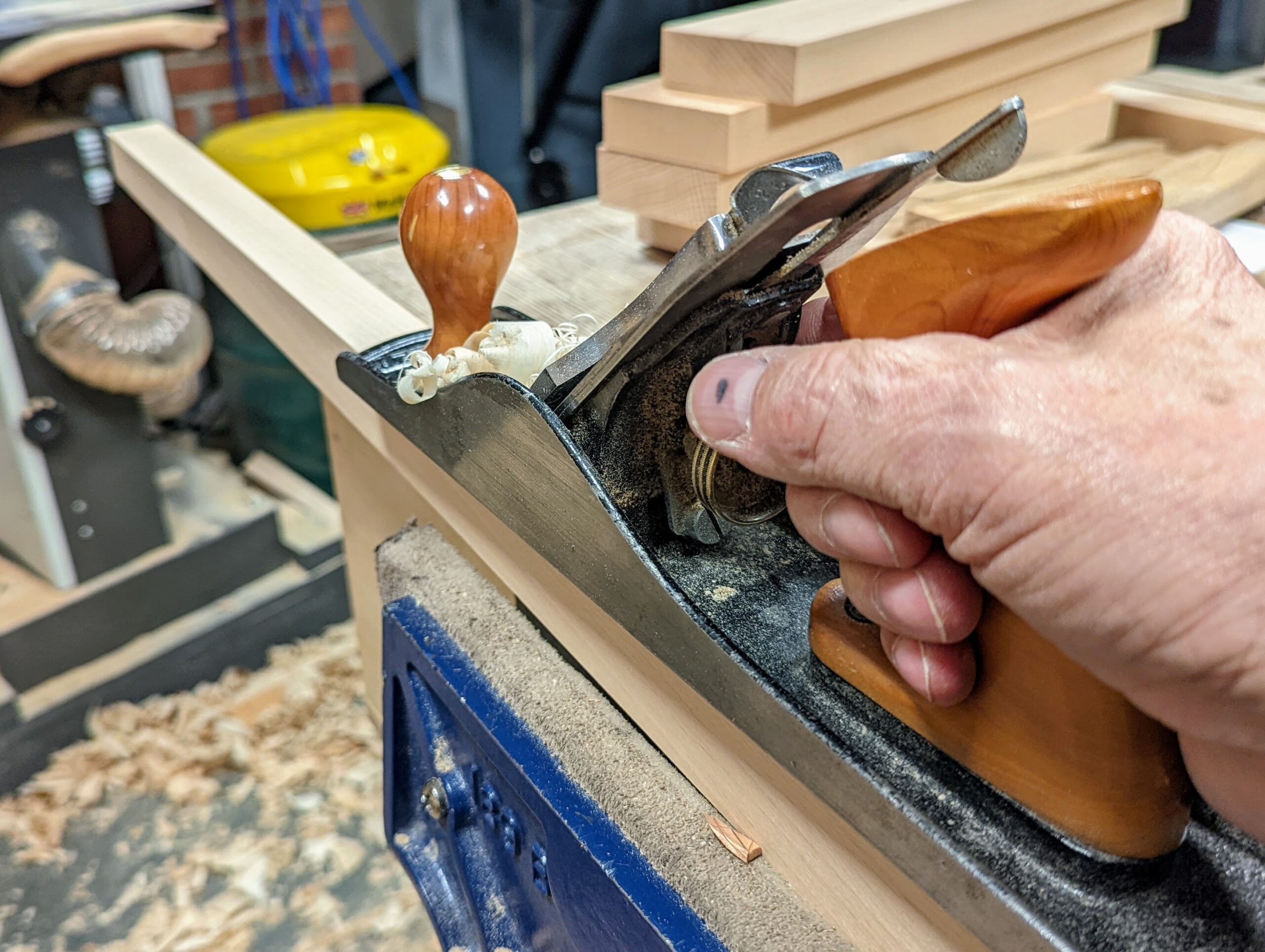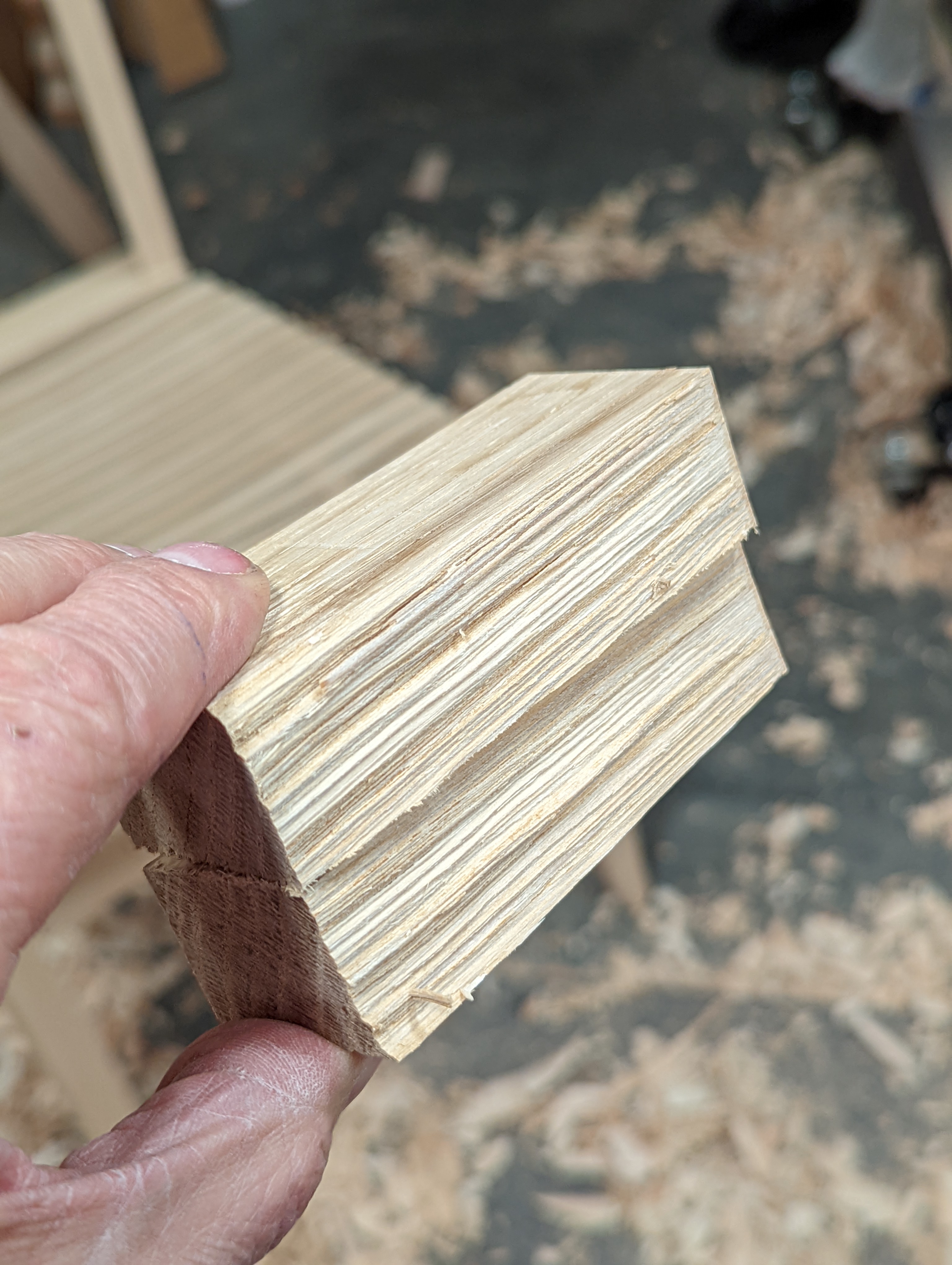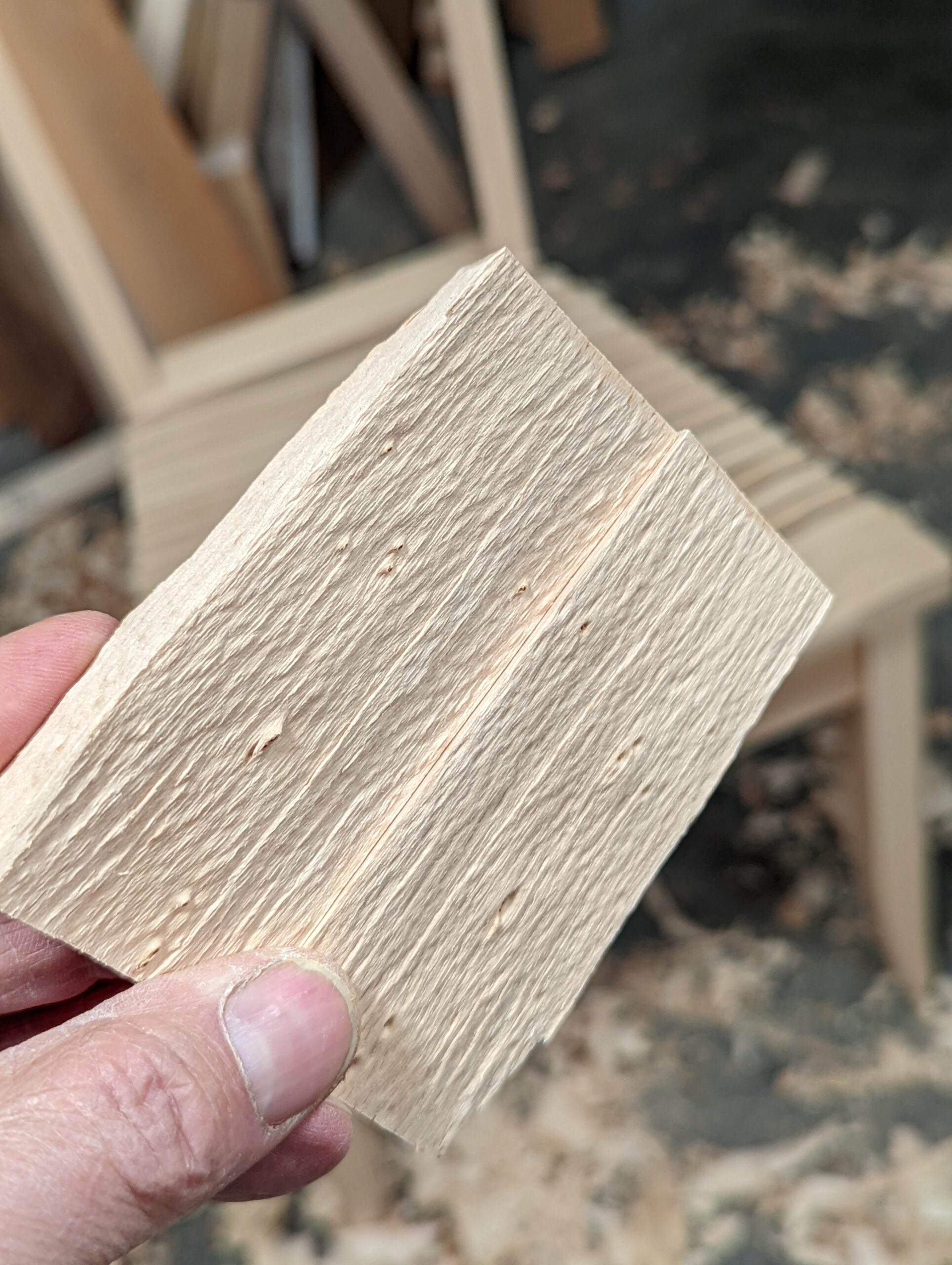 Beech is a tight-grained wood of even density throughout its fibres and without any noticeable difference between the early and late aspects of the growth rings you get with many temperate woods. Planing oak at a tangent will often result in distinct sound changes as you plane it, together with visual 'stepping' in the surface where a percentage of each growth ring wood compresses and springs back under the pressure of the cutting edge of the plane. This often happens with softwoods too. Many of the softwoods, like European redwood, have greater distinction of hard and soft wood to every growth ring, hence the darker later summer and winter growth against the more spongy fibre in the early aspect of the growth ring adjacent to it. No such thing is so evident with beech, so planing the upper sloped back of my back chair legs to give it its angled back resulted in an absolute glass-like smoothness along the full length. The one thing I might say is that this wood is absolutely intolerant of dull tool edges so continuing to plane once the edge is starting to dull will result in rounded faces as the plane takes any path of least resistance. My advice is not to wait until dull but to sharpen much more than you might normally allow, consider twice as often as not being too much.