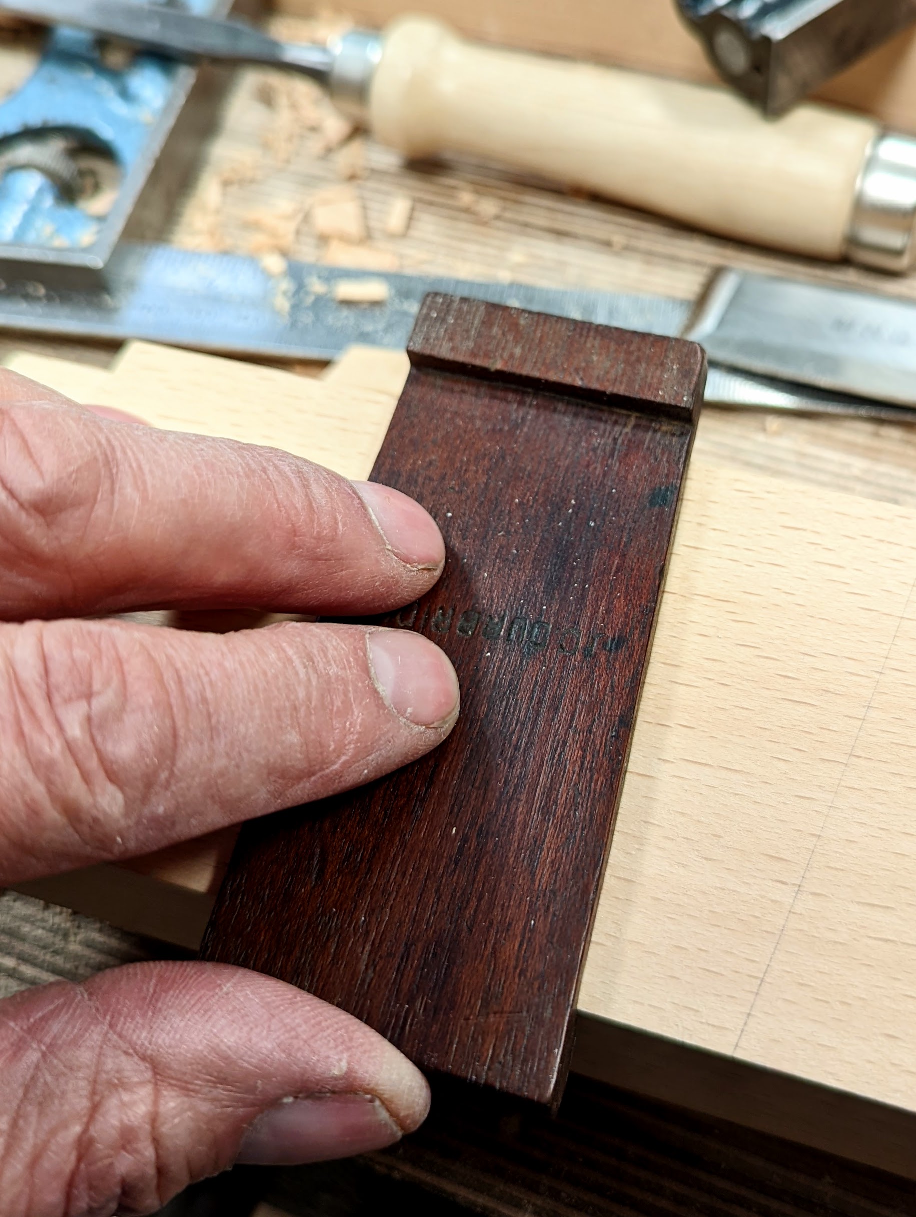 I can't recall the last one I found. I didn't really need another today, but there it was looking for a home from its abandoned state in a red plastic box in a secondhand shop. My own dovetail template is the best yet and especially my newest and very latest iteration of it that just came back from an engineer friend who fabricated some prototypes to my specs. One day it will be available because I think it is such a nice one to use. This mahogany one I found will join my dozen or so others and I will enjoy using it from time to time, maybe.