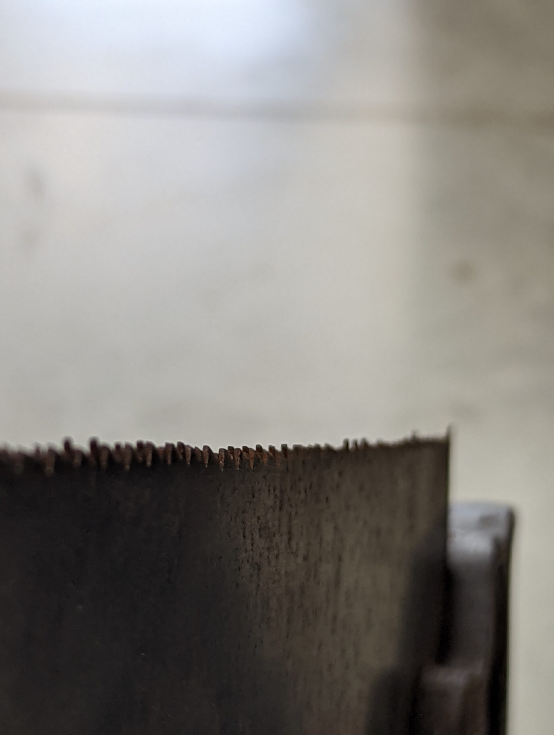 The teeth were as rugged as the Himalayas, the largest peaks and troughs I ever saw in a handsaw, probably supposed to be 10 points per inch. Someone thought they could fix the problem of dullness by just using a big, flat file. He failed! Probably drove a road grader for his day job! He succeeded in filing out each tooth between each one. Some people are like that. The handle and plate were in decent restorable condition for reclamation of the whole saw though, so cutting in and filing new teeth is no big deal. I will grind them off, file the new line straight and then cut in new teeth at 10 teeth per inch or so. I have the simplest system for this.