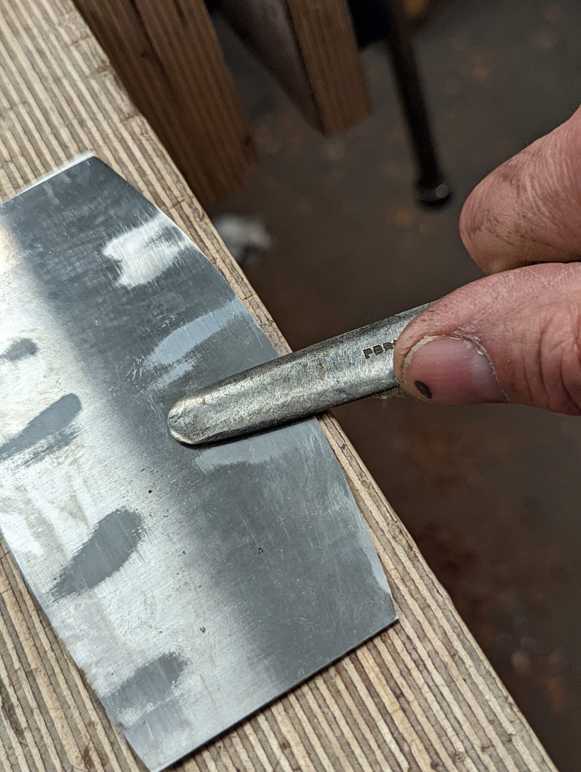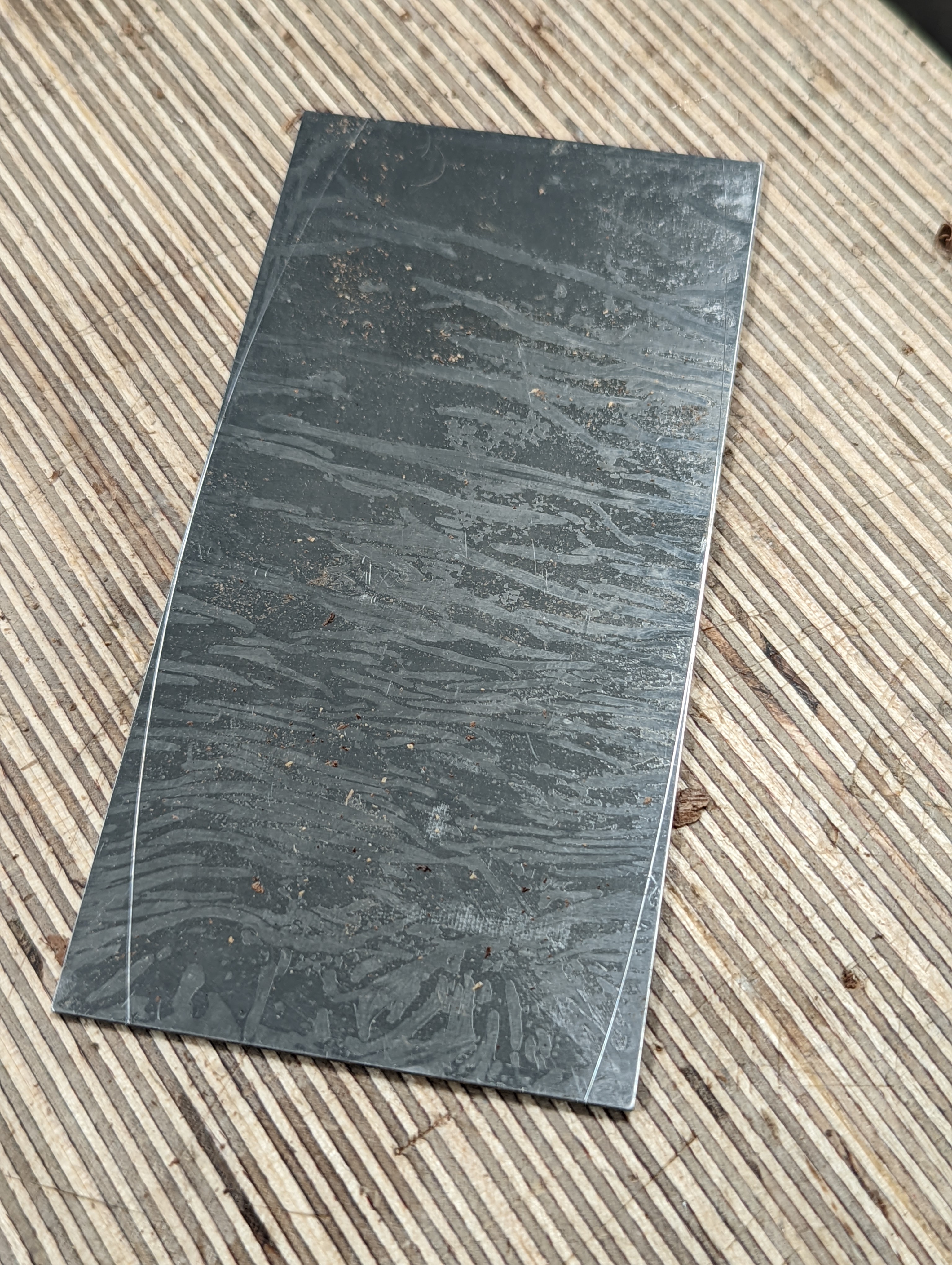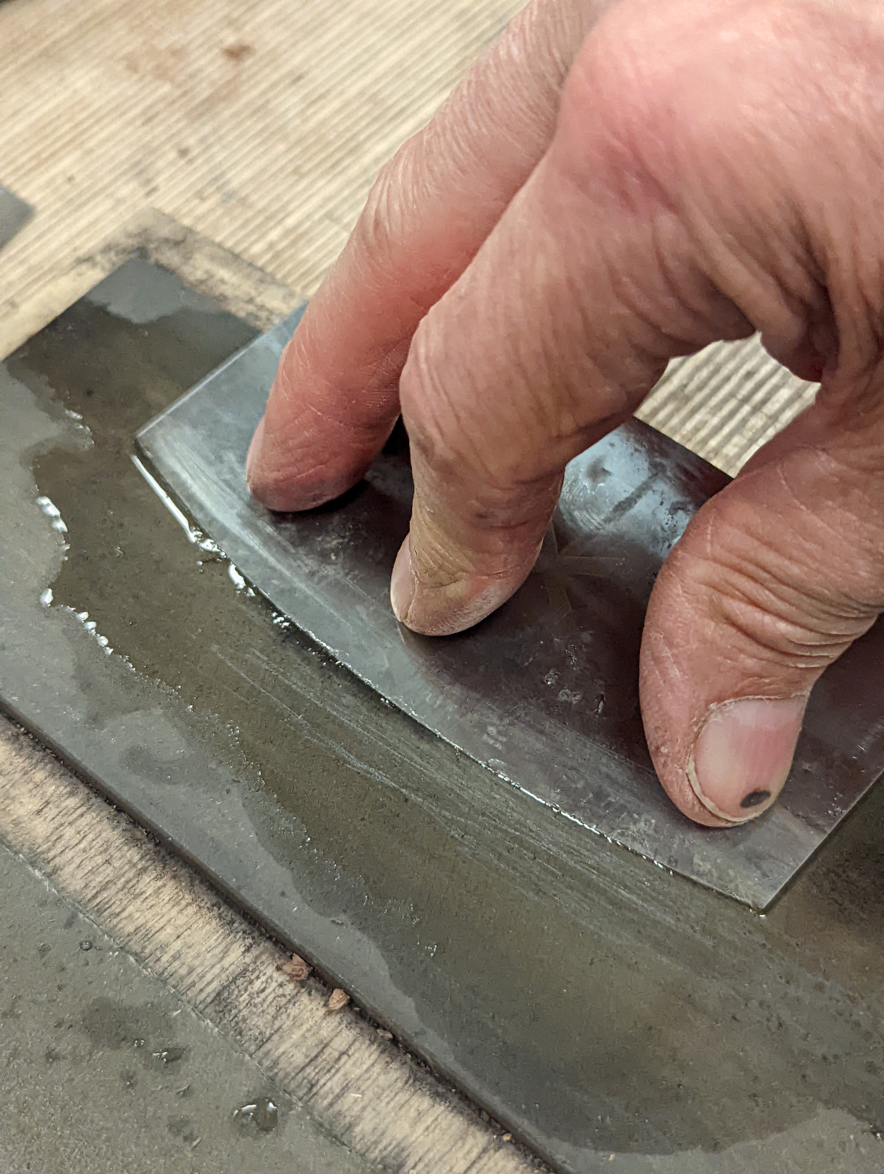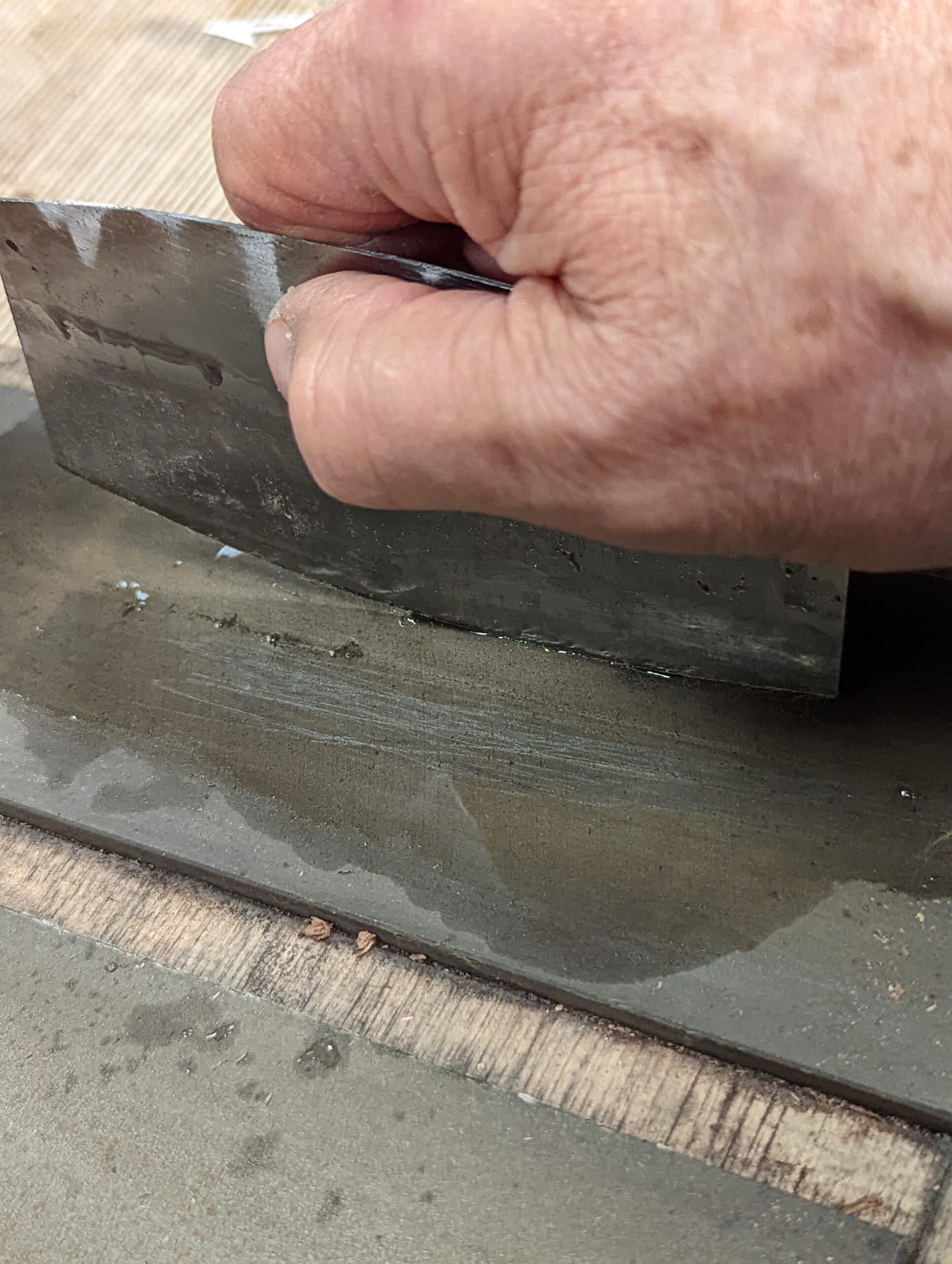 Consolidate both sides of the scraper plate on the benchtop 30 or so times. This sends the steel down into itself and also gives a super-polished edge ready for turning.