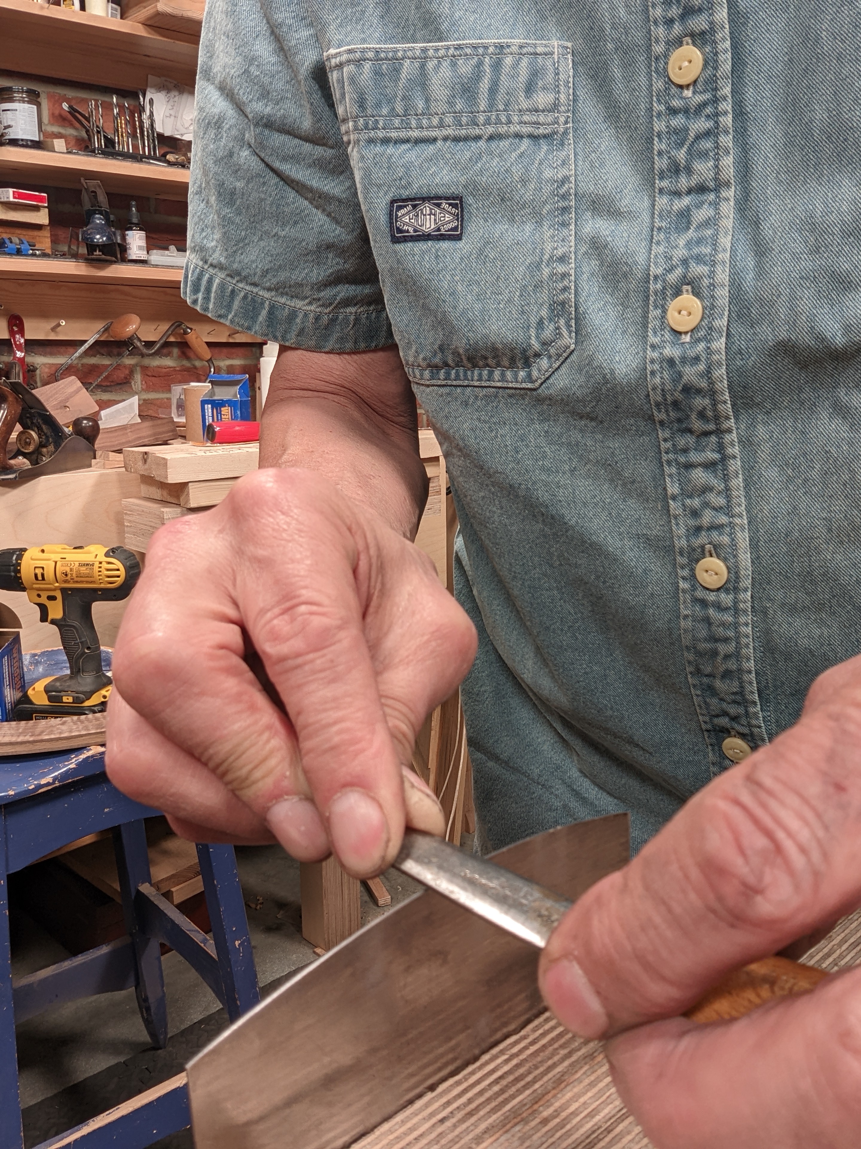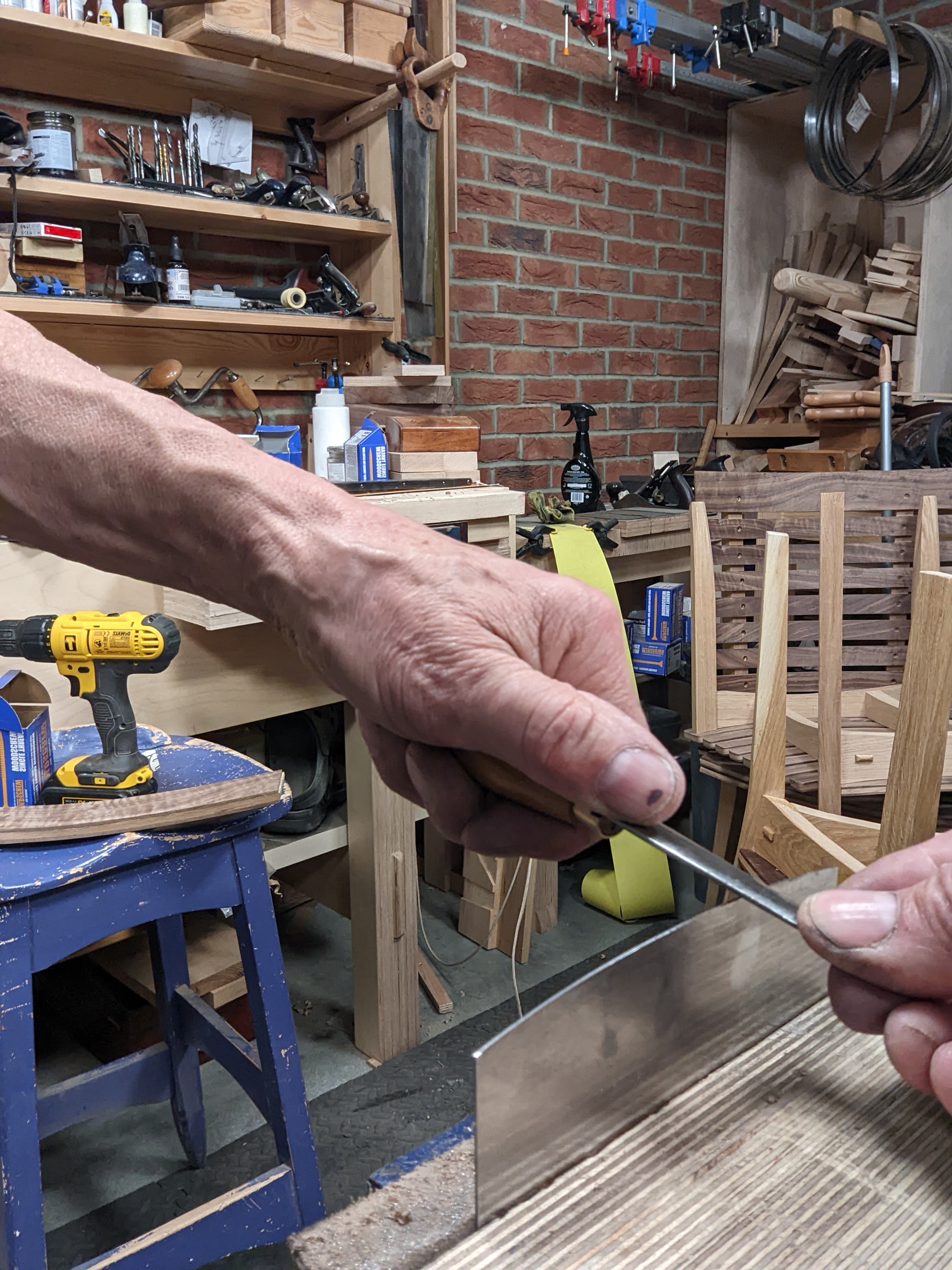 I scrape a lot, and I mean a lot and most days scraping is part of mu=y daily ritual in dealing with hardwoods like oak, sycamore, cherry, maple, walnut, ash, teak and so many more. Scraper is of course a misnomer for what a card or cabinet scraper is and I have never understood how the name became so fully adopted in the first place as this tool does not in any way scrape at all, it slice-cuts like no other edge tool and has the most sophisticated cutting edge of all the woodworking tools there are. I cover this extensively in my Essential Woodworking Hand Tools book too, how to create the edge you need to take care of every kind of wild and contrary grain. This cutting edge deals with everything you encounter and can be used quite locally with a simple flex of the steel beneath your thumbs or the heel of your hand. The question came to me as to whether the tool could be improved on and the answer is yes it can.