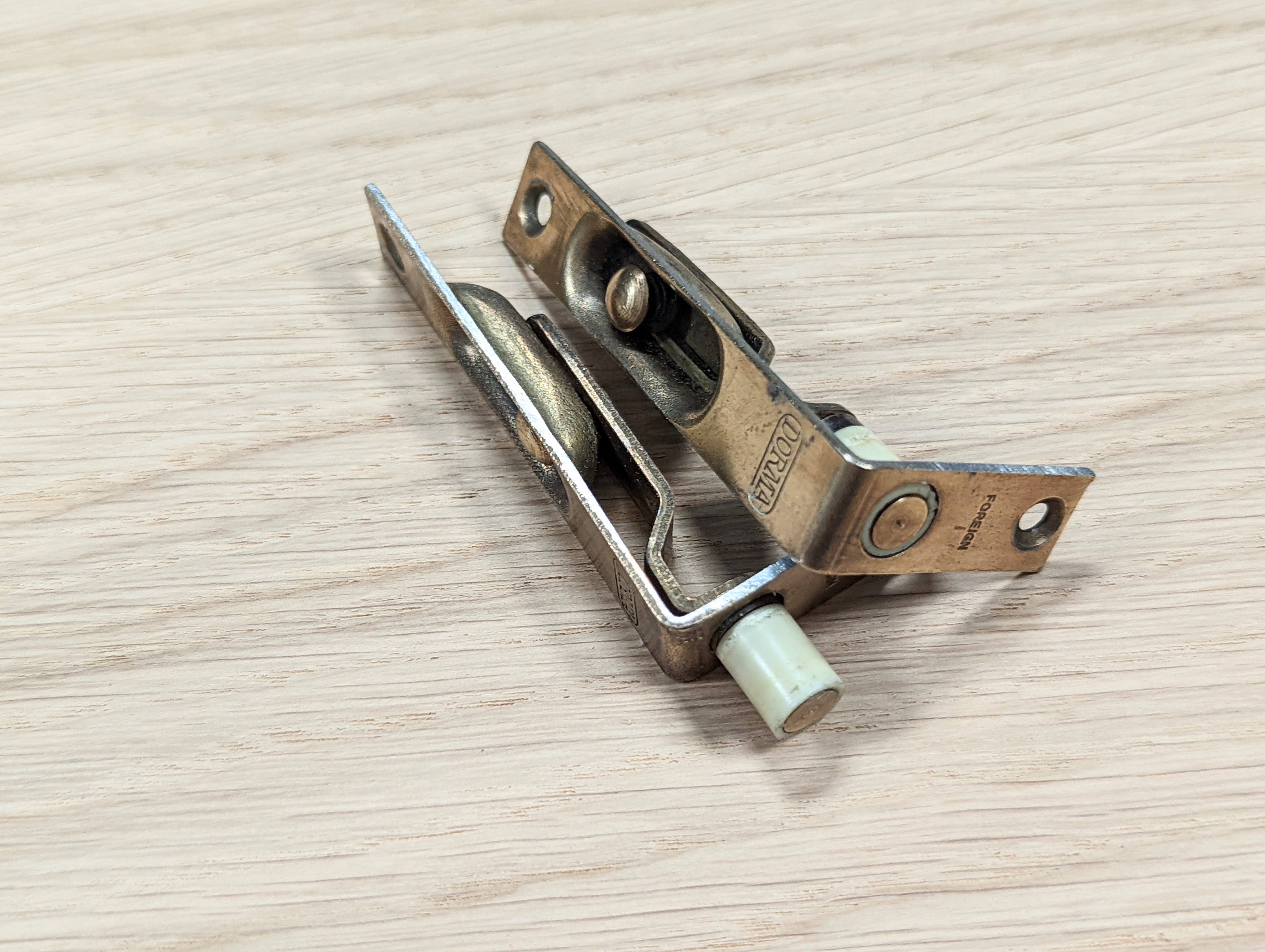 It took me longer to find the sliding bolt and I was looking for face-fixed versions because they are simpler to install but would have preferred a vintage version and even ones that were well worn if in good condition. But I came across many vintage versions that were 'let in' types and ones that were very nicely made from the days past. I ended up with some DORMA brand which is an old established supplier. In times past anything made outside of Britain would be marked 'foreign' just for clarity that the quality might be less than a made in Britain stamp. In this case, they were snazzy little bolts with nice features in that they would be barely visible when installed and had a neat little catch to them that prevented anyone from sliding a penknife in the gap to tease the bolt up to release the doors. To open the bolt you had to press the slider button in and the bolt bypassed the catch and unlocked the door. It's a nicely made unit altogether. You do have to watch for the word 'vintage' these days on eBay. Many Chinese manufacturers use the term loosely and manufacture goods to sell with vintage as the opening description in the title. I come across that all the time these days.