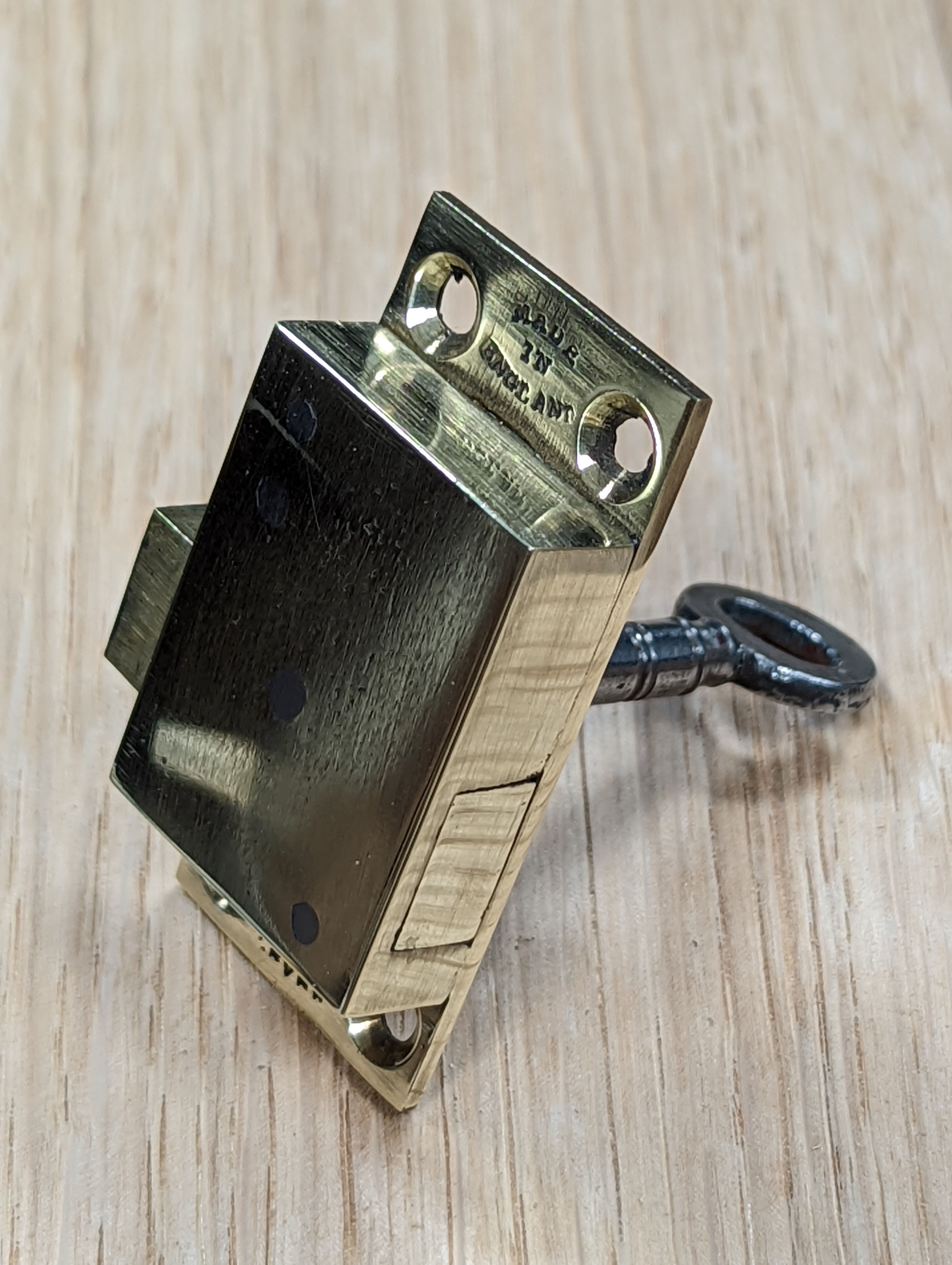 The final purchases are the cabinet lock and trim. I wanted a lock that was recessed and had a more traditional key type with a keyhole and an escutcheon. To avoid recessing, you could also consider a face-fixed lock like the neat one below. I found a couple of nicely made ones, one that came in today and the other one comes in tomorrow. This one, a simple two-lever lock, needs a little refining to get rid of some of the machine marks but in brass that's just a few rubs on abrasive paper and buffing out on a leather strop.