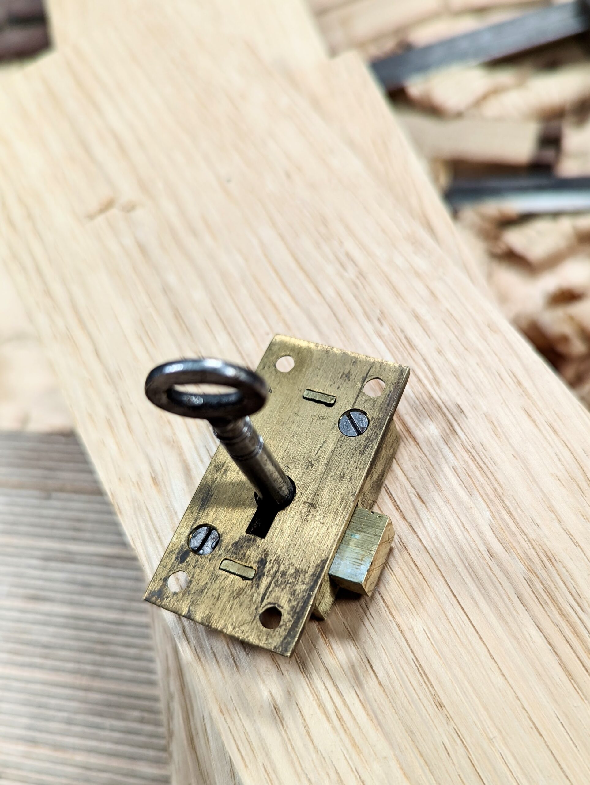 The final purchases are the cabinet lock and trim. I wanted a lock that was recessed and had a more traditional key type with a keyhole and an escutcheon. To avoid recessing, you could also consider a face-fixed lock like the neat one below. I found a couple of nicely made ones, one that came in today and the other one comes in tomorrow. This one, a simple two-lever lock, needs a little refining to get rid of some of the machine marks but in brass that's just a few rubs on abrasive paper and buffing out on a leather strop.