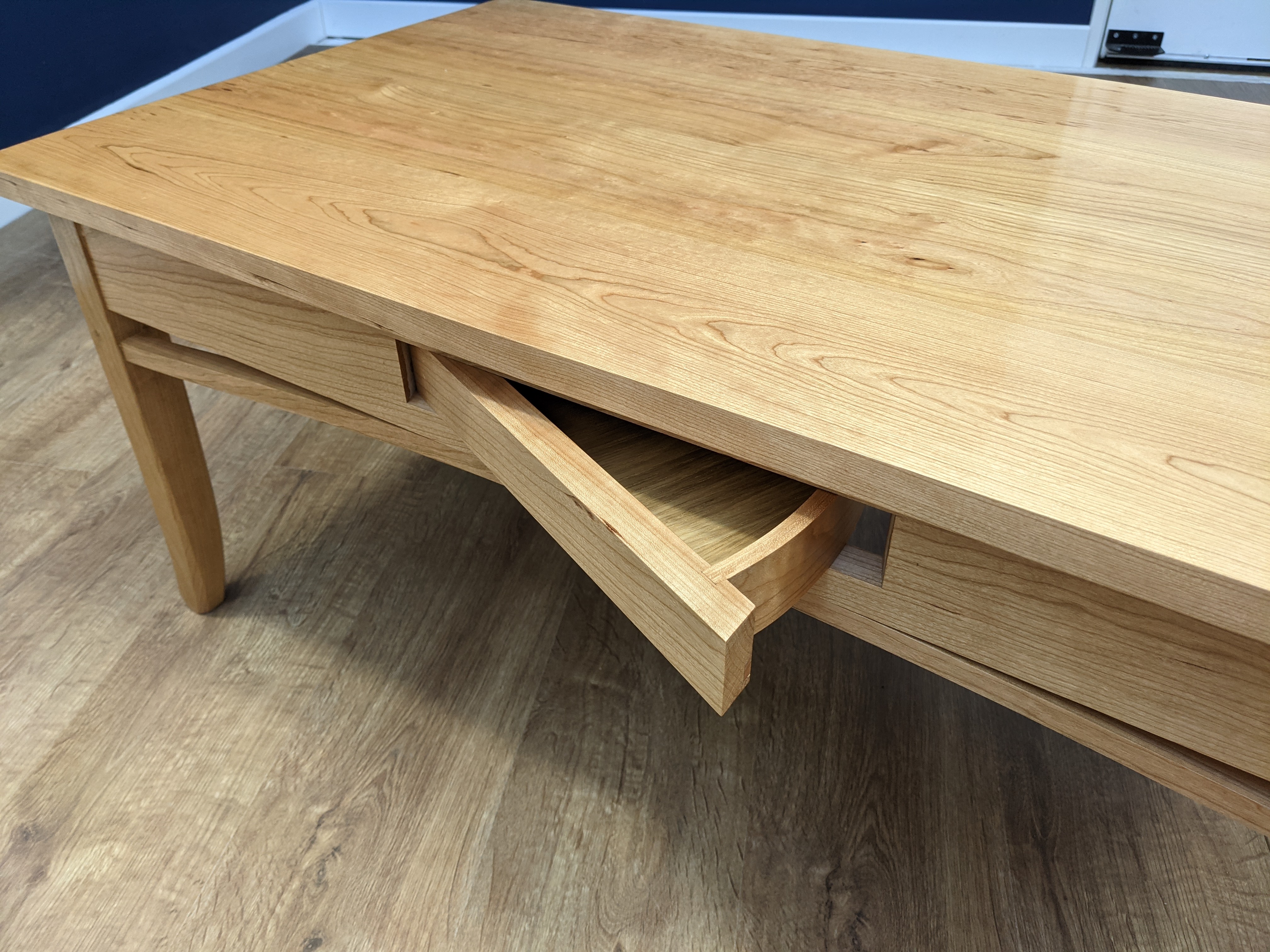 A coffee table usually has four legs and four rails and then the design stops. You don't need much to put coffee cups on, after all. But I stepped things up by adding laminated arching, curving the legs gave them a kicker but the unique feature is the swivel-out-of-nowhere I gave to the hidden drawer. It did make the table just a bit more complicated but not much and you can just leave it out if you absolutely know all the time where the remote is.