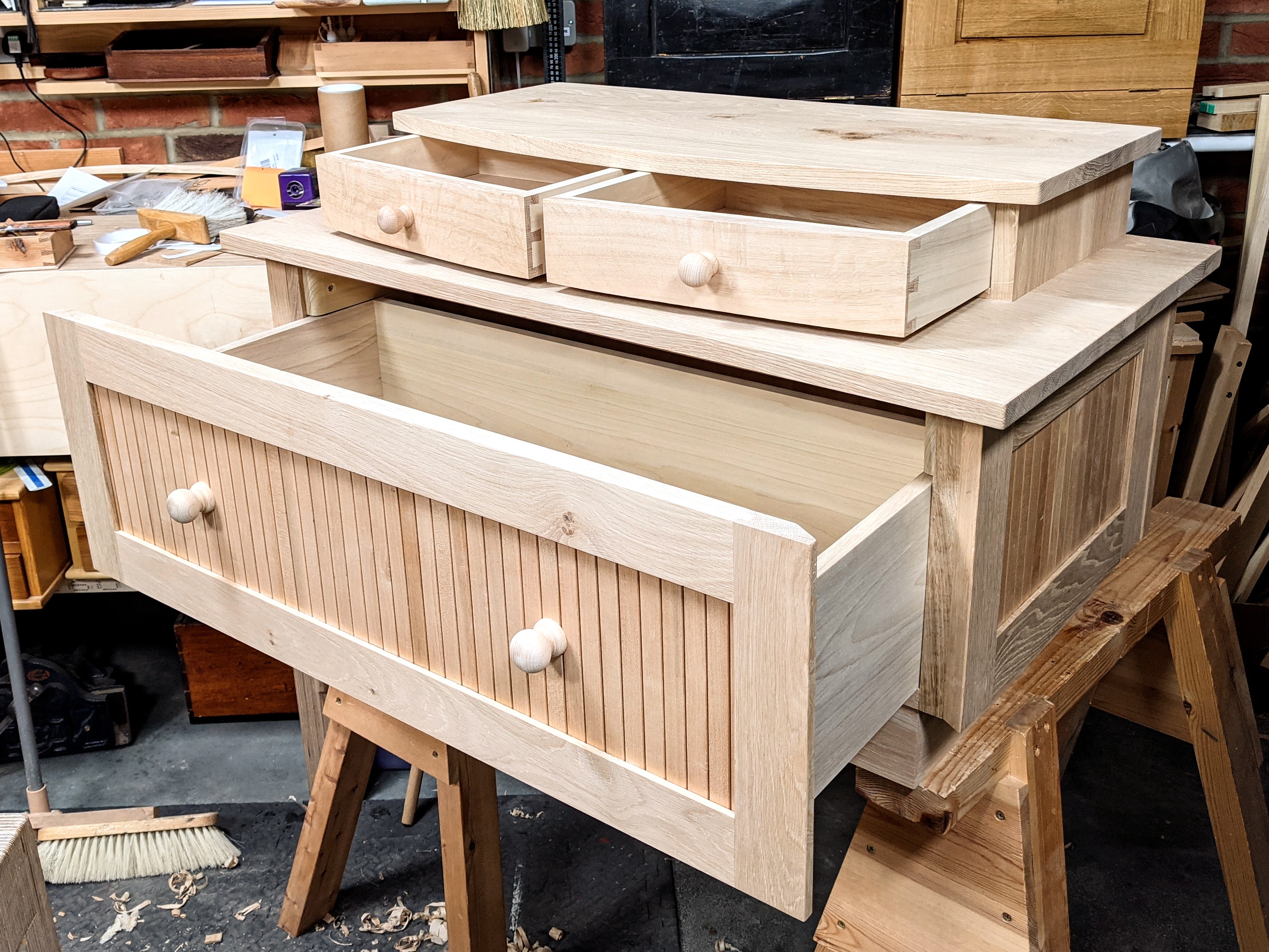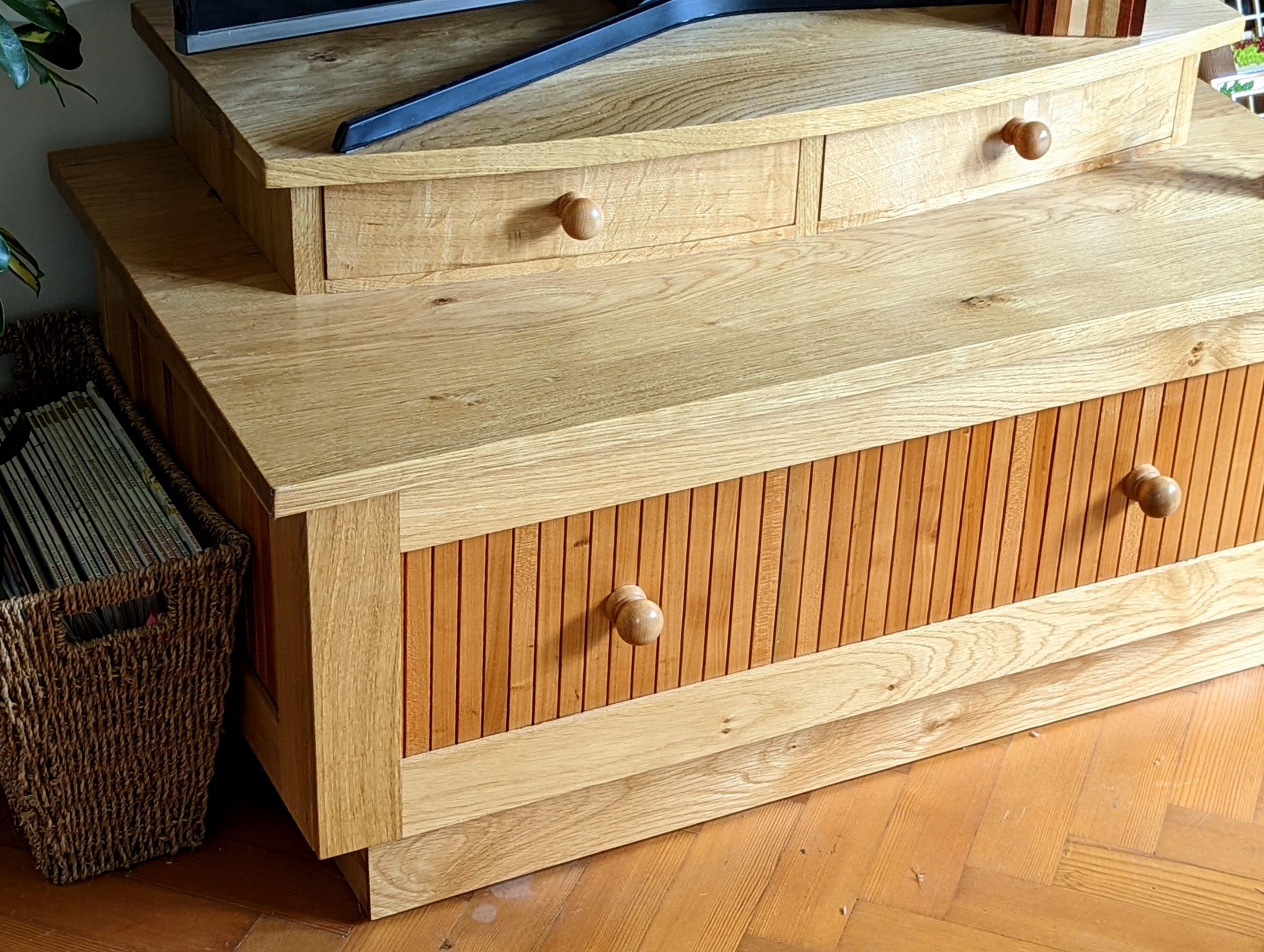Another complex-looking piece but remember you are never left guessing; I walk you through every step and stage so no guesswork here. I was not sure about this piece and made a couple of drastic changes before I finally settled on the design. One thing I do like is the huge drawer. For my grandaughter's toys it is wonderful but then two for a couple of snuggle blankets it's handy too. I think that the tambour look is highly unusual and my love for tambours was tolerated too. Cabinet-making skills are finely honed on this piece too and without it being complicated at all. Oh, notice the curved fronts meeting in the centre on the two top drawers. These are veneered as a book match--quite distinctive but not pretentious.