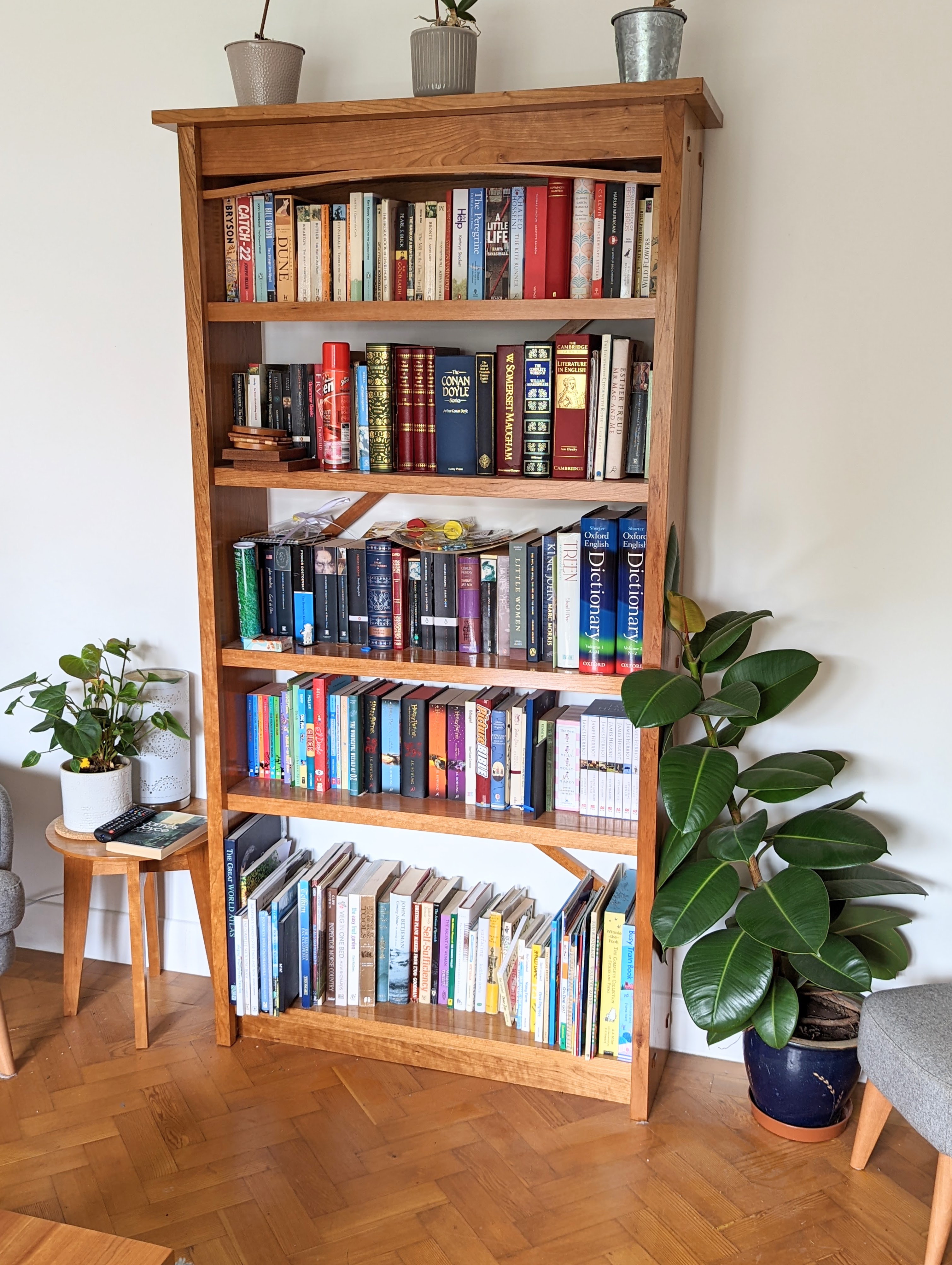 I doubt I could manage without a bookshelf or yet more bookshelves. I took the arching from the coffee table and kept the lighter look I really wanted. Through tenons combined with housing dadoes are unusual but add an intrinsic strength most bookcases lack. You could shove this bookcase still full of books and it would not suffer the lateral stresses that most bookcases suffer in the day-to-day of home life at all.
