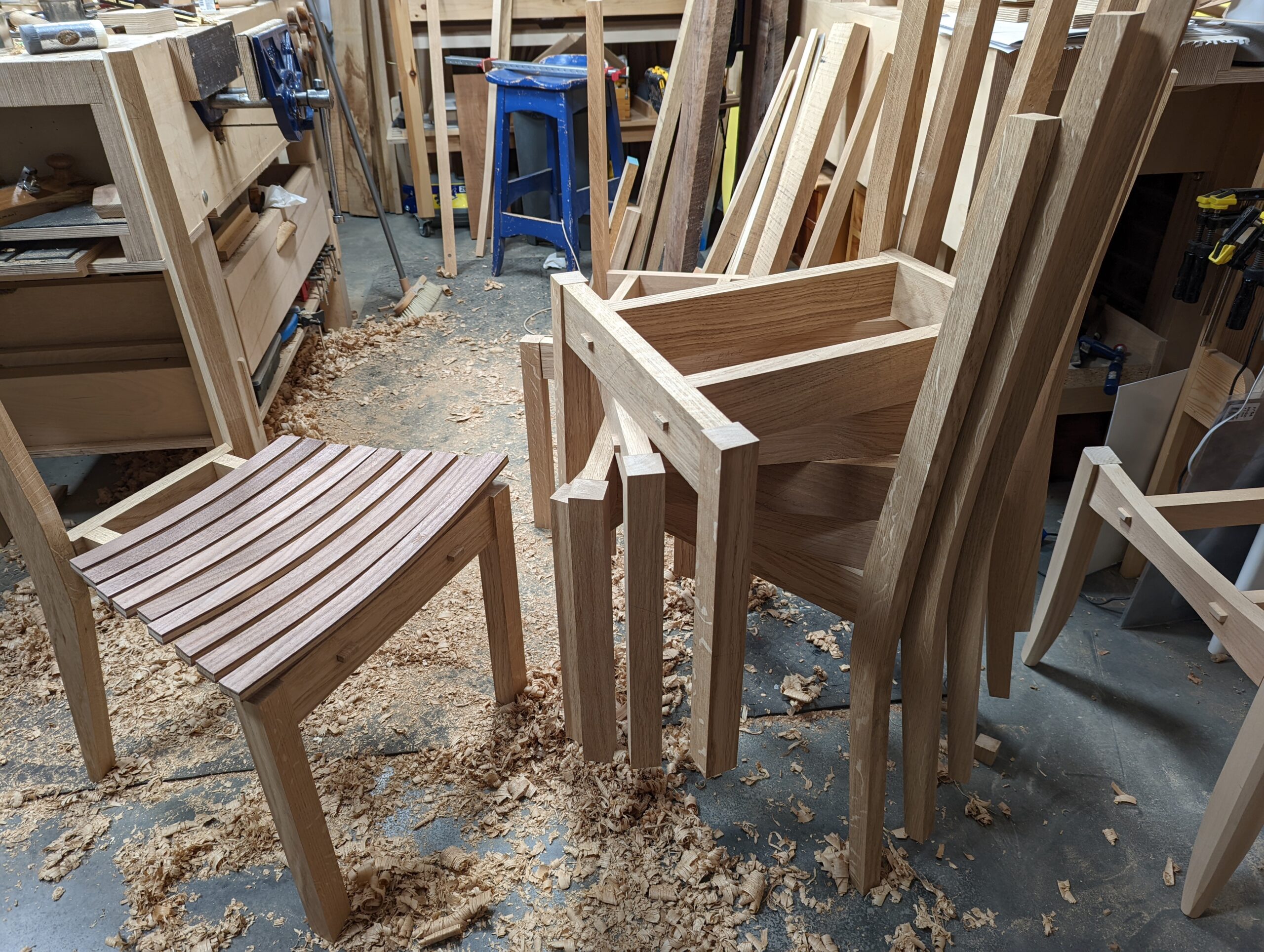 So, ten months on, yes only ten months, and remember we made every one of these without buying in preprepared, planed foursquare wood precut but used rough sawn boards we then planed up by hand. No jointer planer, thickness planer, tablesaw, mortise machine, drill press and not even a chopsaw and such. I cannot emphasise how much fitter I am than when I was 50 years old now at 72 years old. I feel like I have been given a new lease of life despite wars, COVID and much more besides. I put this down mainly to the work I do use my whole body and mind.