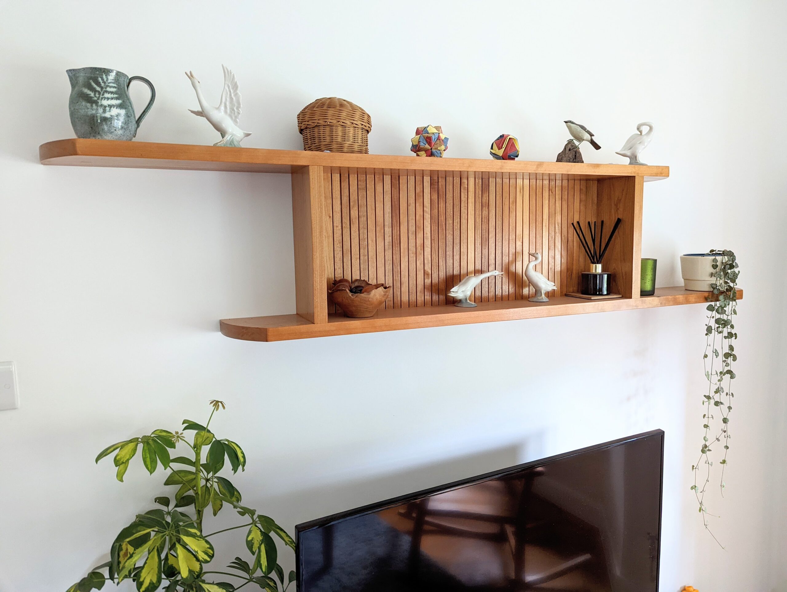 A blank space can be great for displaying creative pieces alongside plants and more. This was designed to go above the TV stand so I snatched the faux tambour panel for the backboard as an unusual contrast for the displayed pieces. It came out fine.