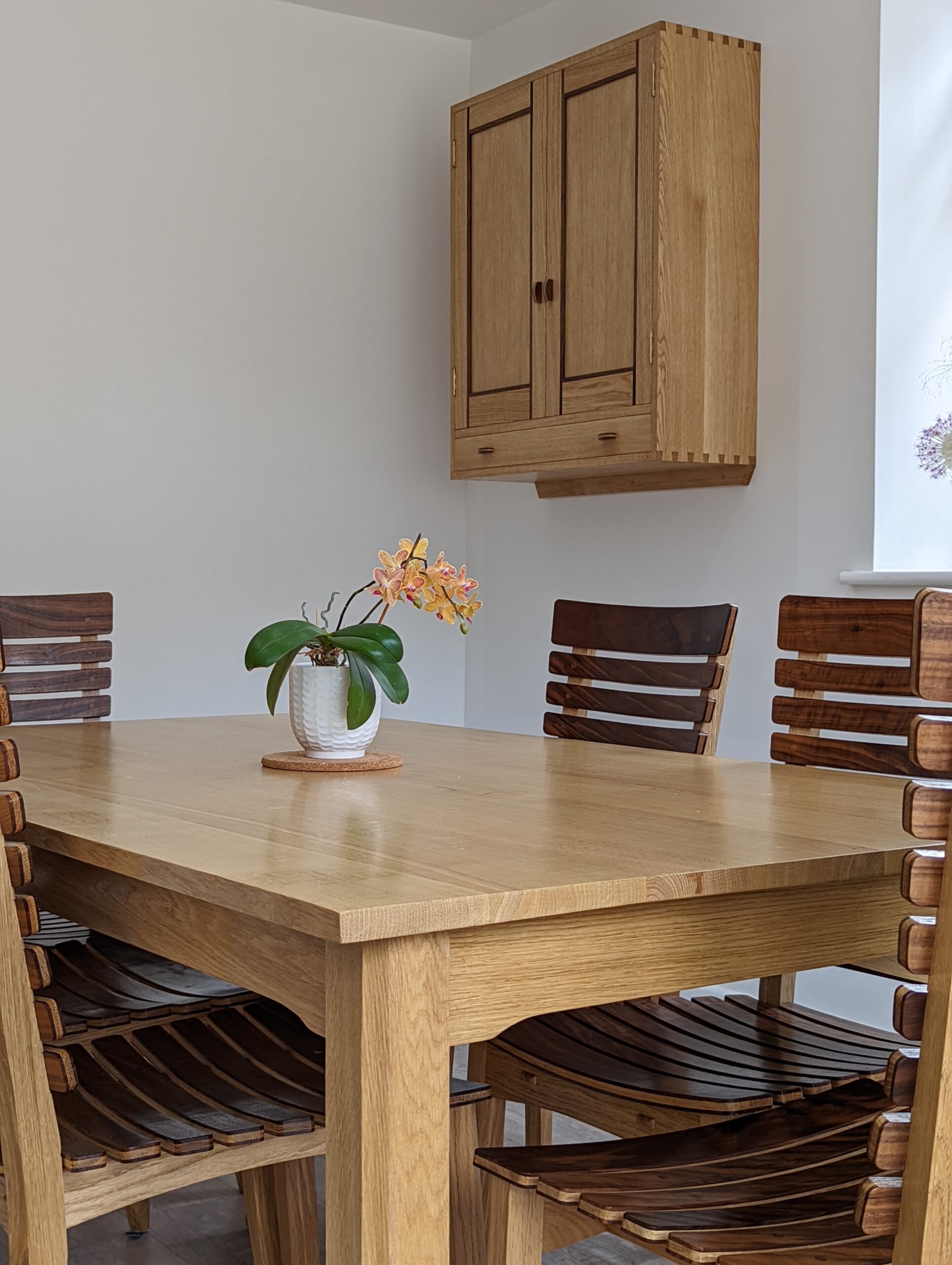 My last project came in May as a prototype and was installed on the 15th of July 2022. Again, it is another new design concept complementing the dining table and chairs with contrasting woods -- Oak and American black walnut. Notice how the handmade handles connect the piece to the dining chairs by sandwiching oak between layers of black walnut and the added black line contrasting the frame of the doors.