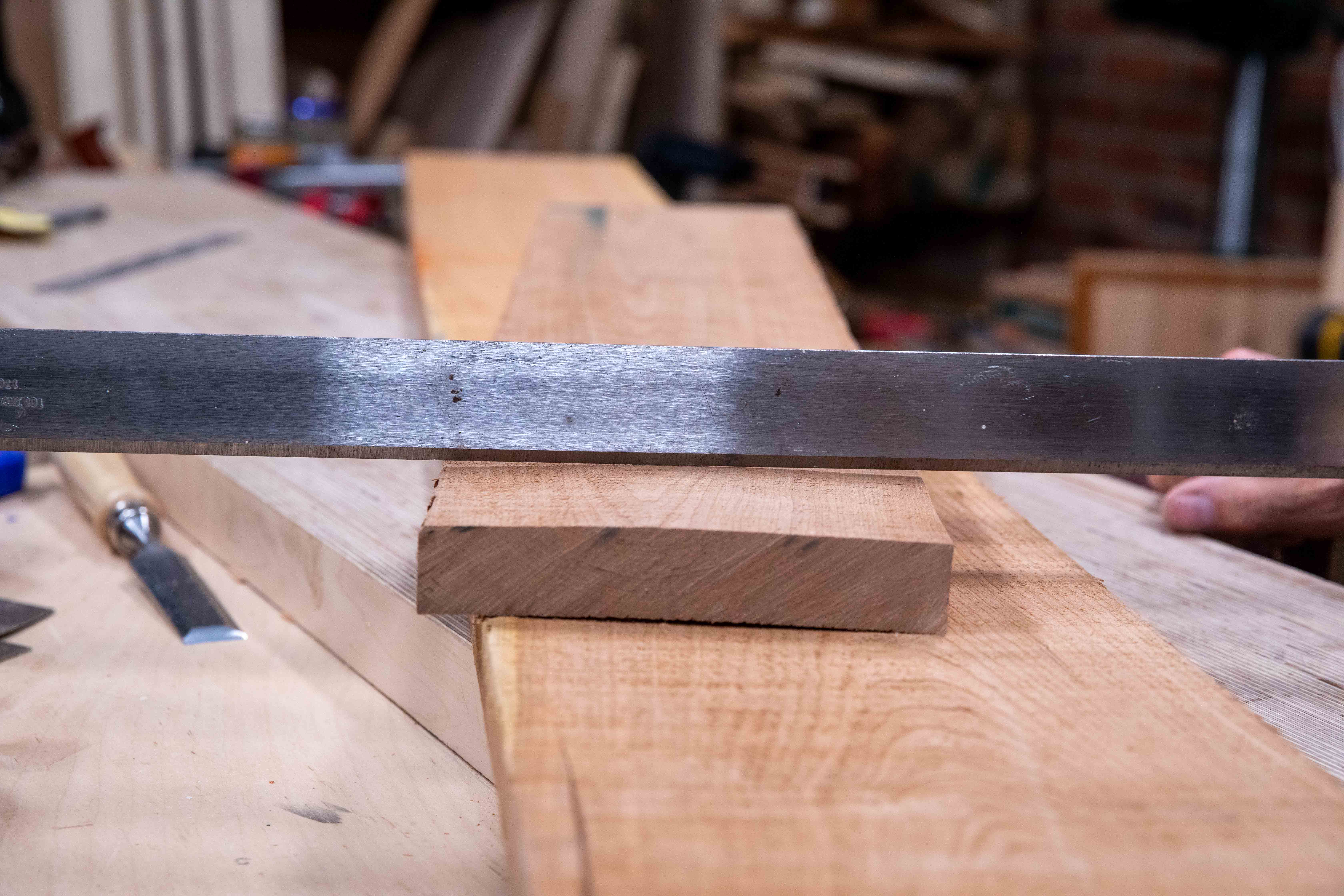 Metal or wood, straightedges keep us in line when we are working on layout and such. They must be straight and you can buy commercially made ones in addition to making your own. A 24" metal one is very good for checking straightness and wooden versions can be made for longer ones for almost nothing. To check for straightness when made, and correcting if needed, check against the edge of a piece of plywood. Plywood, a decent grade, is almost always dead straight.