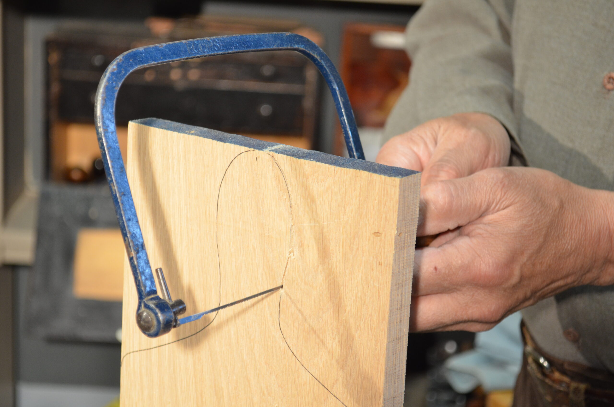 The coping saw copes with all things curved in cuts. Simple and effective and best used with the blade turned so it cuts on the push stroke and never the pull.