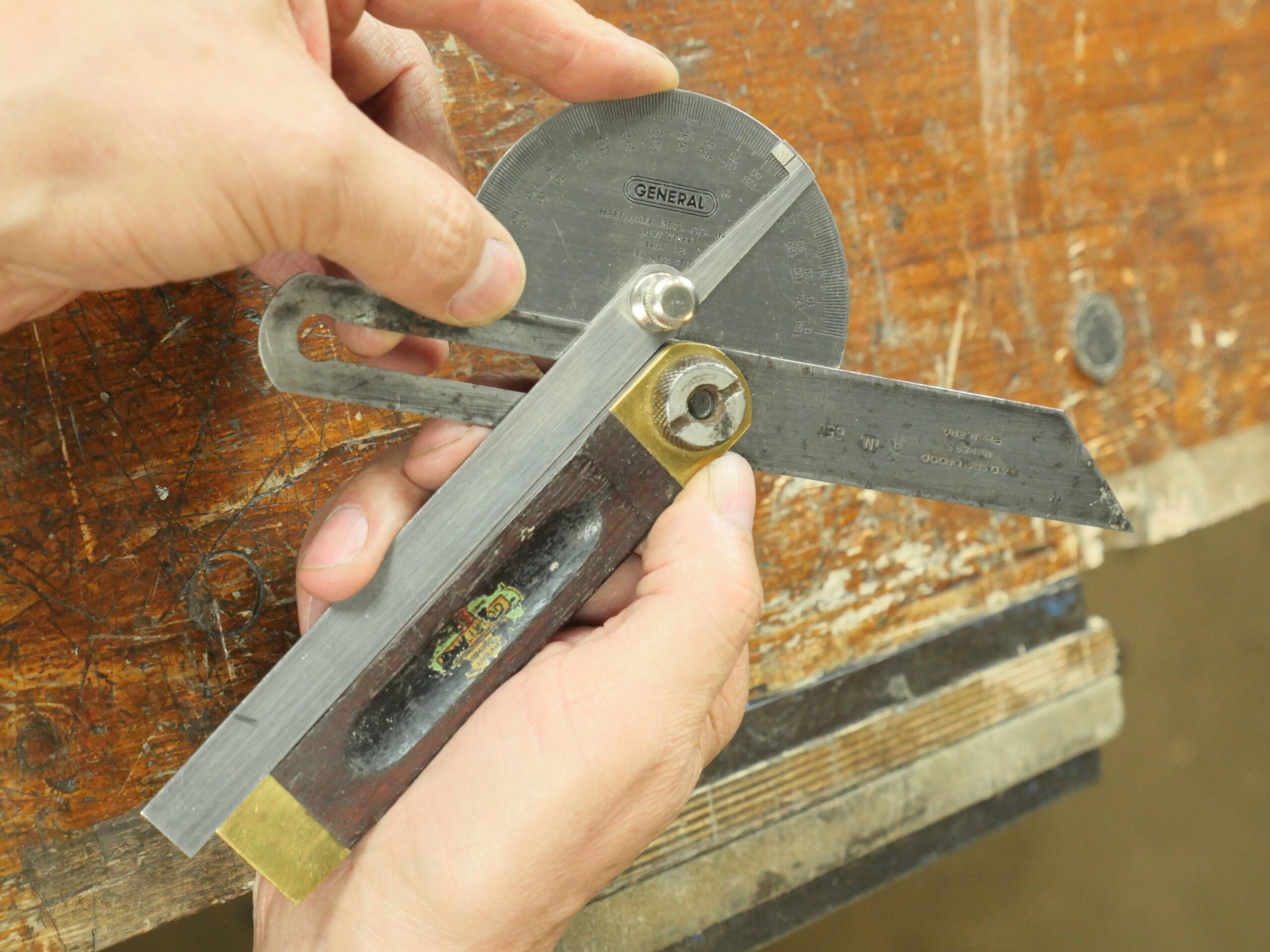 The sliding bevel is the tool we use to transfer angles from a protractor to a workpiece or to check the angle of a workpiece to find the exact degree. We also register it against a sawn or planed edge cut to an angle to test for accuracy. I usually have two or three because things like chair making may have several angles to work to and having them set keeps the accuracy we strive for and saves resetting mid-project.