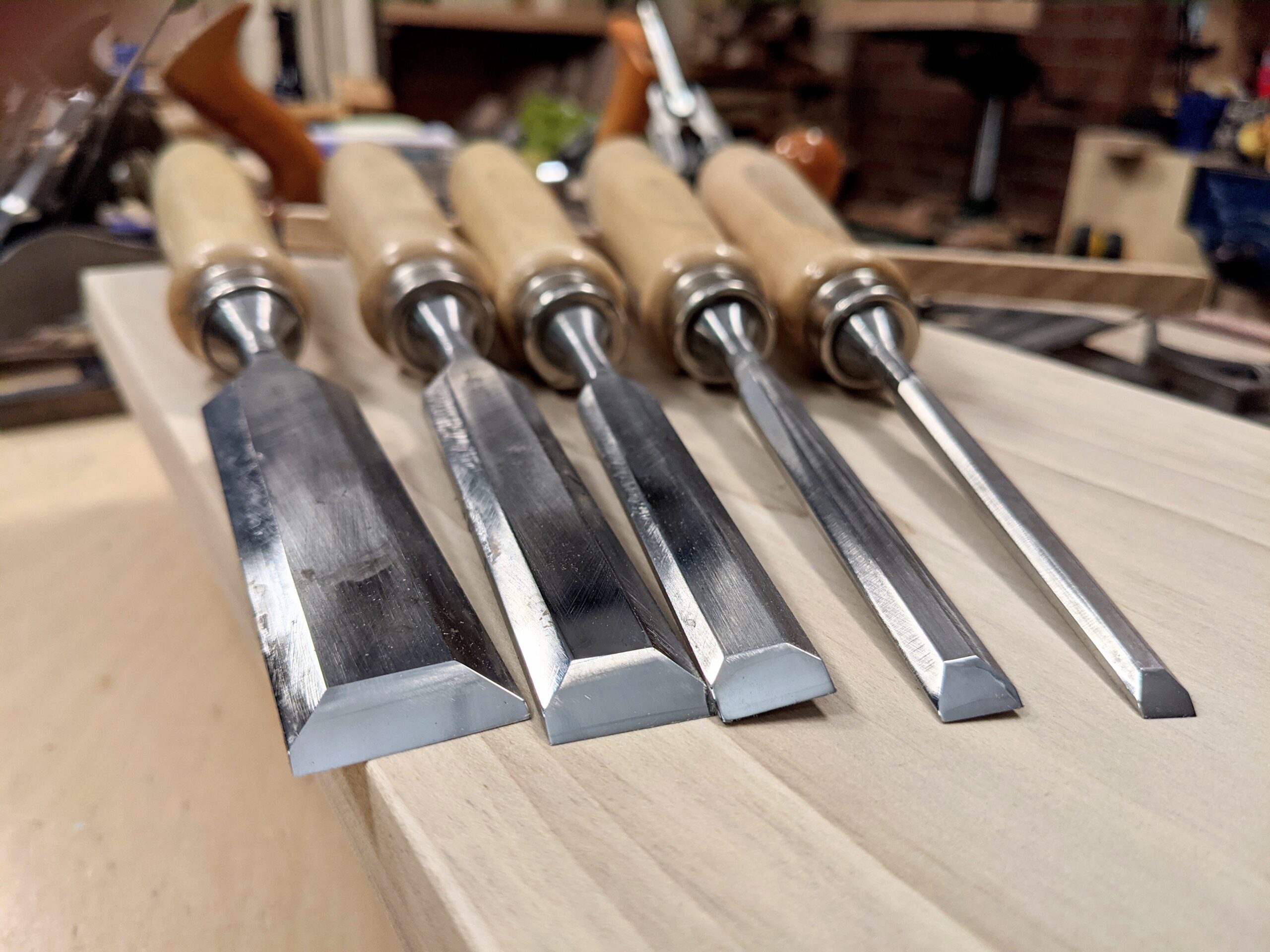 You don't really need much by way of chisels. Bevel-edged chisels really are the best for the widest range of tasks including mortising, paring and chopping for dovetails, trimming, recessing and much more. In fact, I cannot see anything that other chisel types do that these chisels shown below don't do equally well. I use a simple set of five basic bevel-edged chisels in the everyday of my working wood. I do not keep special chisels for the finer work. These do it all. There is really no need to pay more than £10-15 per chisel but you can get some sets for much less than that. People will tell you that thin-edge, refined chisels with super-thin sides are necessary for fine work like dovetailing but that's not the case and not true at all. I think that the main reason for thinner-edged versions is that they just look nice and thereby seem better balanced and that's as good a reason as any of you want to spend more. I will also say that when something looks nice and feels refined you might feel better about your work and your working so that is good enough. Most joiners I knew and worked alongside cut perfect dovetails for fifty years with square-edged firmer chisels with no issues. We've become more and more spoiled and of course, engineers have to keep inventing problems so that they can offer a solution with something more that they want to sell but there was no problem to start with. Take the thick-ironed clunkily-heavy plane to dispel plane-iron chatter as an example and then too the Bed Rock frog in planes to set your plane without taking out the cutting iron assembly. What not one of them tells you is that when you adjust the Bed Rock frog, which you need to do once in a few years possibly, you actually change the depth of cut automatically but there is no way of knowing by how much. Go ahead, try it! You adjust the frog to close up the throat for that really awkward grain and then you tear out the grain because you increased the depth of cut and ruined what you were trying to fix in the first place.
