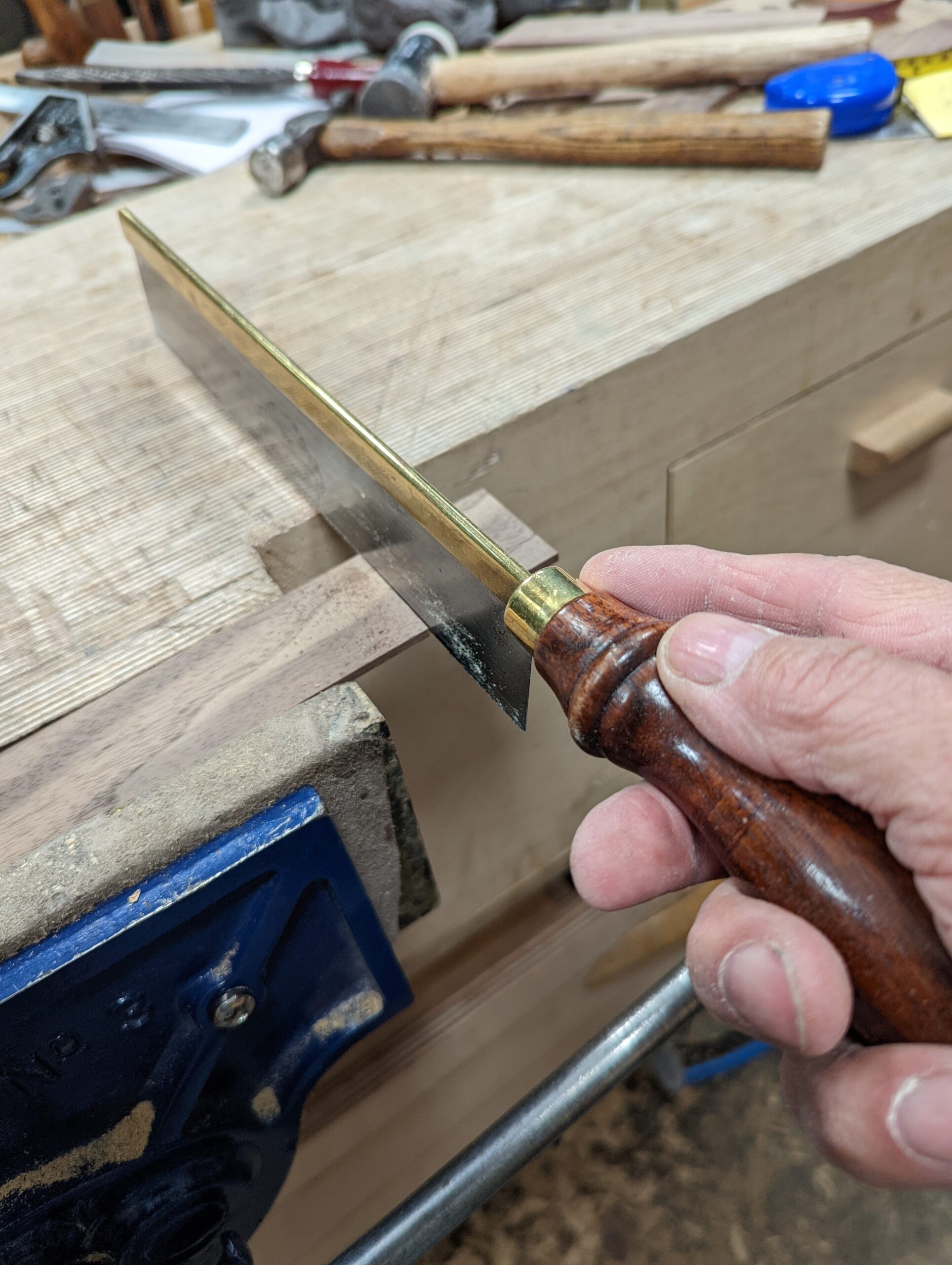 I have used a few handsaws on the projects but mostly I rely on my 22" panel saw for crosscutting and 24" panel saw for ripcutting. I can recommend the Spearb & Jackson versions new online via Amazon sellers. I have paid as little as £13 but generally, they go for around £22. They are a lifetime saw newly made for and by S&J. The only modification I have made has been to reshape the handle and that is a preference not at all a necessity. You can see the changes I made below. It takes me an hour to do this.. My panel saw has 10 points to the inch (PPI) and this saw will do most sawing for where larger effort is needed as in cutting panels and cross cutting boards and sections of solid wood A 24" version works well for rip cutting and has 7PPI.