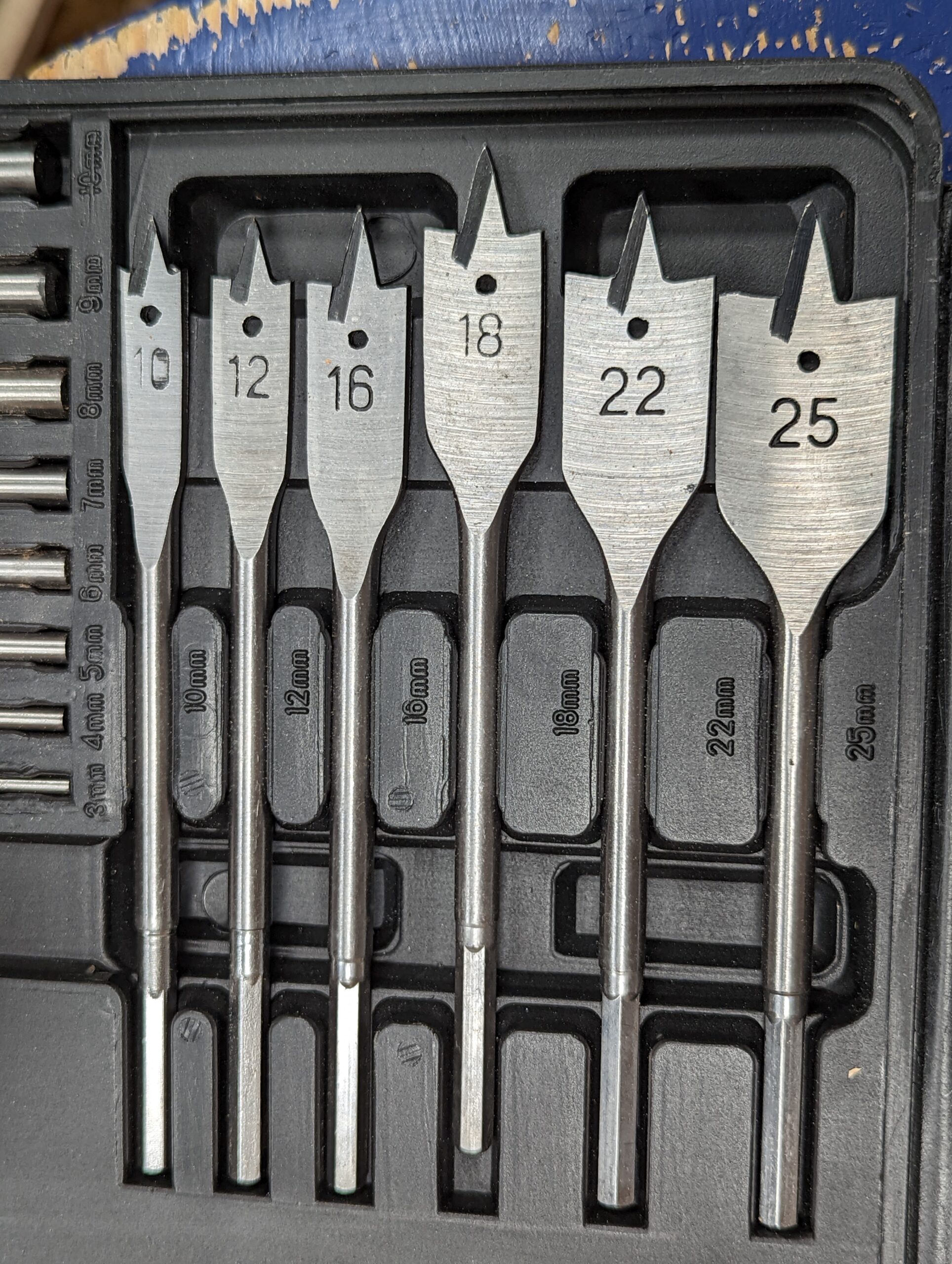 Paddle bits are not made for use with a hand (swing) brace as they rely on high speed to cut efficiently. Thankfully, they are resharpenable and need it from time to time for a clean cut. These bits are not too sophisticated and that is what makes them very easy to sharpen with just a flat file. They rely on shear-cutting both along the sides of the bit that establish the walls of the hole and then the actual cutting faces either side of the spear point. In other words, unlike the augre bits, twist drill bits and Forstner bits, which all have raker cutting faces and side cutters for the walls of the holes, these bits have no such cutting edges but high speed helps them to more 'scrape' the wood for deepening penetration.