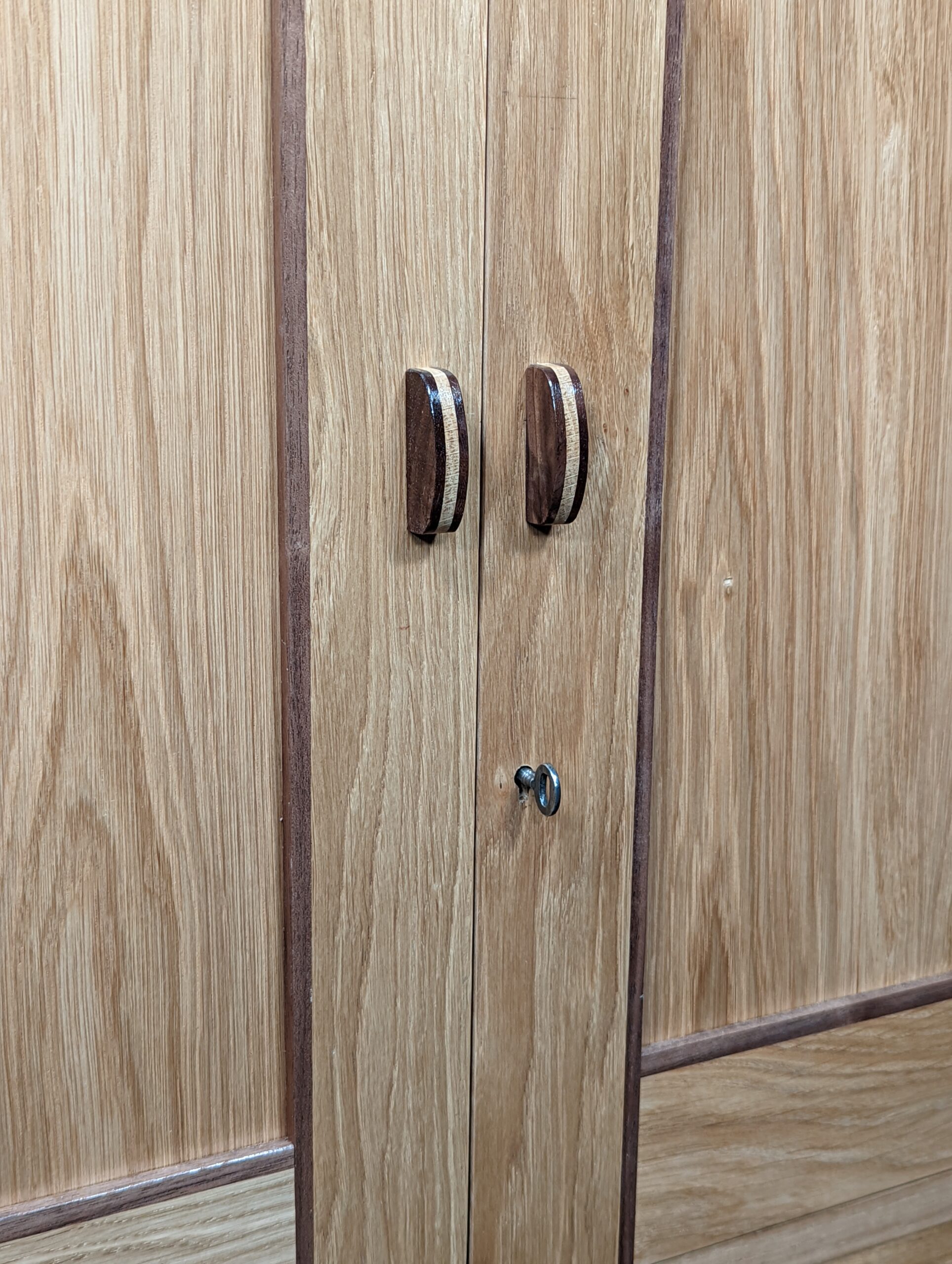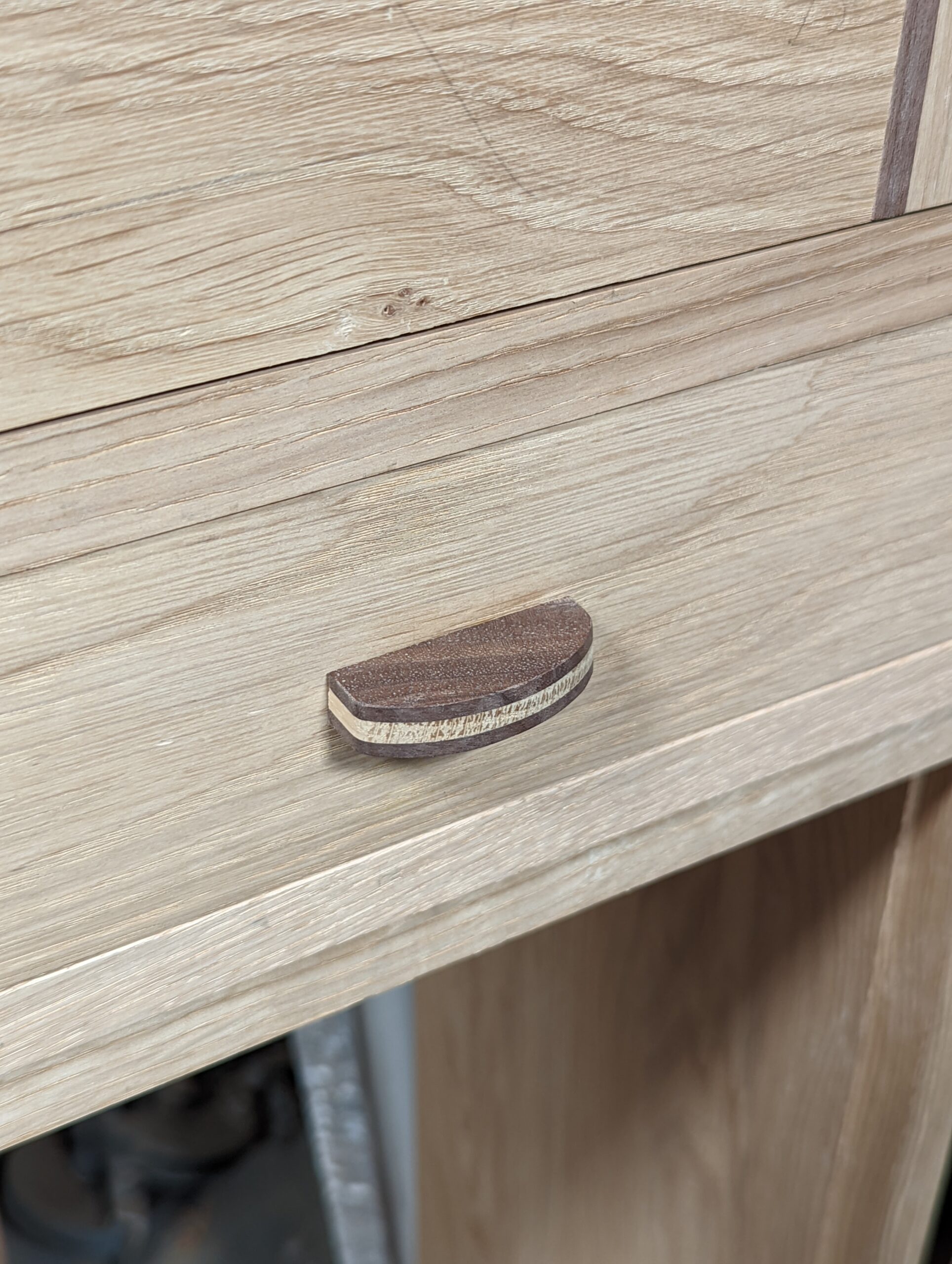 For my latest piece, I chose the oak and the walnut to tie in with the dining chairs I made but in a small way. The cabinet itself is our latest offering for Sellers' Home designer build project where we design every piece of wooden furniture for a home. This is an unparalleled training concept for teaching and encouraging woodworkers worldwide to build their own houseful of furniture stick by stick and stem by stem. I made these simple handles from scraps of oak and walnut that fell from the saw.