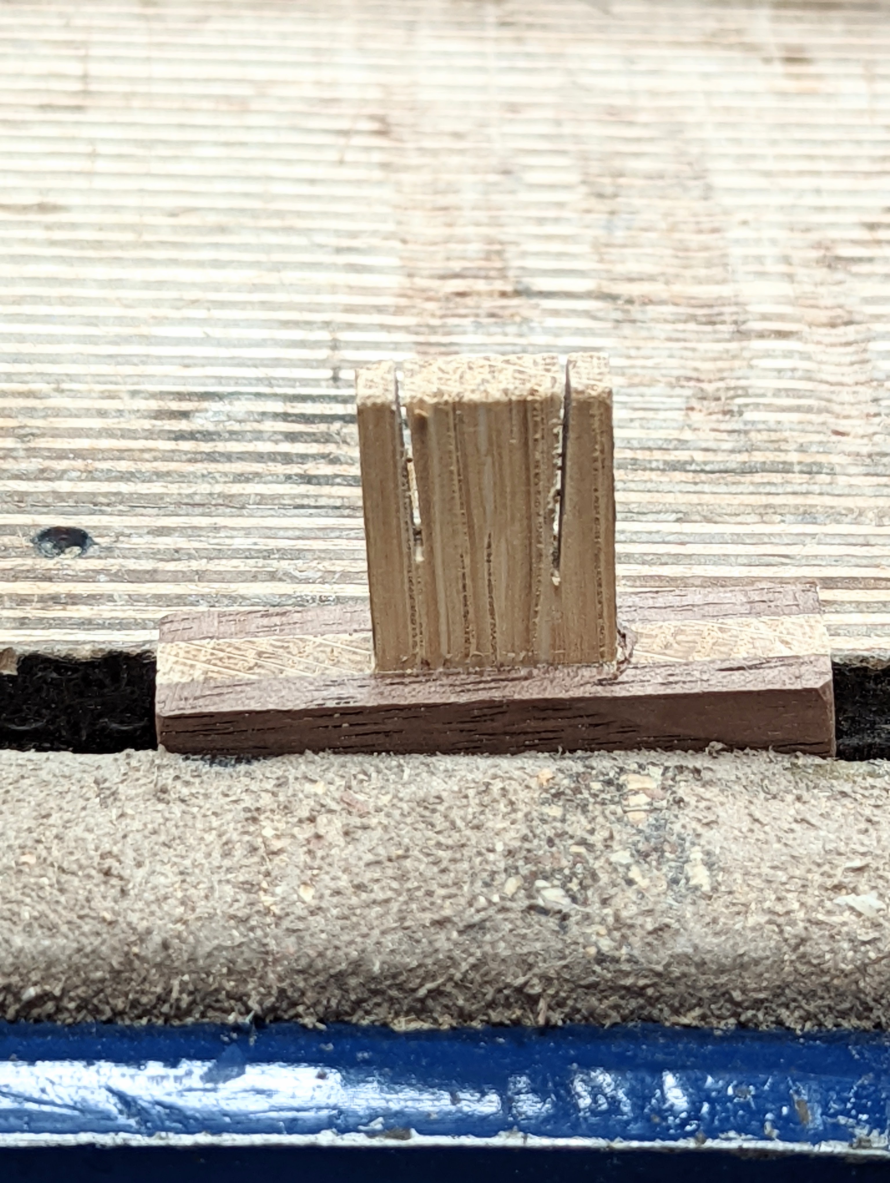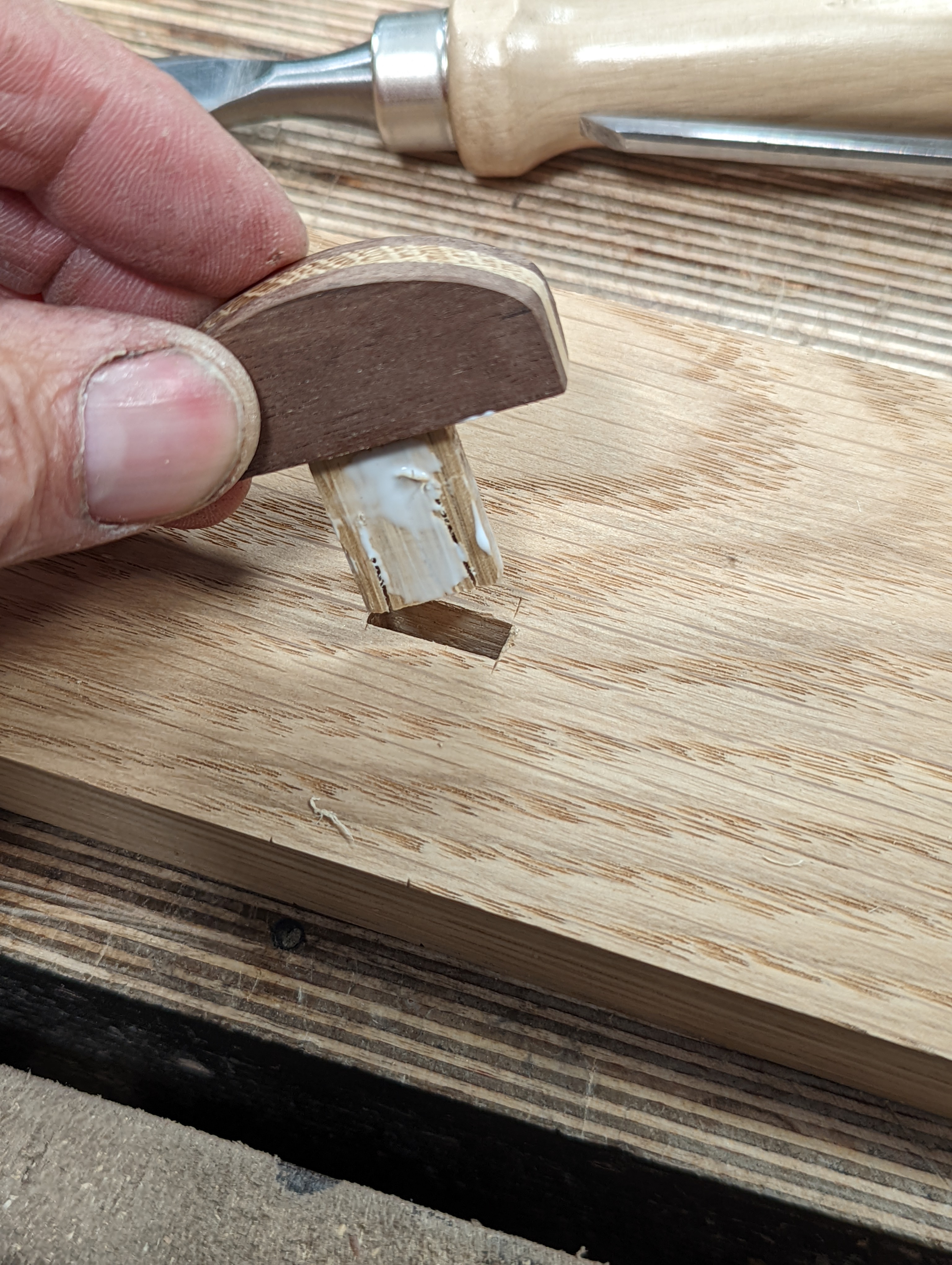 Making the handle is basic. I sandwiched a section of 3/16" oak between two outers of 1/8" walnut and then cut a 5/8" wide tenon to the oak 3/4" long. I shaped the outer to a simple radius with a rasp and file and then mortised the drawer to receive the stem of the tenon.