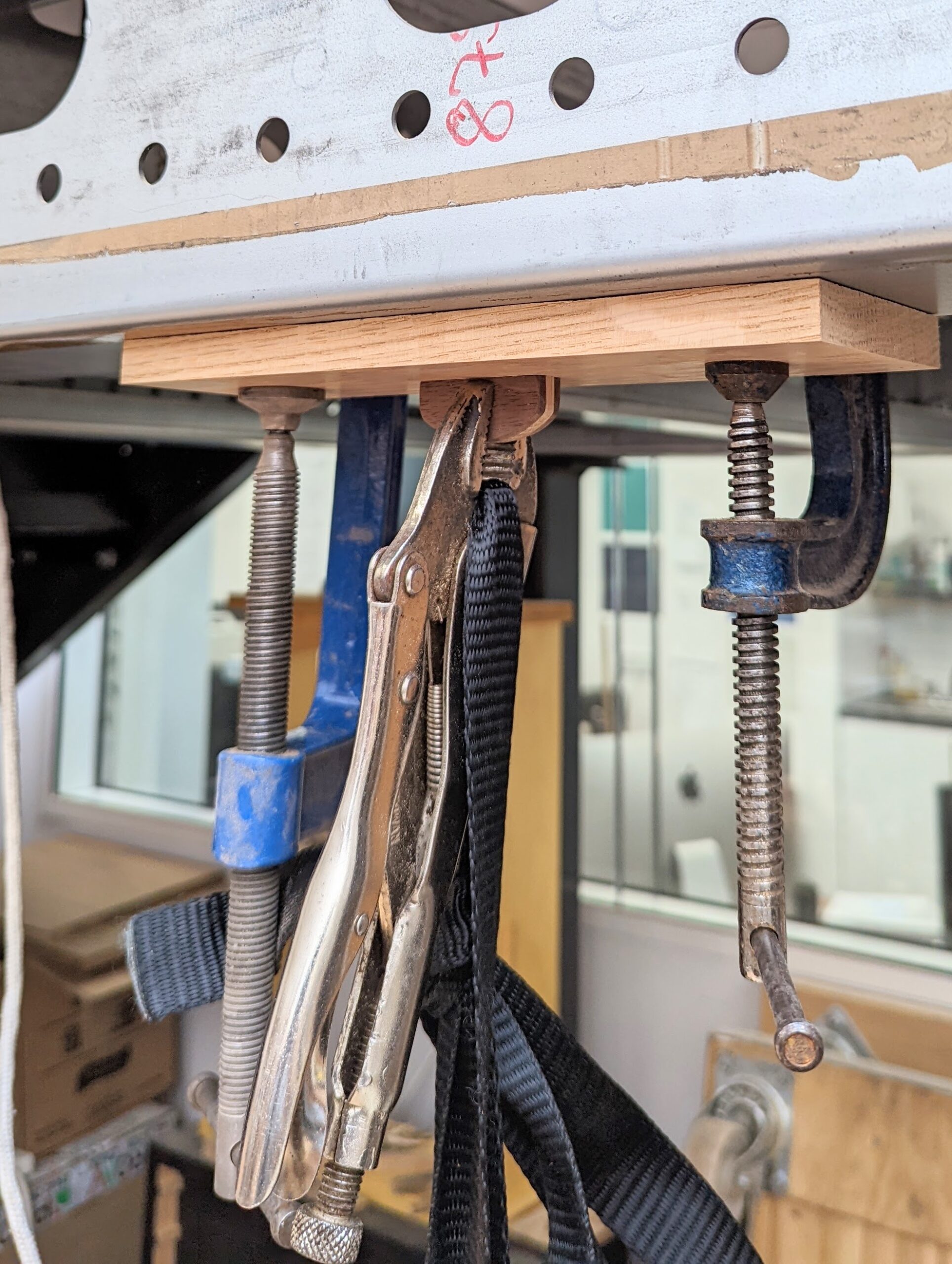 Once dry, I hung the sample piece for testing from the underside of a steel beam and clamped some spring-loaded grips to the handle.