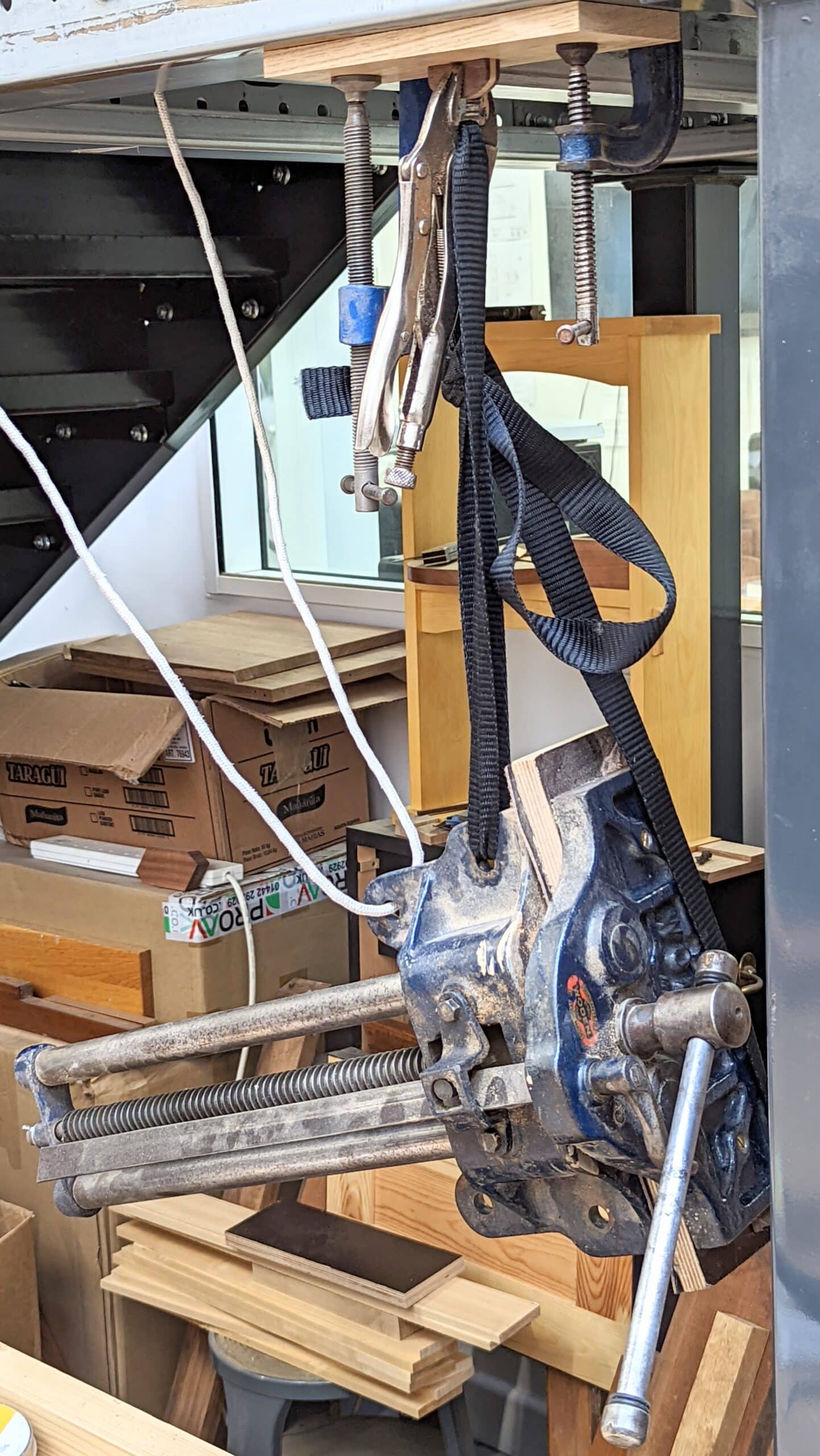 I then hung a 44lb (~20 kilos) vise from it as a test for the pulling resistance intrinsic to the wood. I think I could have doubled the weight but I need to get on with my work.