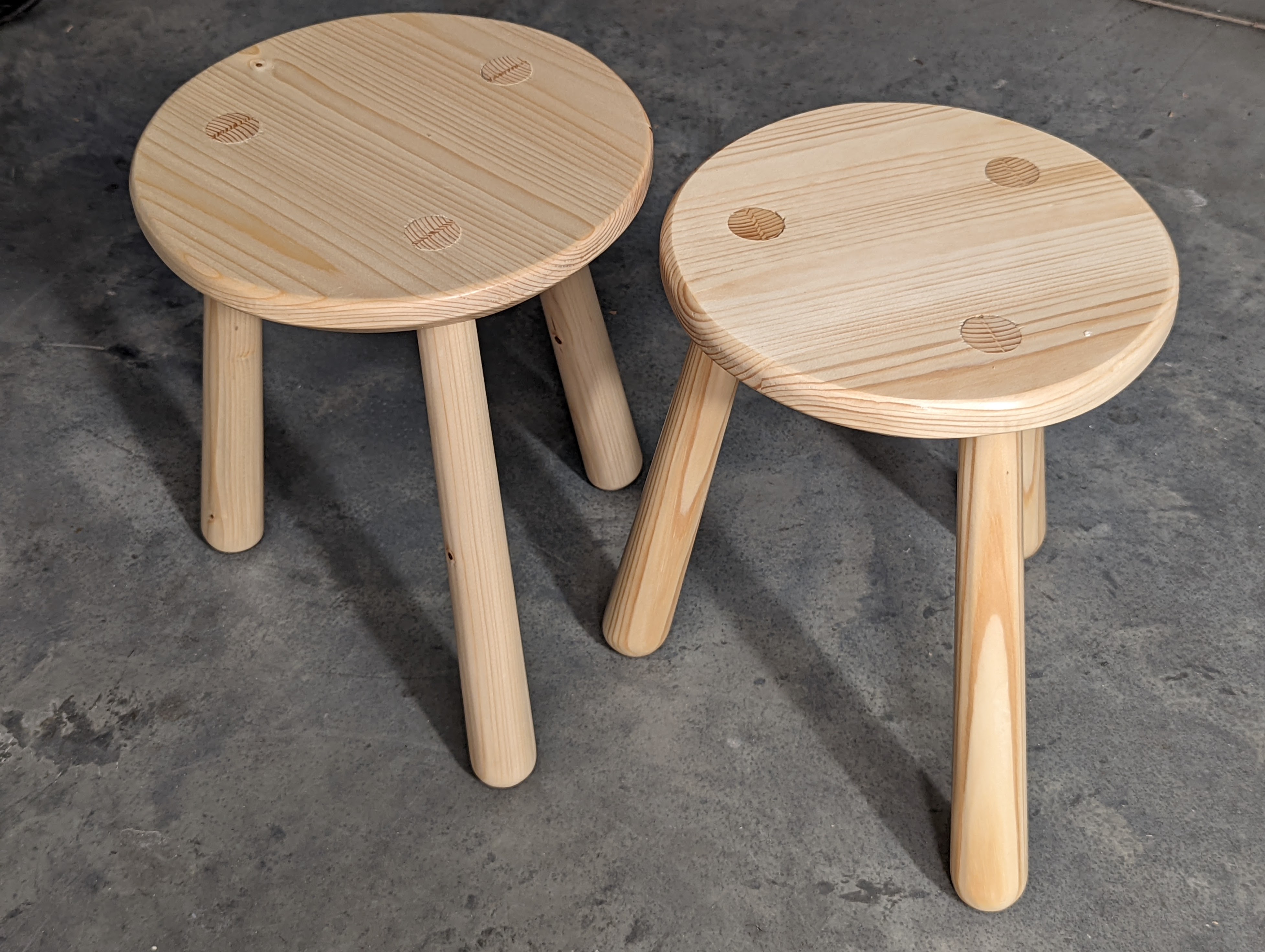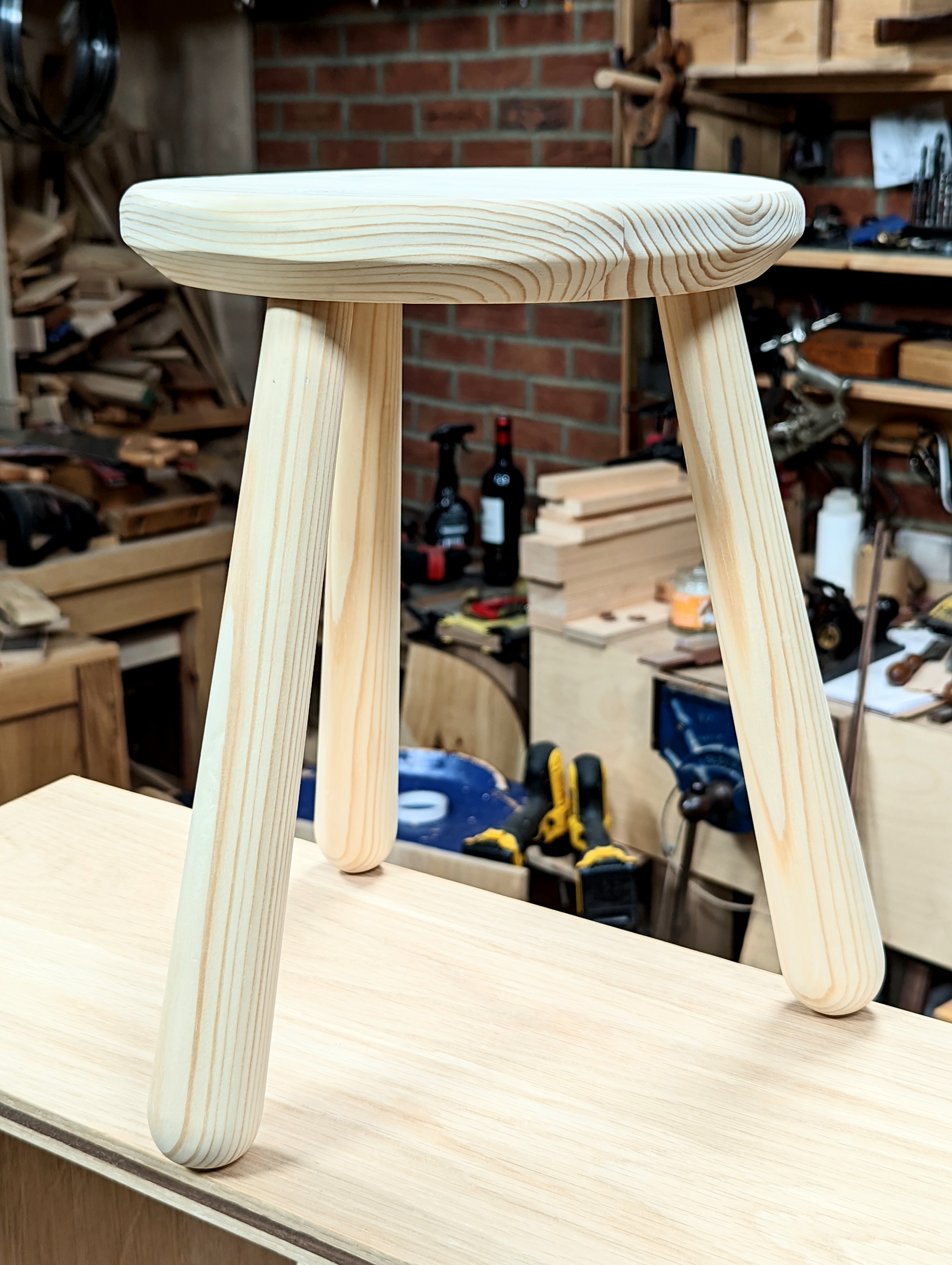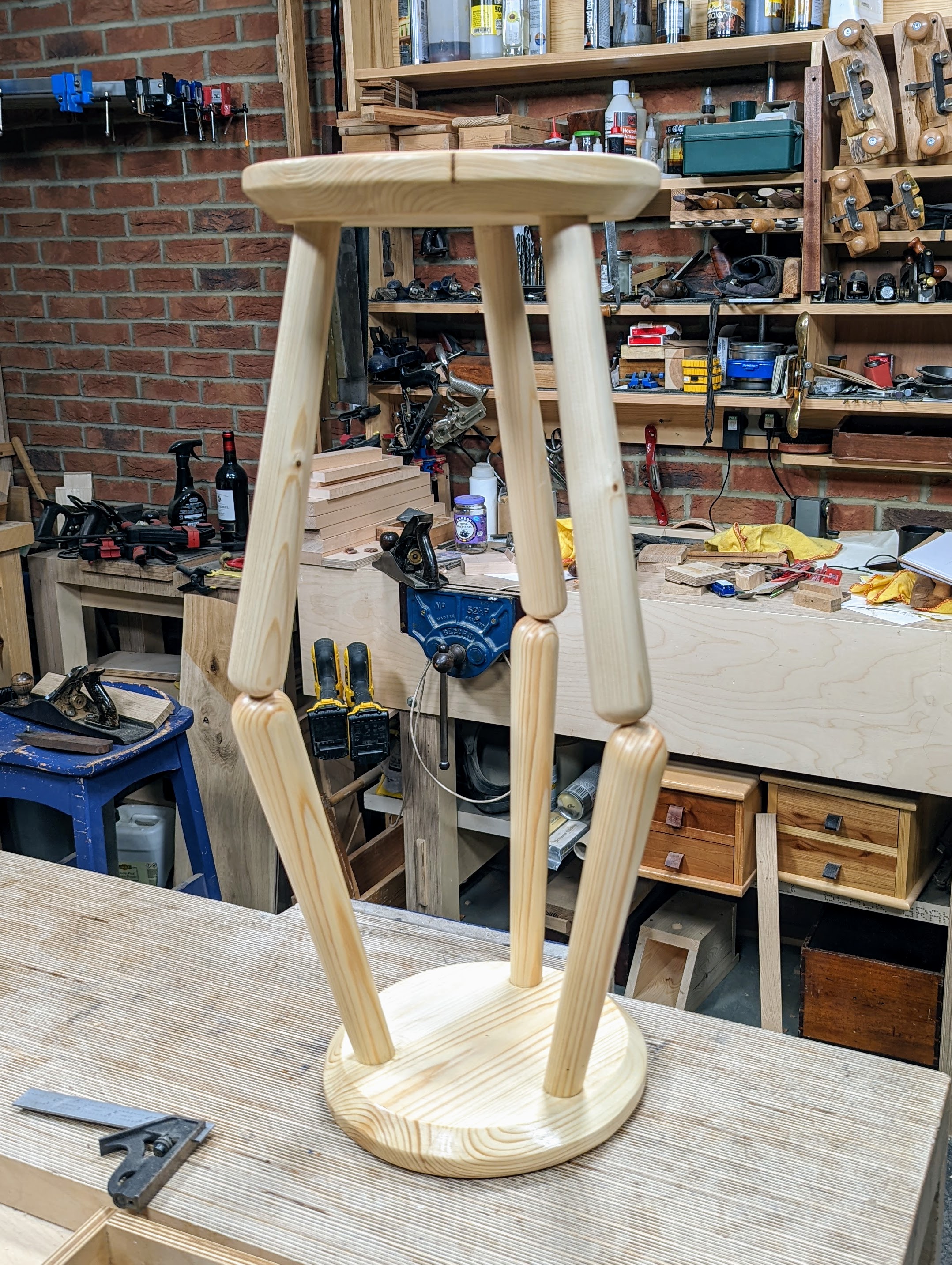 Mostly it's the know-how that makes handwork different to our expectations. While others might consider it dull, tedious, outdated and old-fashioned, we begin to see things differently. I personally see many things as being fast and efficient. The few hand tools I used to make square sticks tapered round and rounded are highly effective, unfalteringly ready for action. Beyond an occasional sharpening, they need nothing more than working hands, good arms and shoulders. It's never really about muscling and grunt work but mostly simple know-how strategy, body leverage, applying yourself and being responsive to what you feel transmitted through the tools from the wood. The saw takes care of the heavier removal of wood, the plane trues the tapers to the two sides and then creates the tapered octagon stroke on stroke by following straight pencil lines. In the final strokes, you end up with a chiliagon (a thousand-sided polygon) of narrow flats less than a millimetre wide. Already it feels as near as possible to round as you can get from purely flat faces. In hardwood, I would be but a few strokes away from perfected round and that without sanding, but even nearer am I were I to use a more bendable card scraper. This alone takes the arrises down to a perfect round in a matter of a few swift strokes, no more. On soft-grained woods like pine, card scrapers are less predictable because of the hard and soft aspect to the growth rings, but 150-grit abrasive creates a good surface and with only a few strokes too. Hard to imagine, but the round seat with its rounded top and bevelled underside comes with similar speed and the same way except I replaced the #4 plane with a spokeshave, still a plane type though. I added in a rasp and 10" flat mill file as two luxury but not truly essential extra tools.