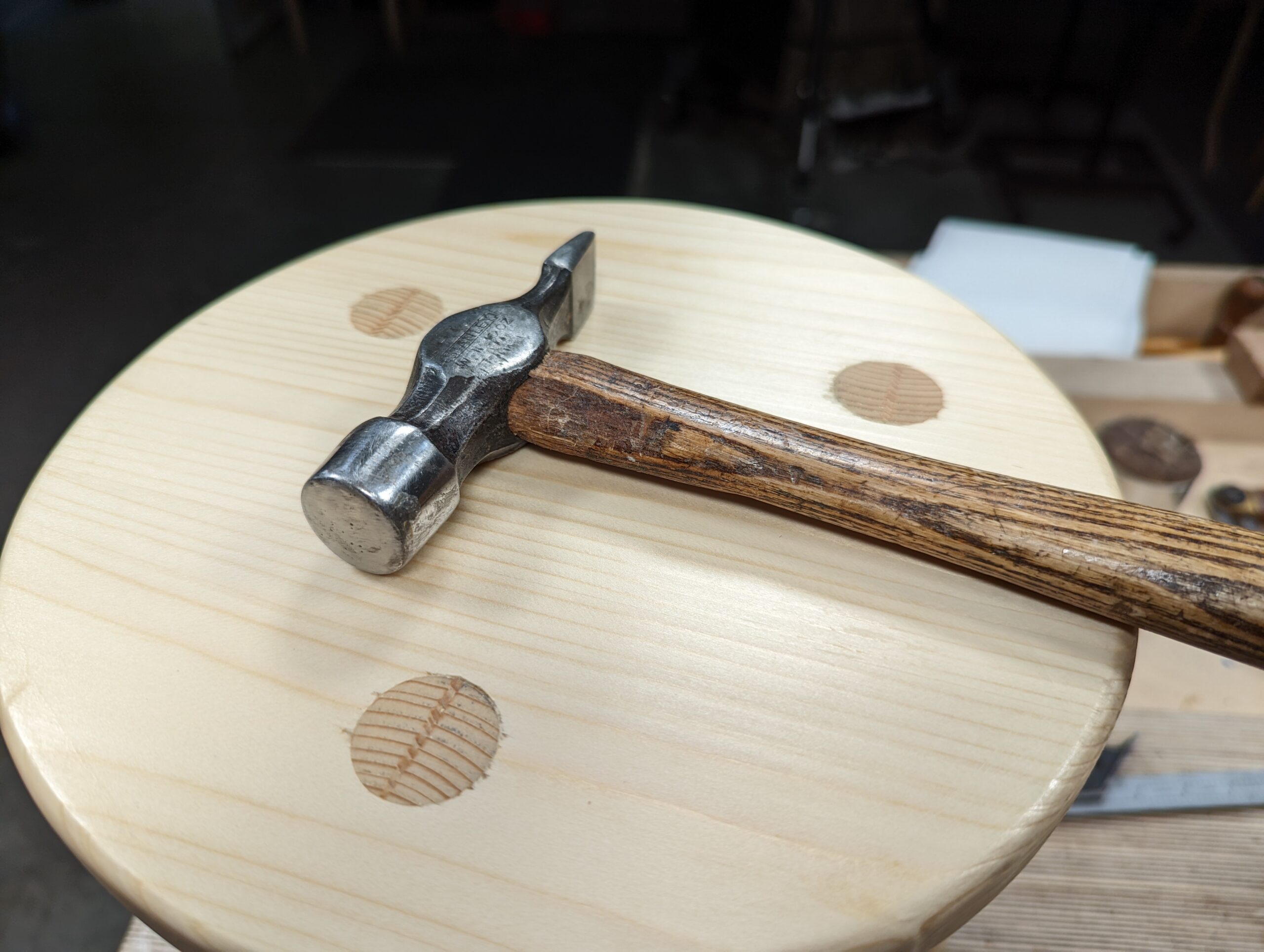 Mostly it's the know-how that makes handwork different to our expectations. While others might consider it dull, tedious, outdated and old-fashioned, we begin to see things differently. I personally see many things as being fast and efficient. The few hand tools I used to make square sticks tapered round and rounded are highly effective, unfalteringly ready for action. Beyond an occasional sharpening, they need nothing more than working hands, good arms and shoulders. It's never really about muscling and grunt work but mostly simple know-how strategy, body leverage, applying yourself and being responsive to what you feel transmitted through the tools from the wood. The saw takes care of the heavier removal of wood, the plane trues the tapers to the two sides and then creates the tapered octagon stroke on stroke by following straight pencil lines. In the final strokes, you end up with a chiliagon (a thousand-sided polygon) of narrow flats less than a millimetre wide. Already it feels as near as possible to round as you can get from purely flat faces. In hardwood, I would be but a few strokes away from perfected round and that without sanding, but even nearer am I were I to use a more bendable card scraper. This alone takes the arrises down to a perfect round in a matter of a few swift strokes, no more. On soft-grained woods like pine, card scrapers are less predictable because of the hard and soft aspect to the growth rings, but 150-grit abrasive creates a good surface and with only a few strokes too. Hard to imagine, but the round seat with its rounded top and bevelled underside comes with similar speed and the same way except I replaced the #4 plane with a spokeshave, still a plane type though. I added in a rasp and 10" flat mill file as two luxury but not truly essential extra tools.