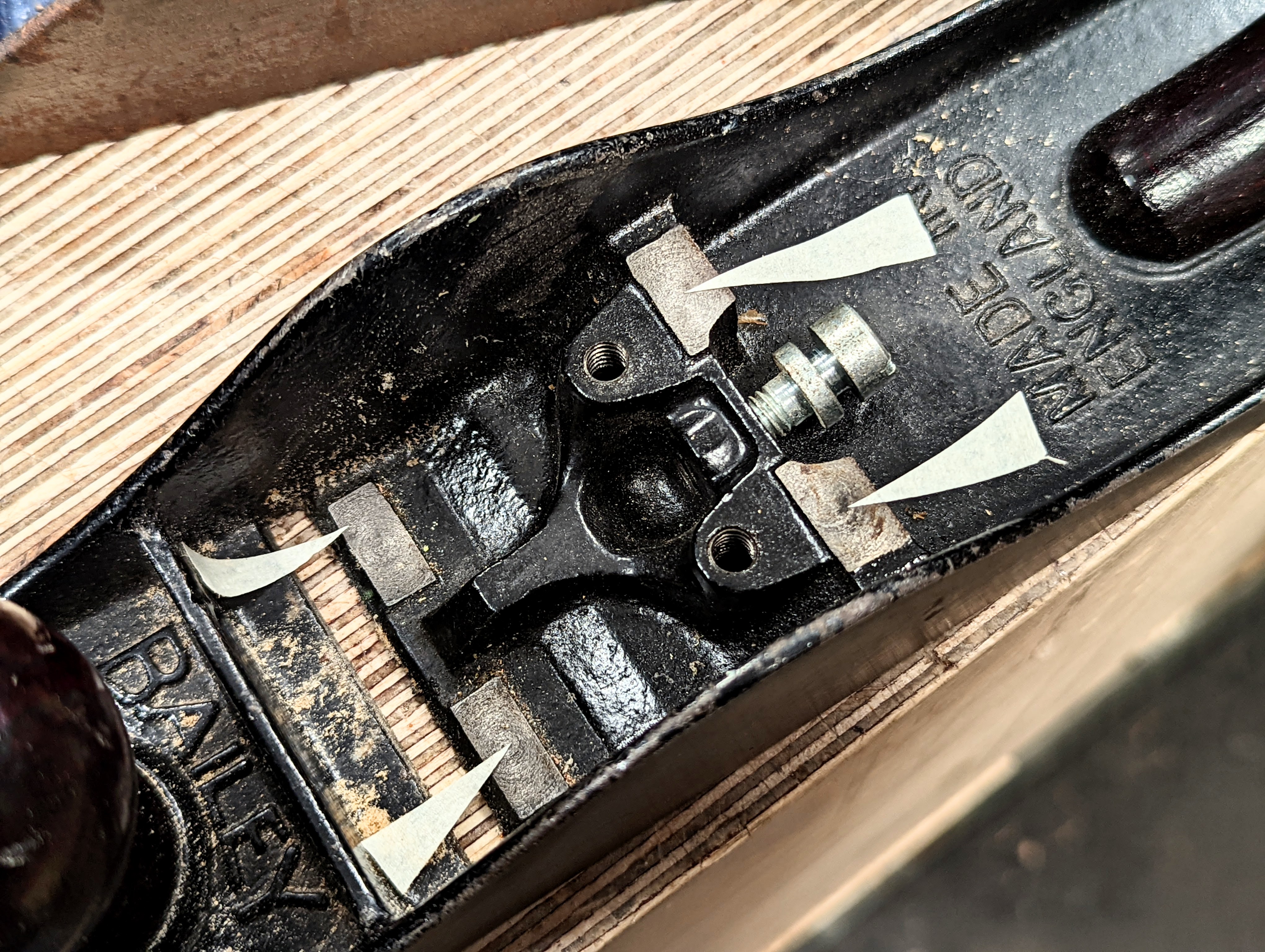 These points of contact can vary in precision and quality but generally, I have found them to be good and in need of no refining. That said, they can be readily refined if needed. If, however, there is any variance in these levels, tightening them down is not the answer as this can flex the sole into a twist which therefore will twist the outcome of your plane work. It is not likely that this will happen. I only saw it once in hundreds of planes. A quick file with a mill file, abrasive or diamond hone readily takes one or the other down, and any rocking will be easily detected.
