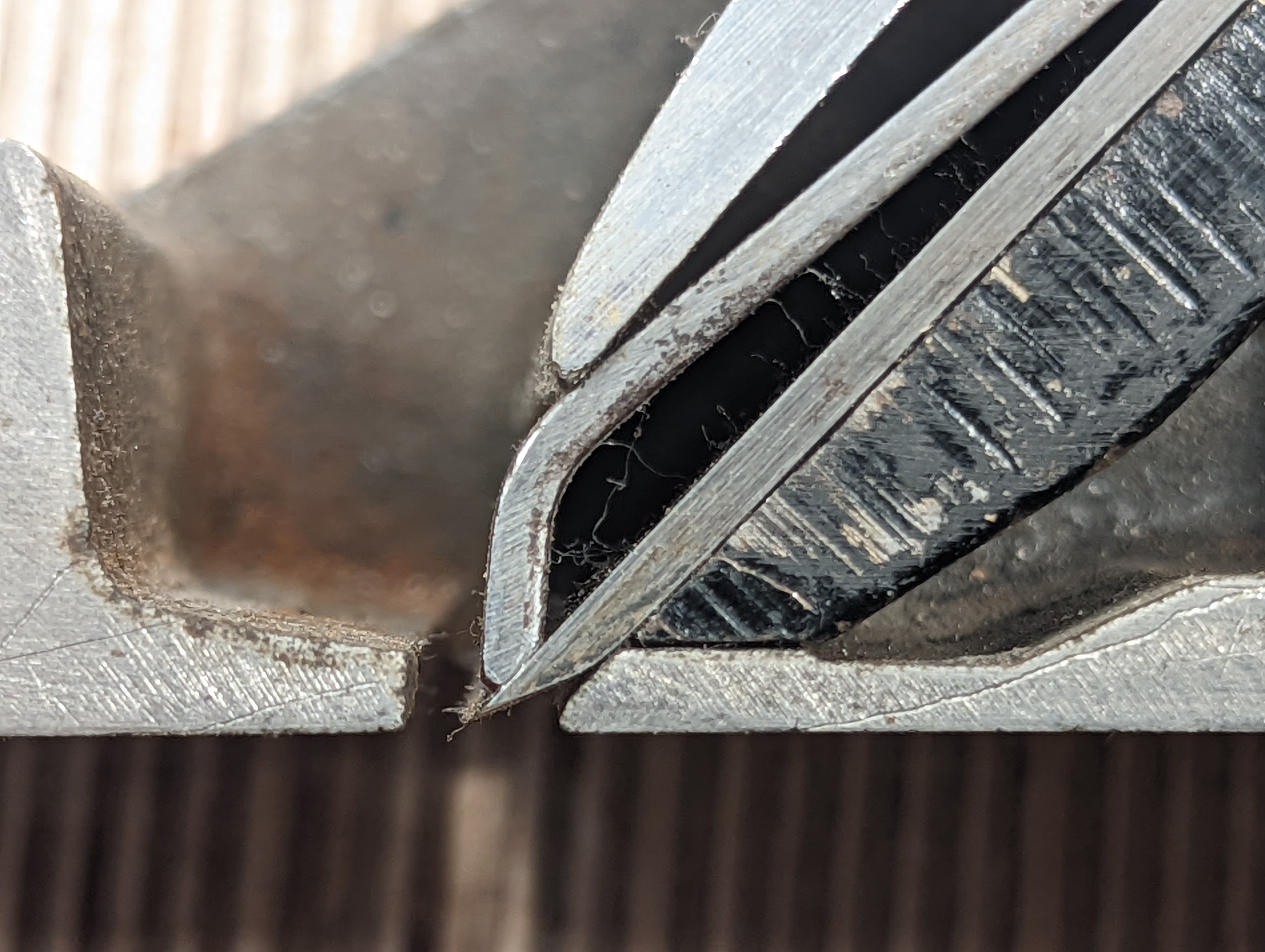 Turning the centre setscrew that shunts the frog up or down its inclined platform on the insides of the soles of any and all BedRock planes one full revolution from the zero point, the point of taking the most minutely thin shaving off the wood, closes down the mouth opening from about 2mm to somewhere close to give or take 1mm. It's a small but necessary gap, not much of an opening at all, but one you might go to to tackle something really wild and difficult on a special hardwood you needed for something you are making. But here is the real issue. The depth of cut achieved by any turn large or small to close down the throat some also markedly alters the depth of cut and takes the blade down through the throat of the sole by about as deep as you can set the plane depth to using the wheel depth adjuster. In other words, the cutter will not take a shaving so much as gouge deeply into the wood and most likely scar it irreparably as shown above. The chief and significant point in this is that this change always happens and cannot not happen. On standard Leonard Bailey pattern planes, on the other hand, this never happens with changing the position of the frog on the much-dissed Bailey-pattern plane because it cannot happen. Why? The frog is set paraplanar to the face of the sole on two levels but without any incline so moving the frog backwards and forward is a parallel motion along fixed-height points.