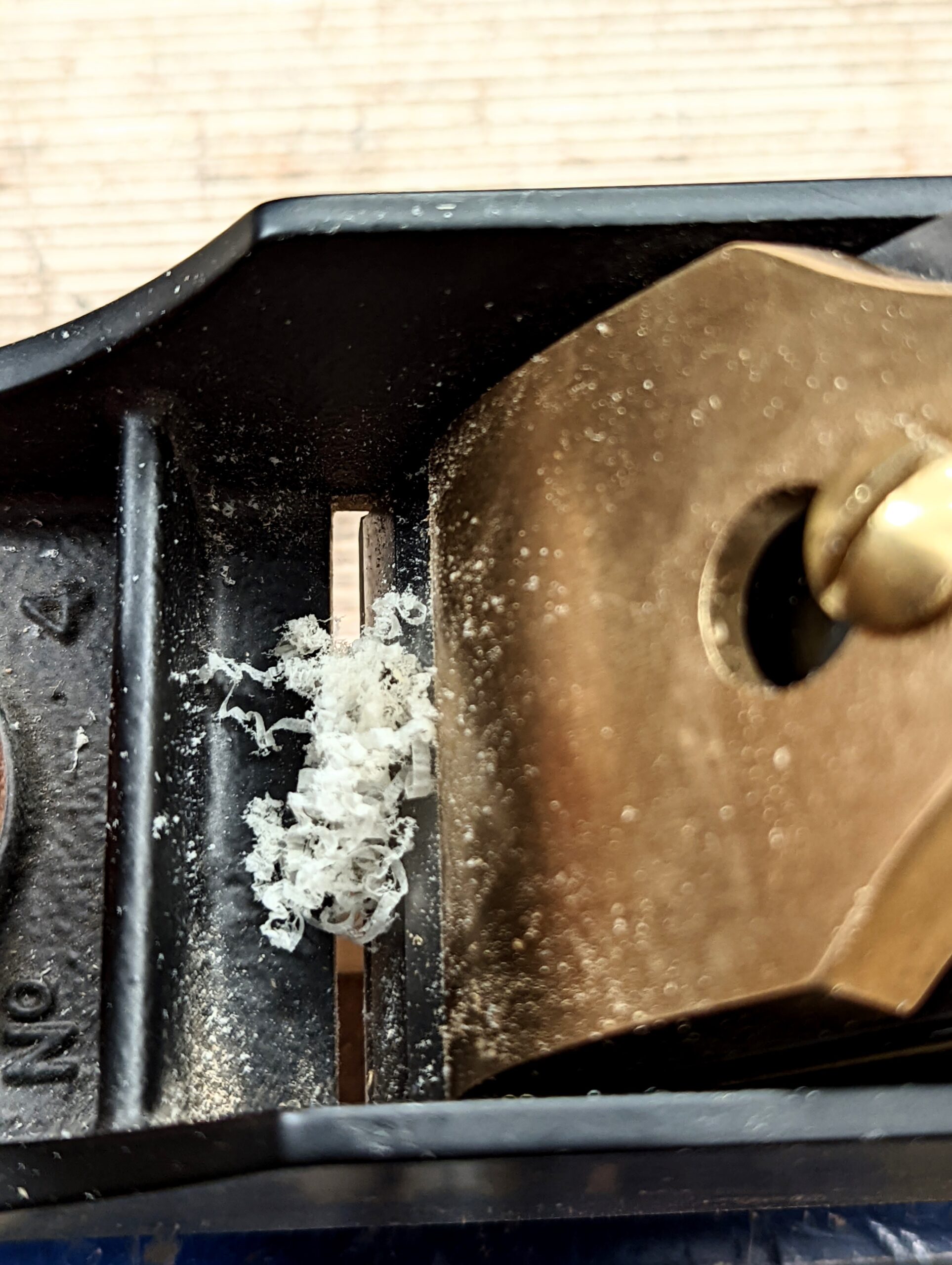 Taking the plane with its frog shunted forward to close down the throat from zero-thickness shaving both narrows down the throat opening but at the same time, in tandem and unintentionally, automatically changes the depth of cut to a massive .62mm -- so thick the shaving is not a shaving but a staggered fractured coil that then leaves a skudded surface like you have never seen before. This means the supposed benefit the BedRock plane pattern might possibly offer is sorely negated by having to majorly adjust the depth of cut to a safe level. Even in experienced hands, this is no minor inconvenience to anyone planing wood.
